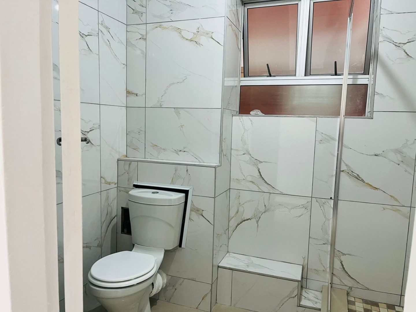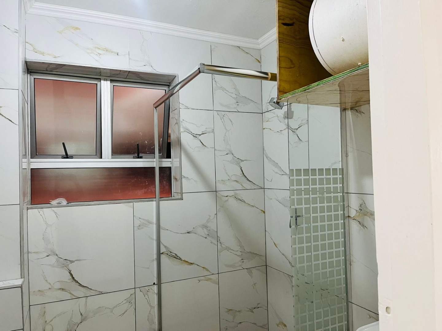 The bathroom has been fully renovated and includes a new shower with glass enclosure, a new basin, and a newly installed toilet, all finished with a clean, contemporary look.