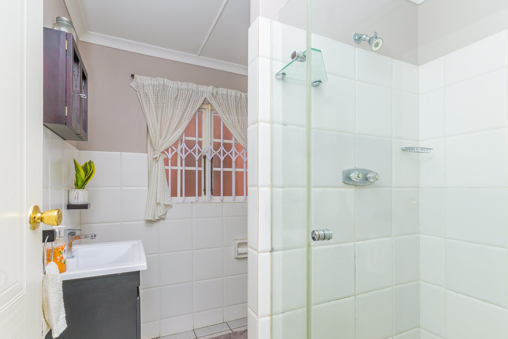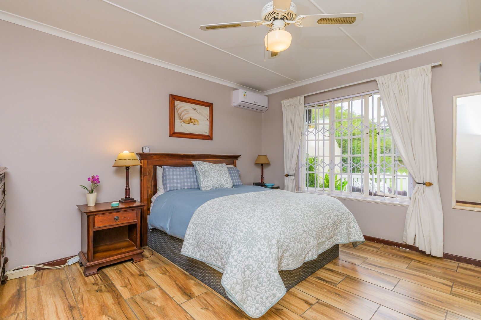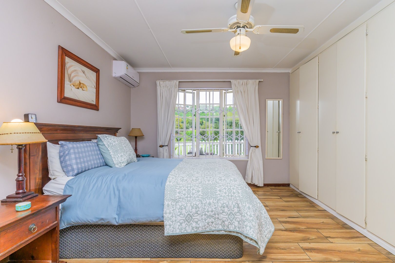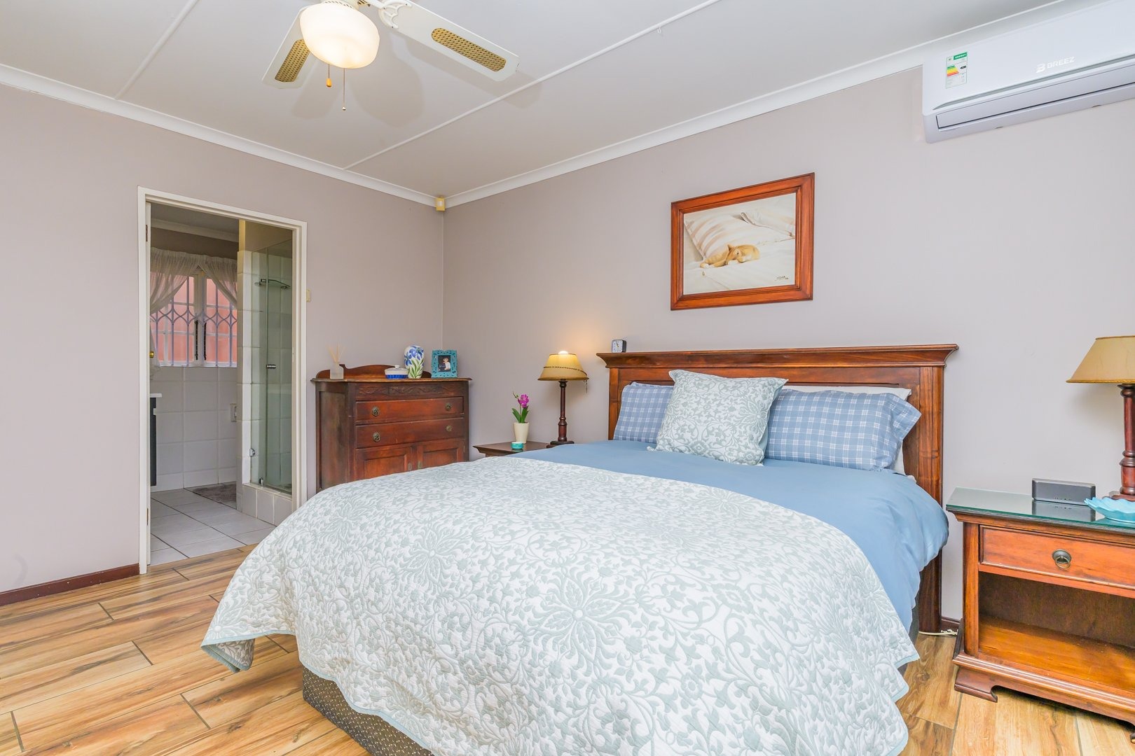 Down the passage are three spacious bedrooms all fitted with built-in cupboards and ceiling fans, two of the bedrooms boast air conditioners. The family bathroom offers a bath, while the light and airy main bedroom boasts ample cupboard space and an en-suite bathroom with a shower.