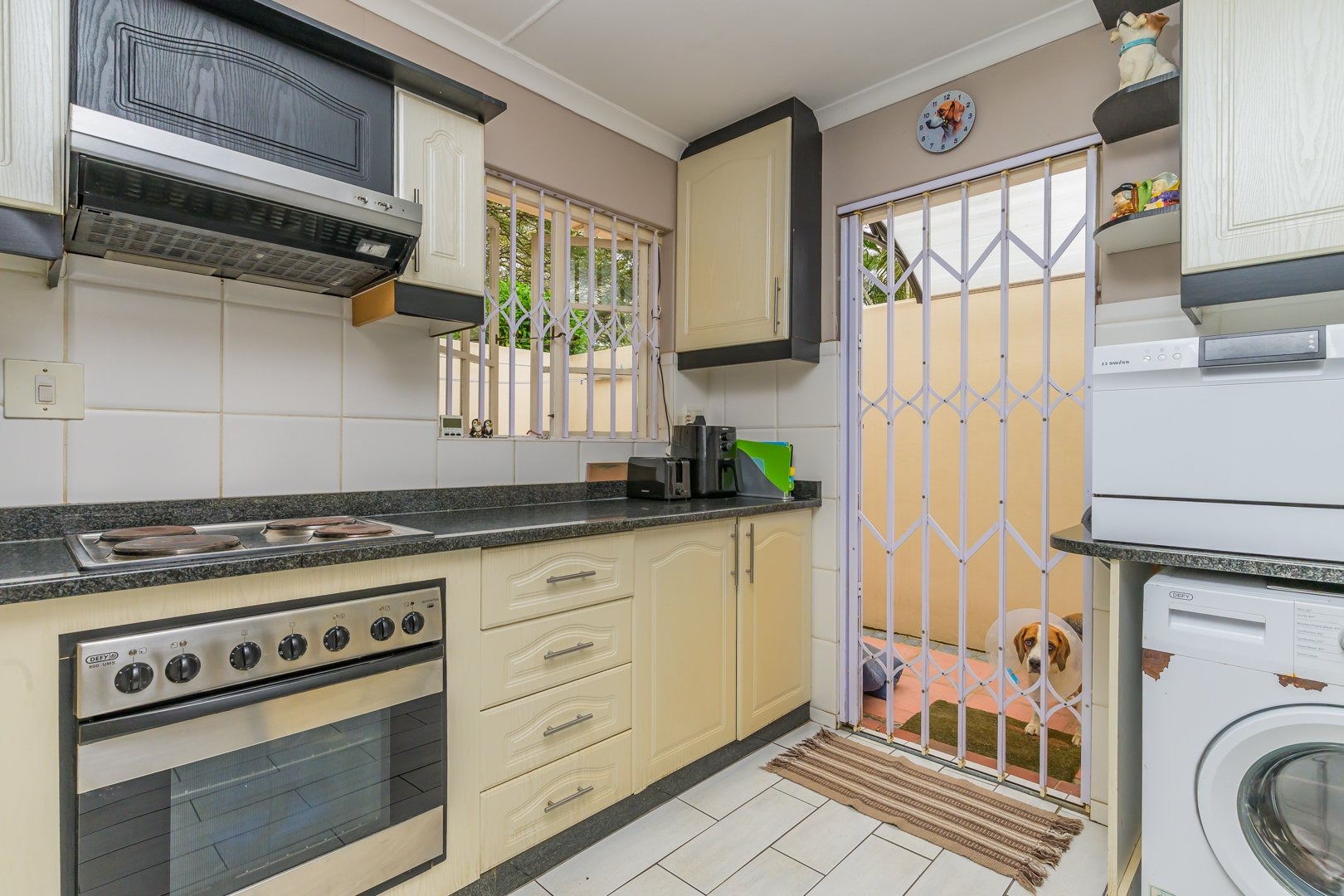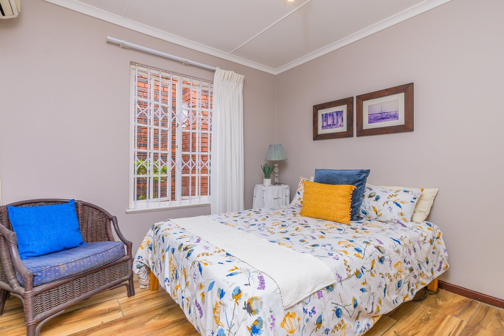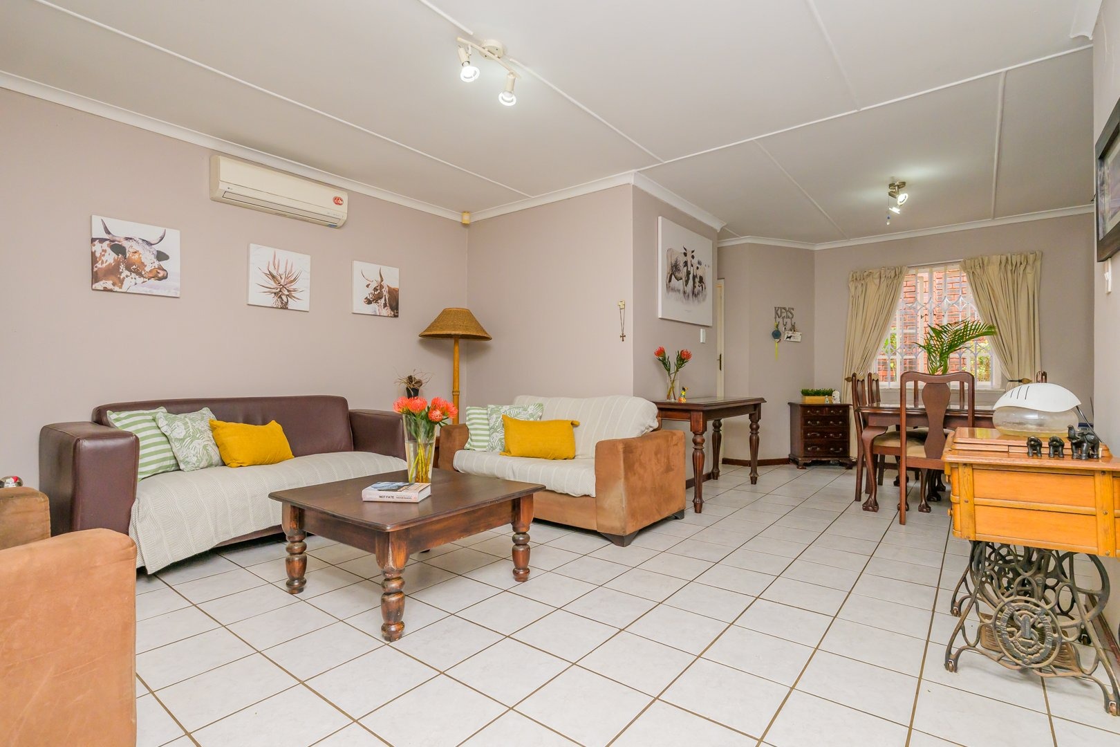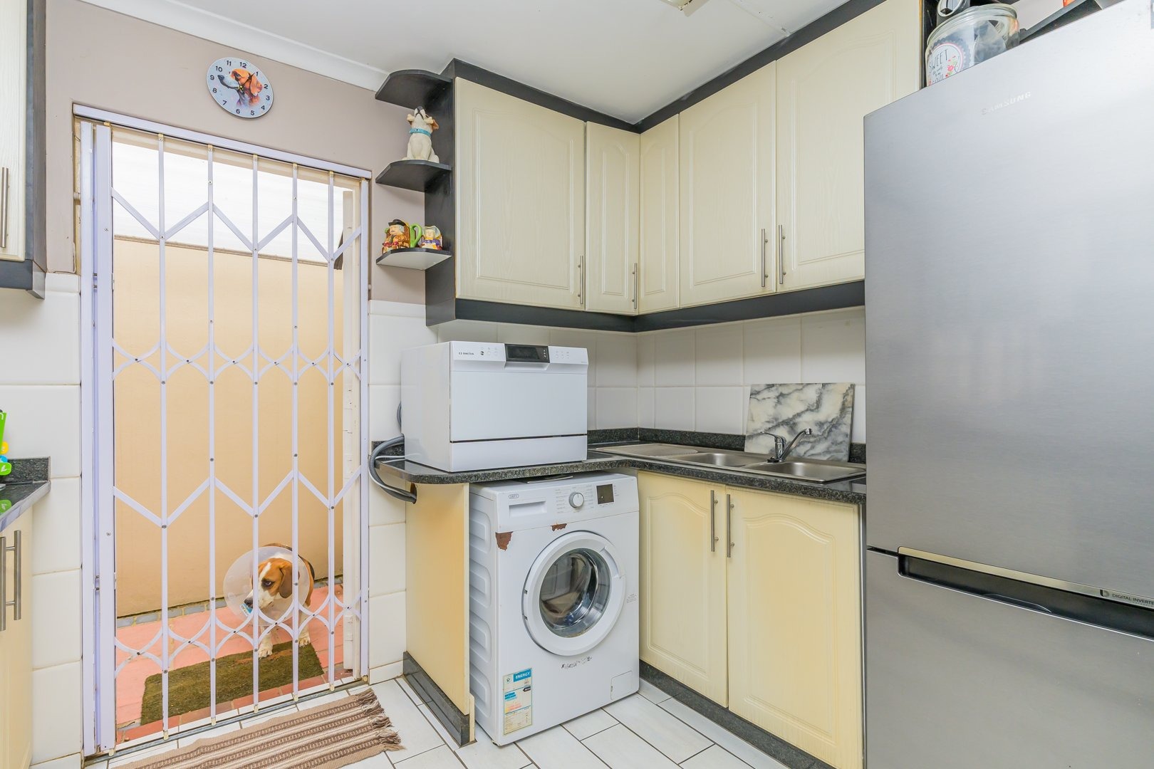 Step inside and be greeted by an inviting, air-conditioned, tiled open-plan lounge and dining area that opens into a well-appointed kitchen featuring an oven, stove, and plumbing for a washing machine. The kitchen opens out to a neatly tucked-away private courtyard with a wash line area, ideal for convenience and practicality.