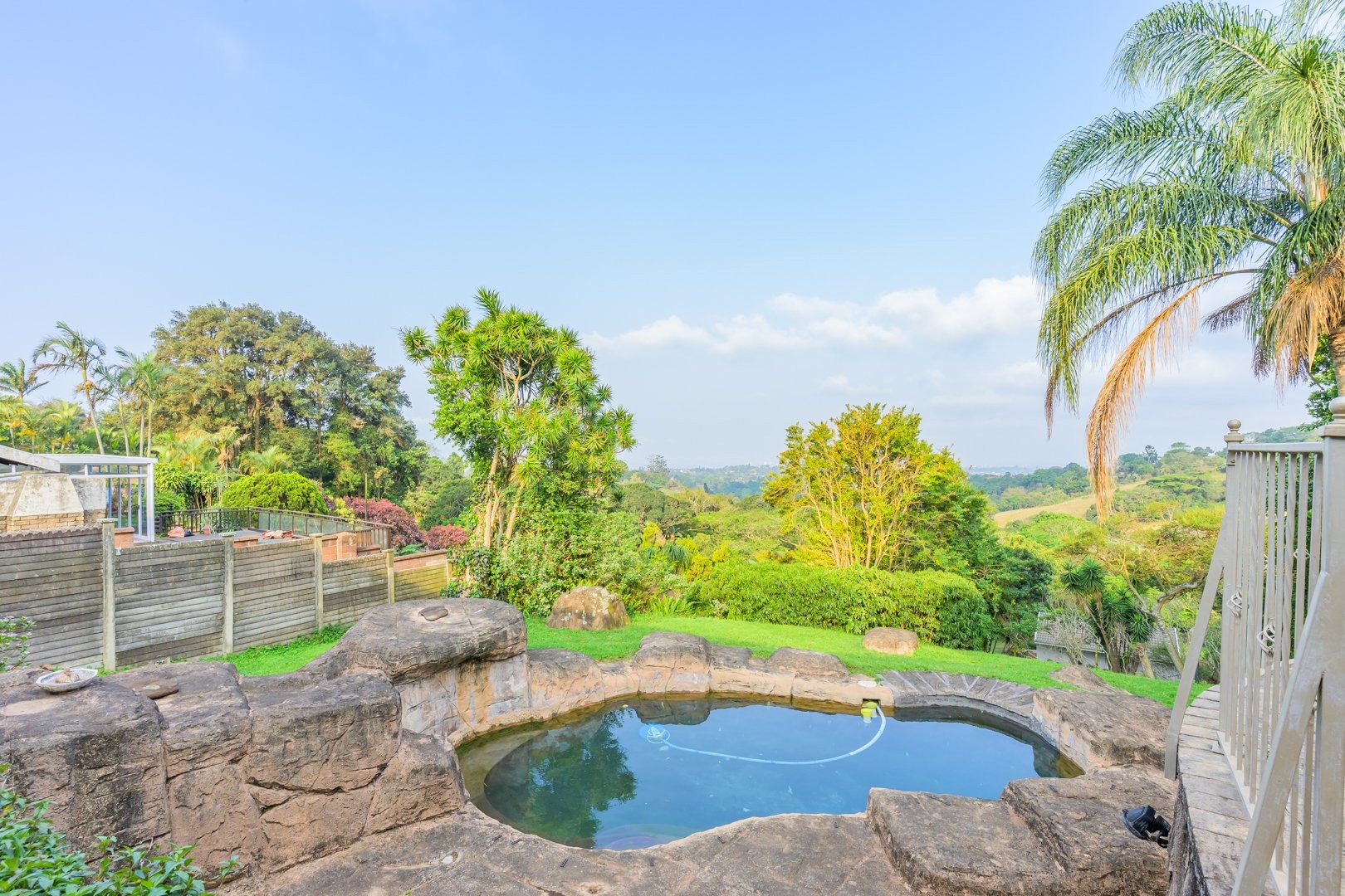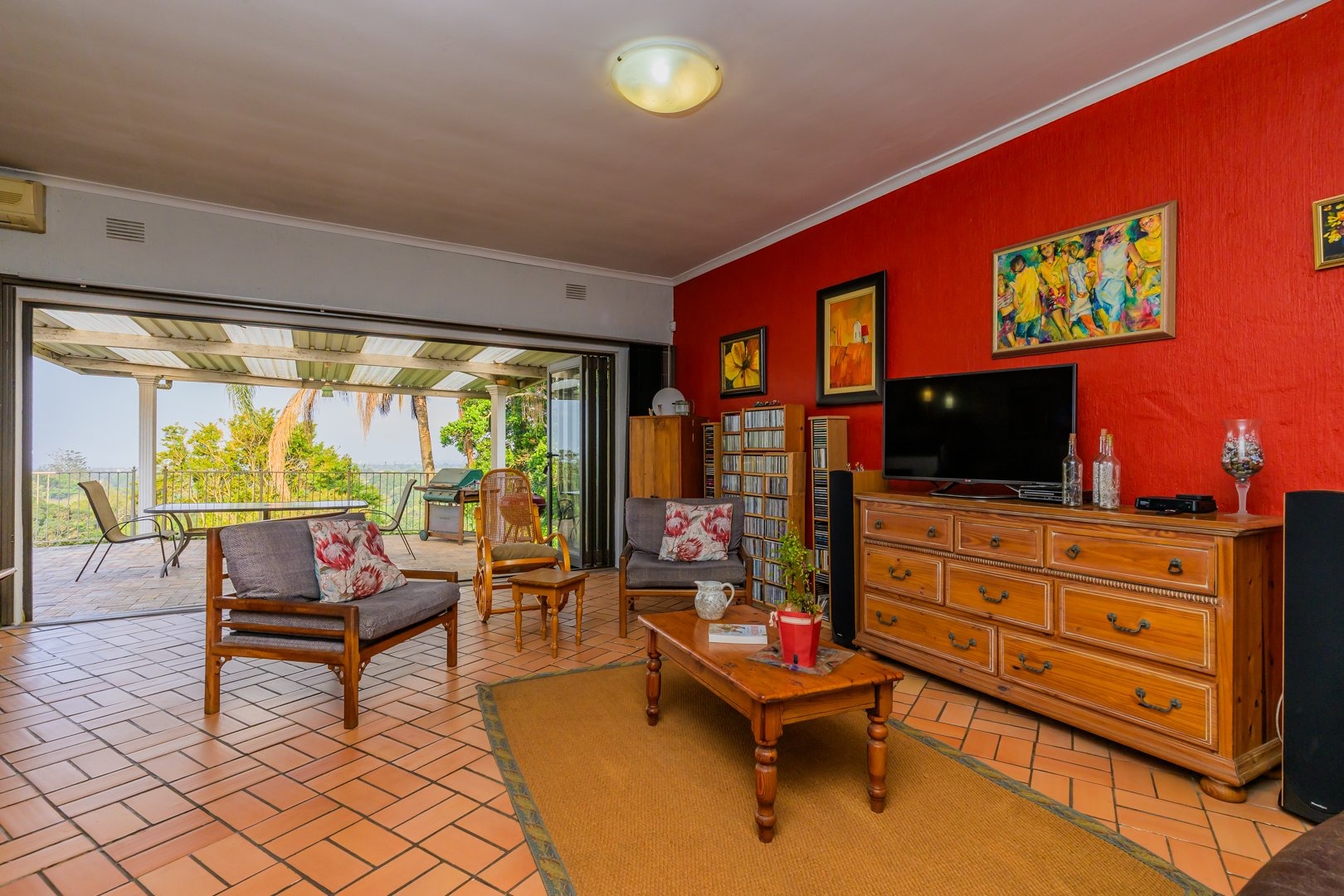 The spacious tiled lounge with air conditioning opens via stack-back doors to a covered entertainment area overlooking a rock pool and beautiful sea views.