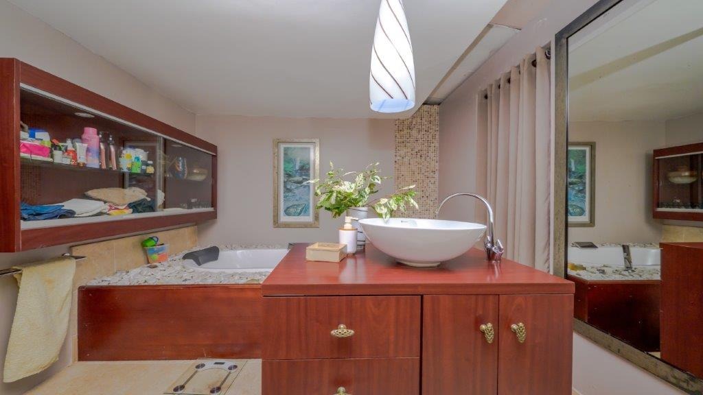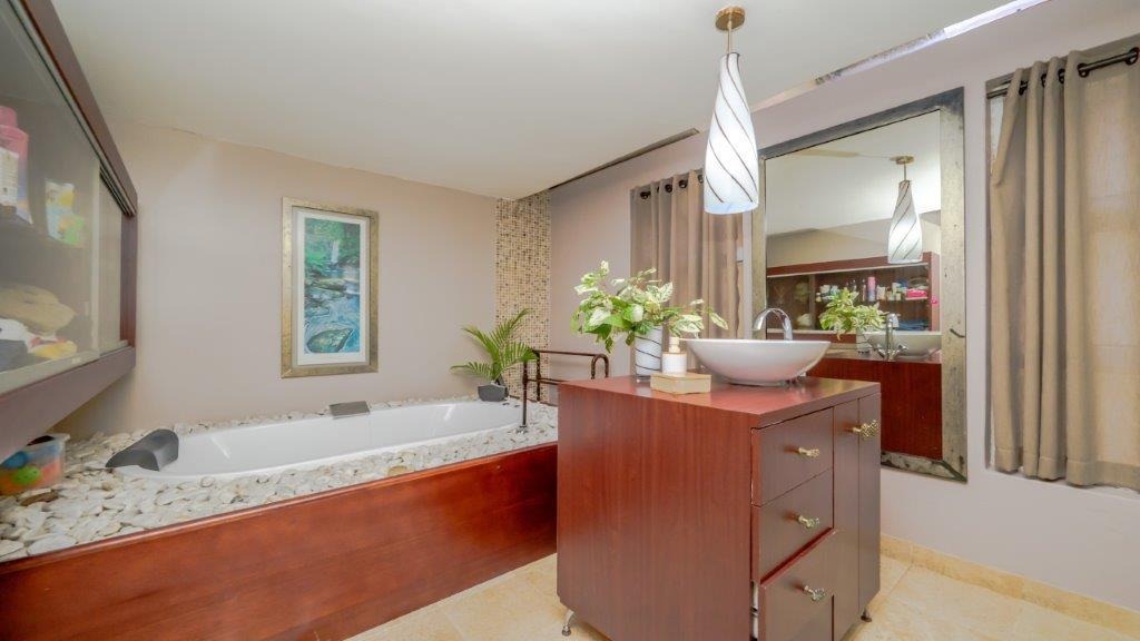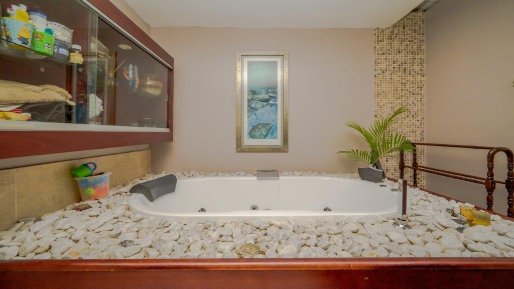 Luxurious master bathroom with jacuzzi, island vanity, walk-in shower & mosaic finishes