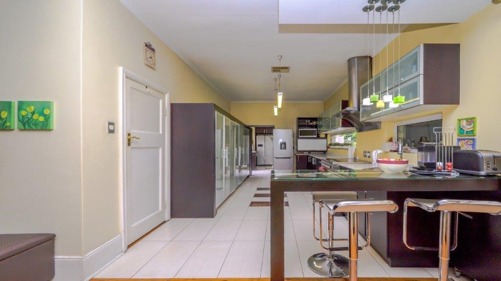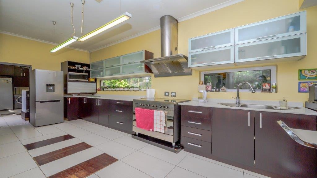 Open-plan kitchen with gas stove, ambient lighting, movable inlaid table & separate scullery