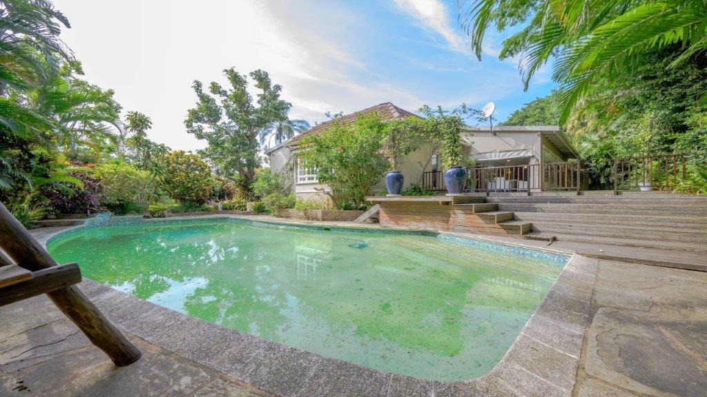 TV entertainment area with roll-up blinds, elegant wallpaper & seamless flow to deck and pool — an Entertainer’s Dream