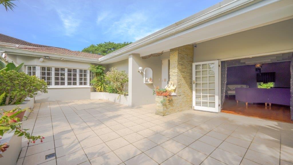 Sunken lounge with bay windows and spacious dining area opening onto a patio