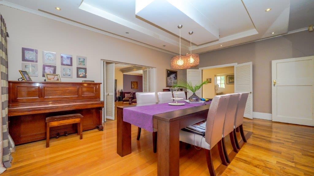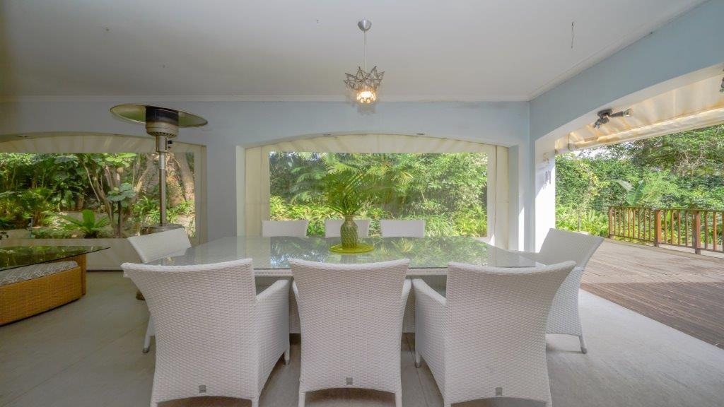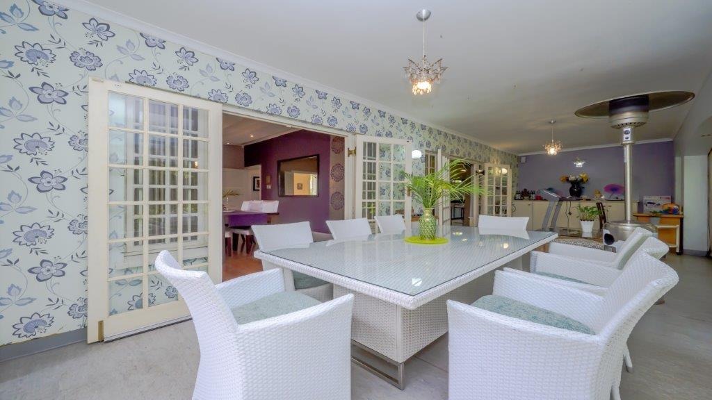 Sunken lounge with bay windows and spacious dining area opening onto a patio
