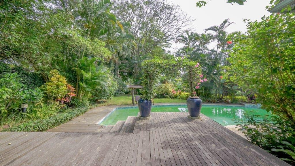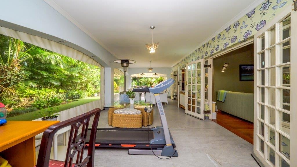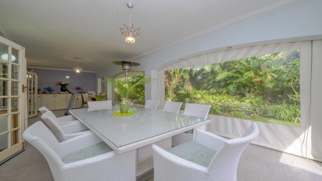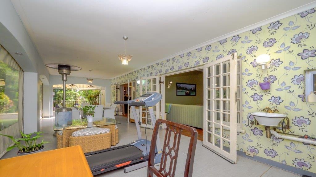 TV entertainment area with roll-up blinds, elegant wallpaper & seamless flow to deck and pool — an Entertainer’s Dream
