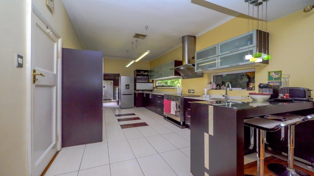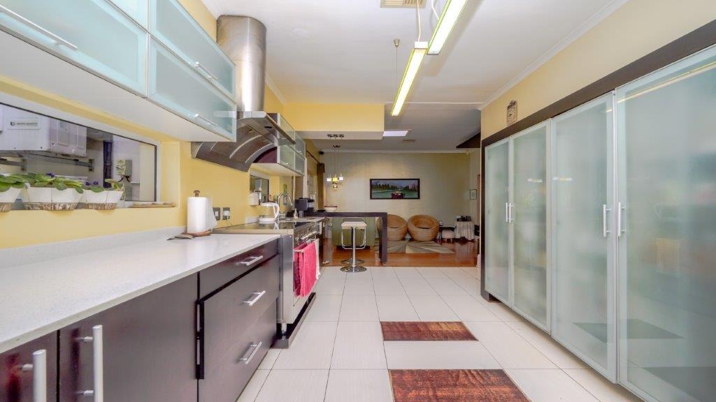 Open-plan kitchen with gas stove, ambient lighting, movable inlaid table & separate scullery