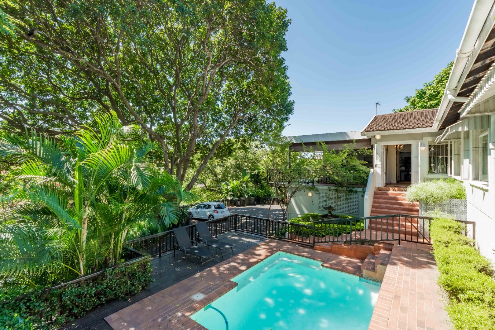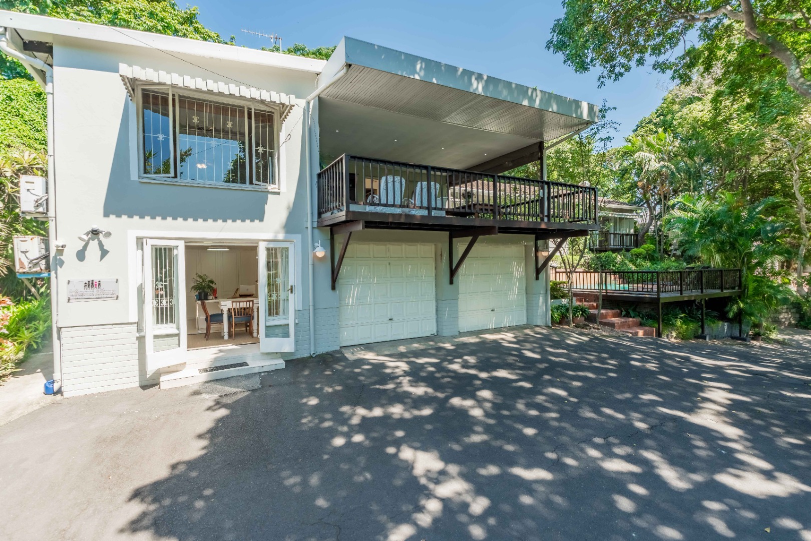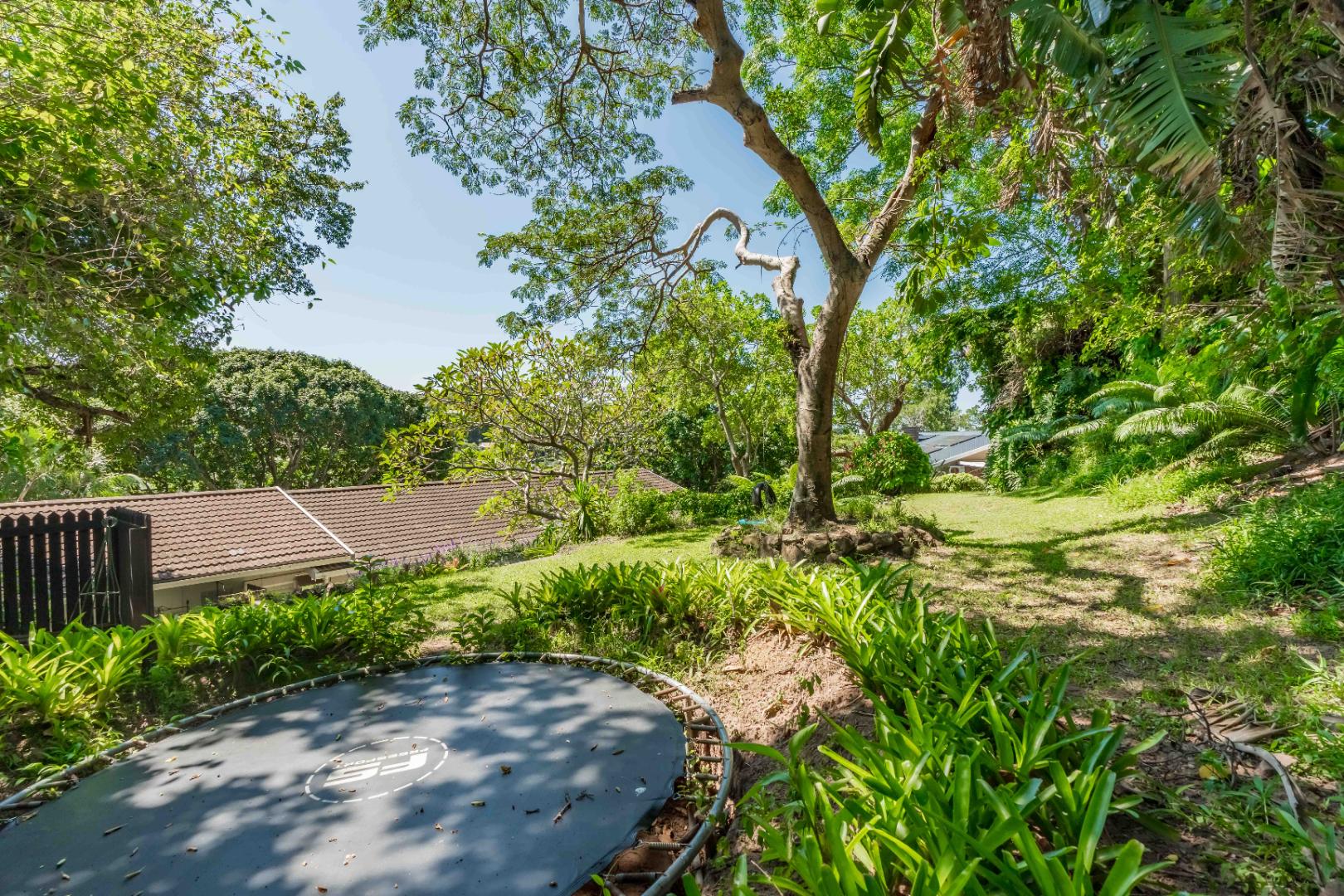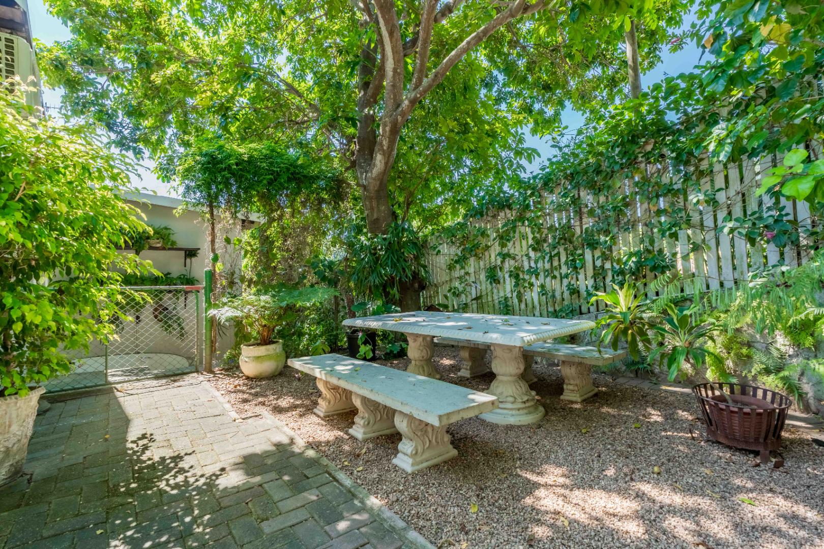 The park-like garden and wide entertainment terrace provide a serene outdoor setting framed by unique local trees and lively birdlife—perfect for morning coffee or relaxed weekends.