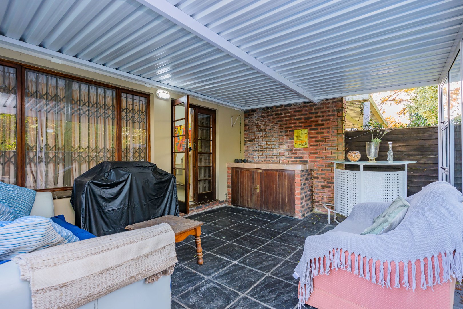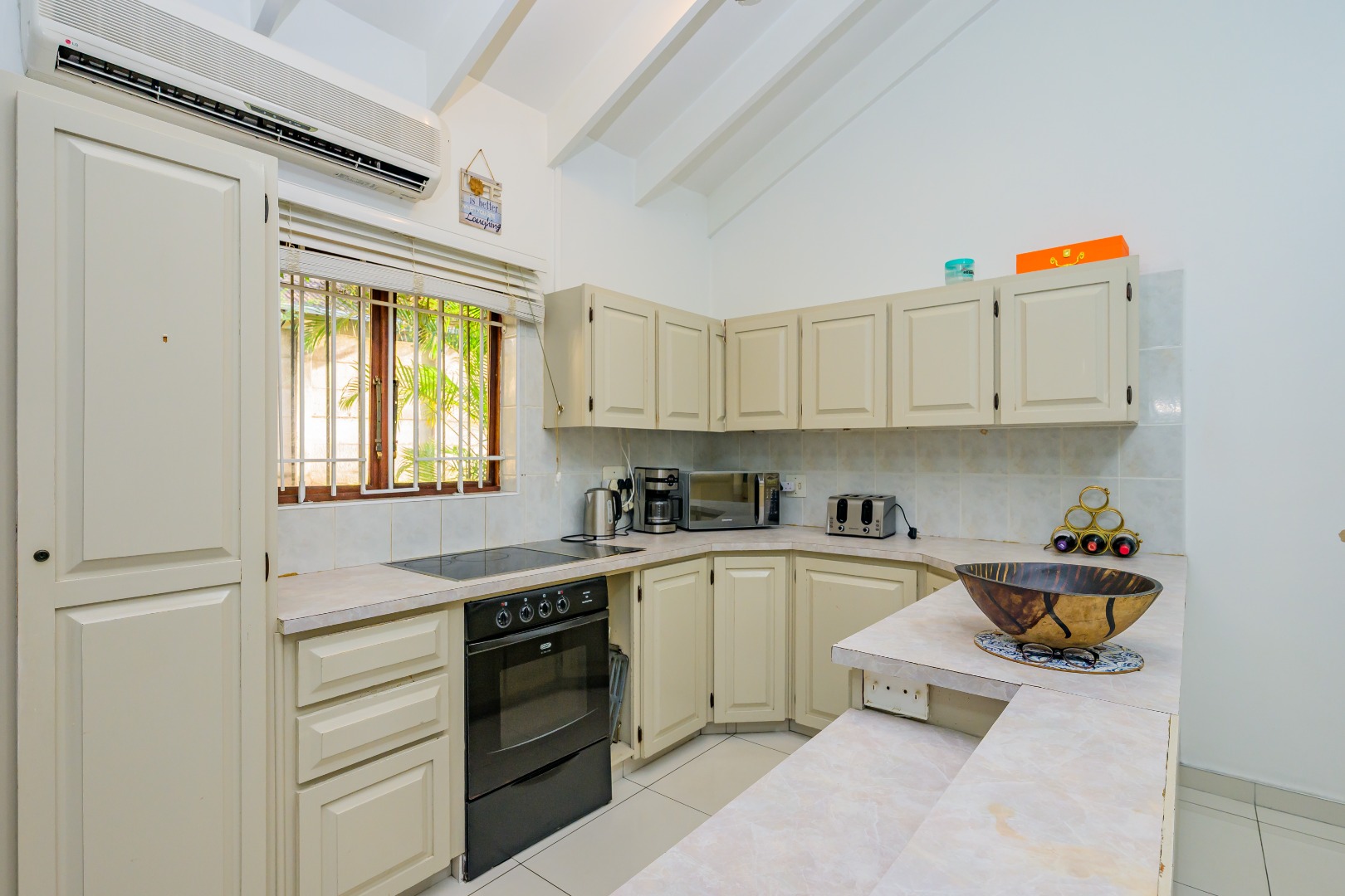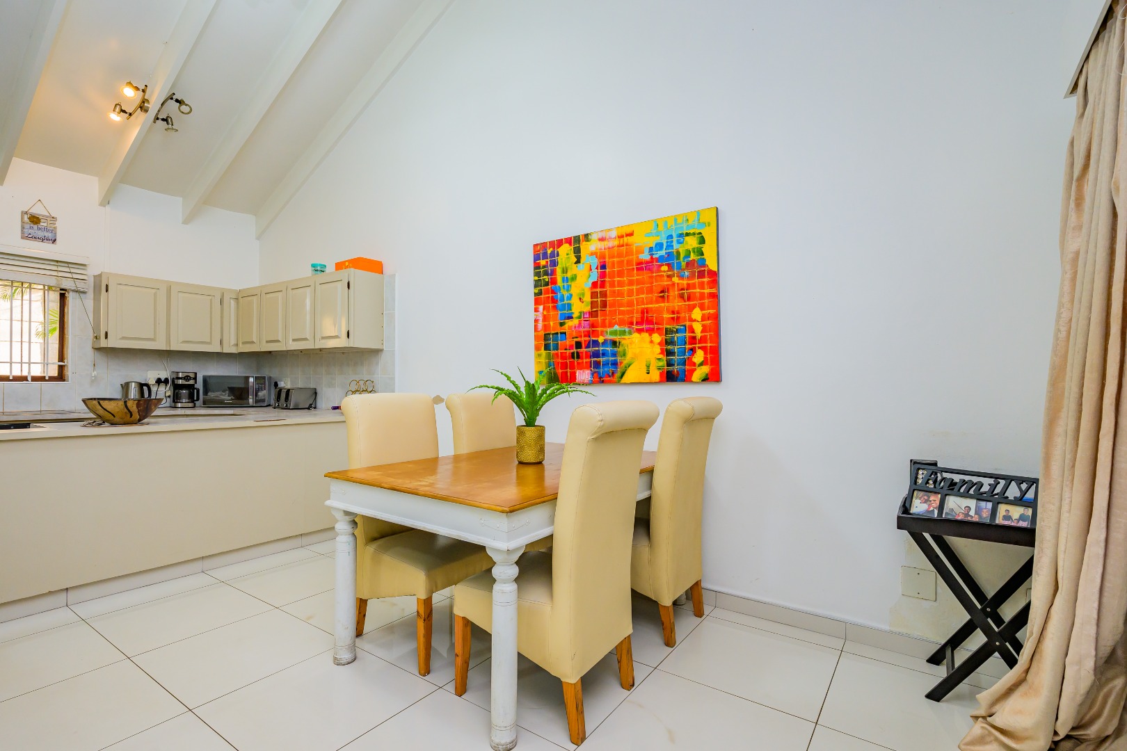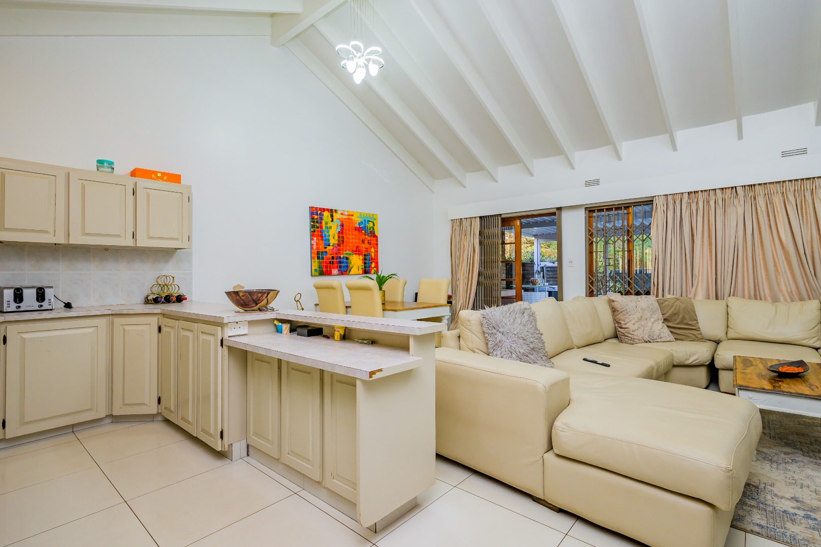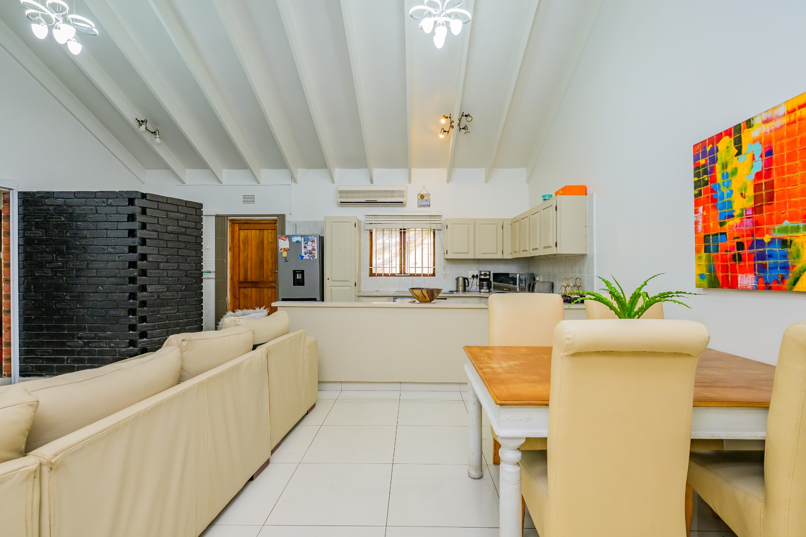 This property offers a seamless blend of comfort and style with its open-plan design, featuring a lounge, dining room, and kitchen complete with a convenient scullery, which opens out into an enclosed court yard. The interiors boast a modern aesthetic with two air-conditioning units to keep you cool throughout, and it's tiled throughout for easy maintenance.