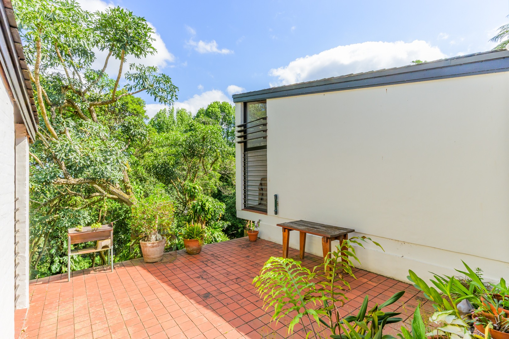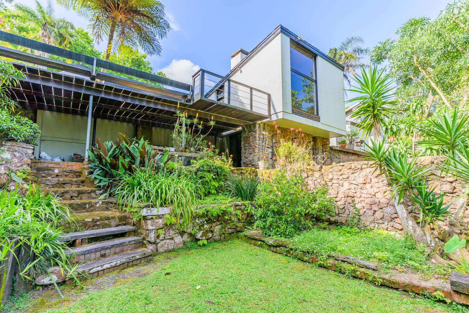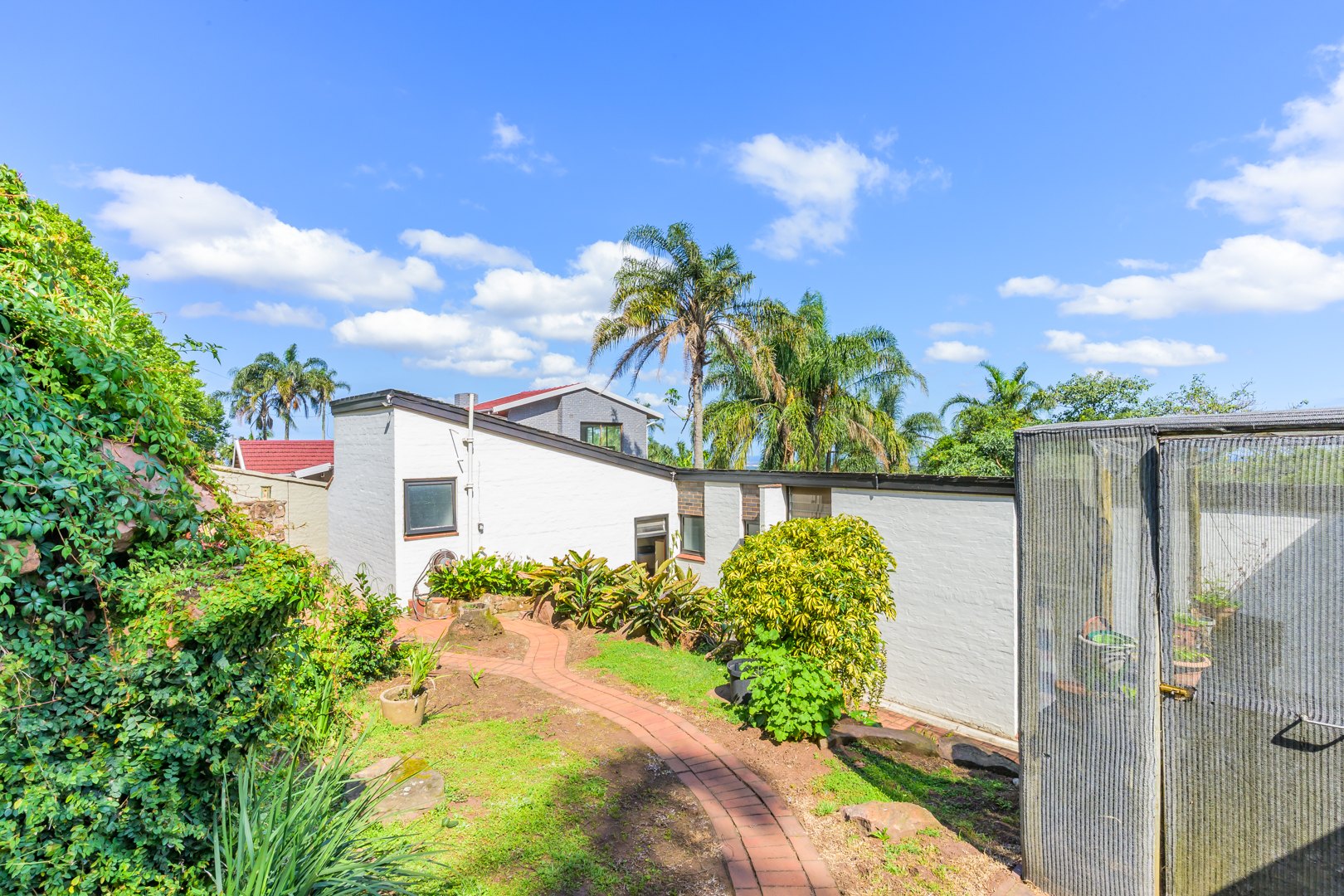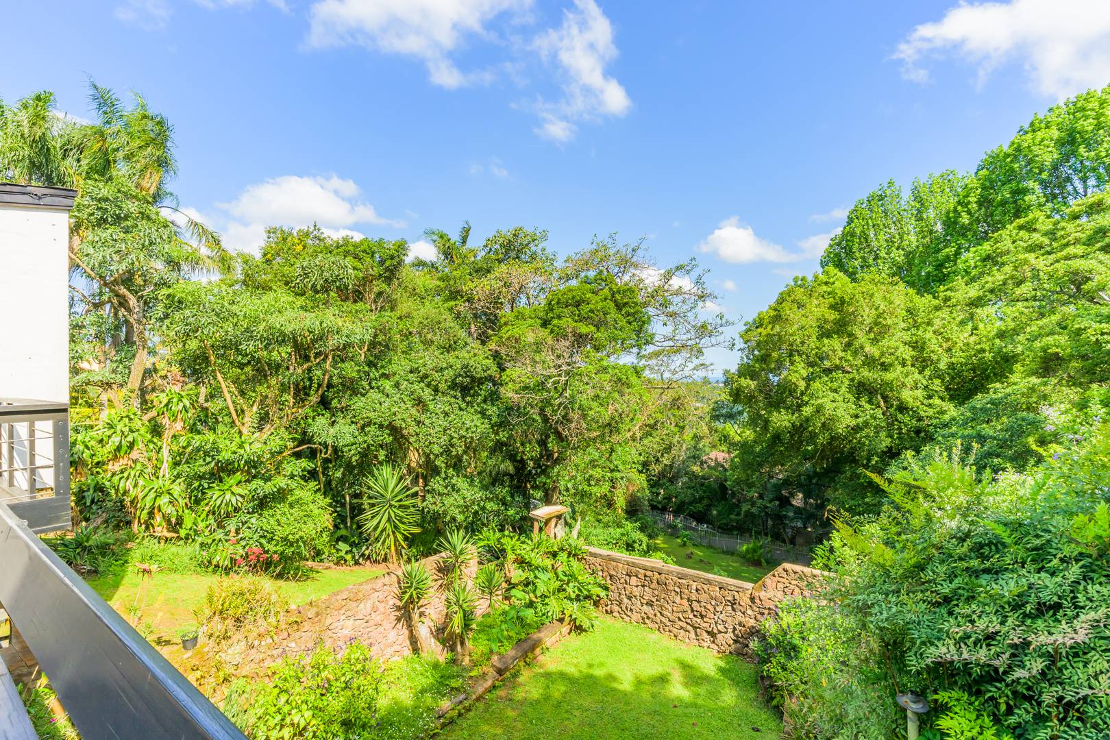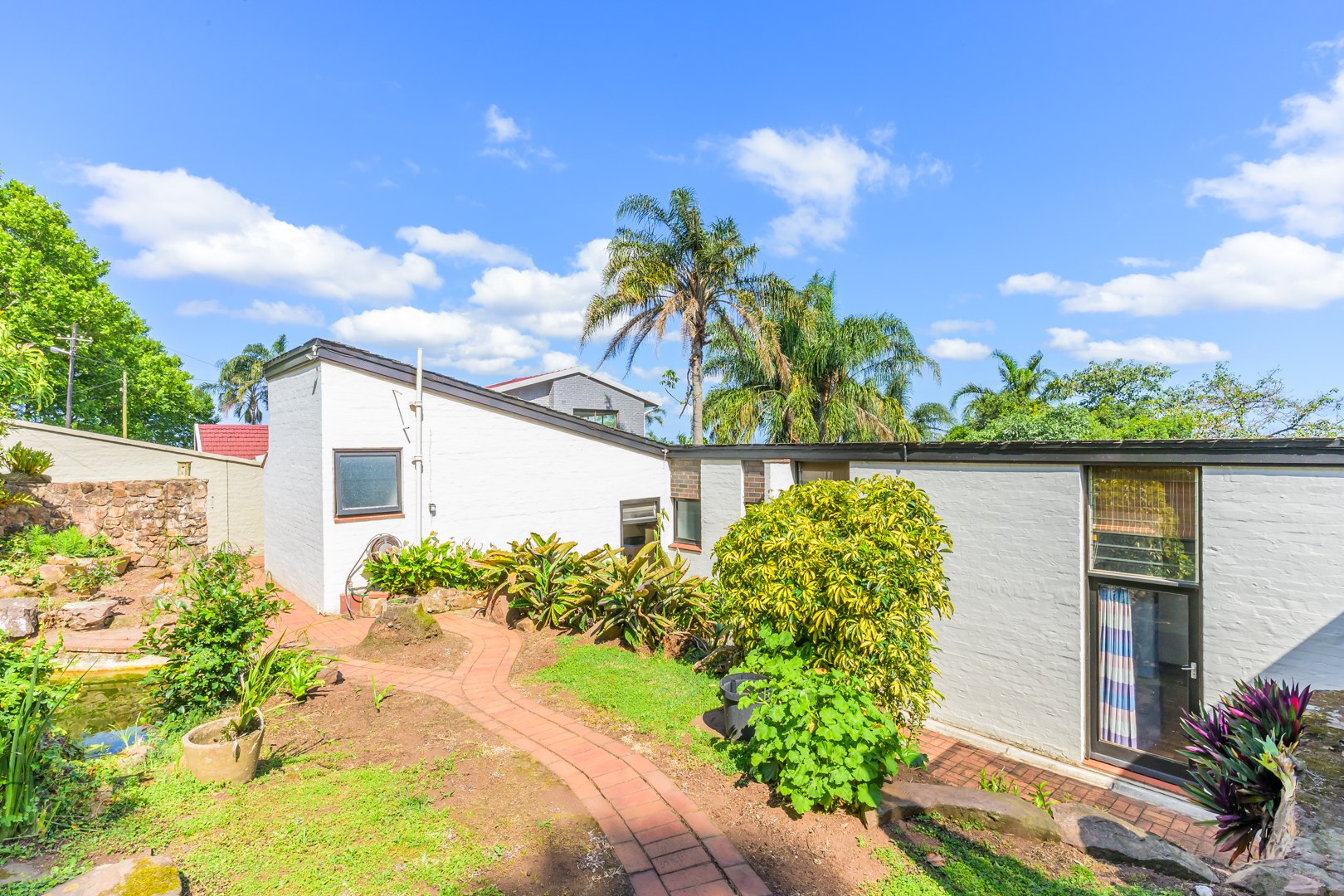 Discover this charming 3-bedroom residence nestled in the desirable suburb of Cowies Hill, Pinetown, South Africa. This home presents a striking modern architectural design, characterized by clean white walls, dark accents, and varied rooflines, creating an impressive kerb appeal. The exterior is complemented by lush, mature tropical landscaping, well-maintained lawns, and inviting brick pathways, leading to a serene outdoor pond and water feature. The interior boasts spacious living areas designed for comfort and natural light. The lounge features a distinctive exposed wooden beam ceiling, hardwood floors, and large windows that frame picturesque green views, creating an airy and inviting atmosphere. A built-in TV niche offers a streamlined entertainment setup, while sliding doors enhance the indoor-outdoor flow. The property also includes a dedicated study, perfect for remote work or a quiet retreat. The bright dining area continues the theme of natural light and warmth, with an exposed wooden beam and planked ceiling, terracotta-style flooring, and expansive glass windows that connect seamlessly with the surrounding greenery. The home offers three comfortable bedrooms and one well-appointed bathroom, alongside a convenient guest toilet. A functional kitchen and ample storage further enhance daily living. Outdoor living is a highlight, with an expansive wooden deck and a private patio providing ideal spaces for relaxation and entertaining amidst the beautiful garden. The property is totally walled for privacy and includes an access gate and burglar bars for enhanced security. Additional practical features include staff quarters and two dedicated parking spaces, with pets being allowed. This home offers a blend of character and functionality in a sought-after location. Key Features: * 3 Bedrooms, 1 Bathroom * Spacious Lounge with Wooden Beam Ceiling * Dedicated Study * Expansive Wooden Deck and Patio * Lush Tropical Garden with Water Feature * 2 Parking Spaces * Staff Quarters * Access Gate and Burglar Bars * Pets Allowed