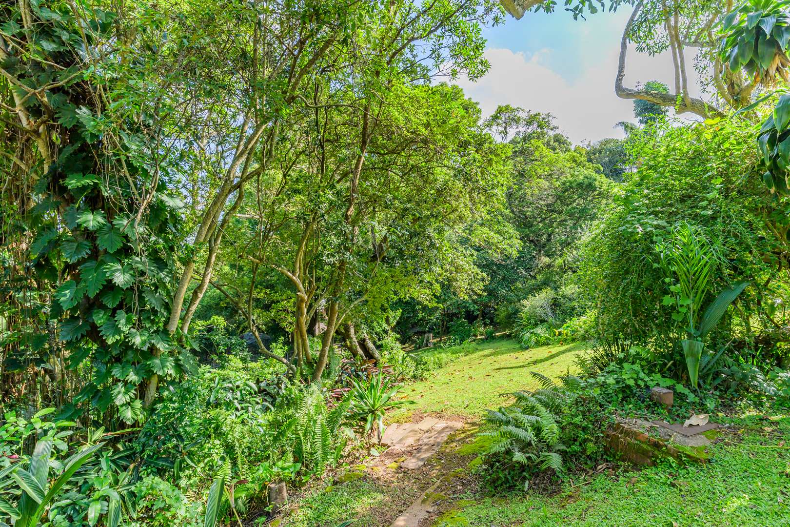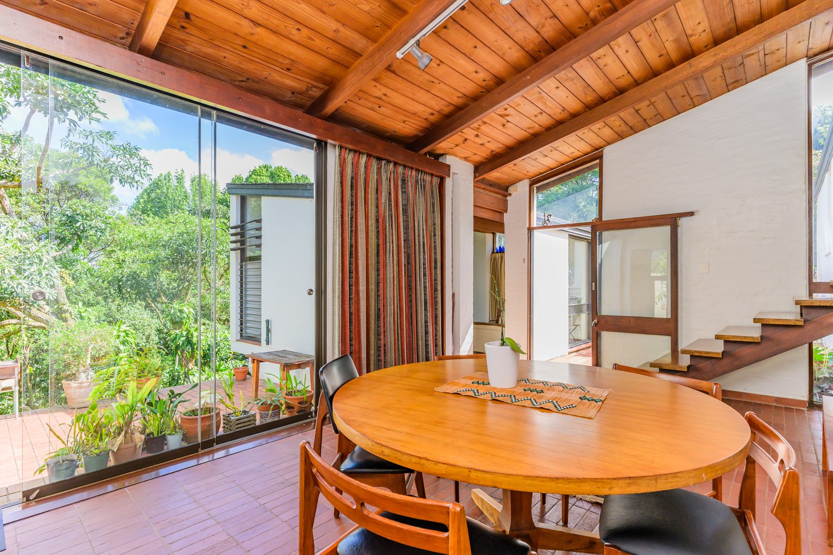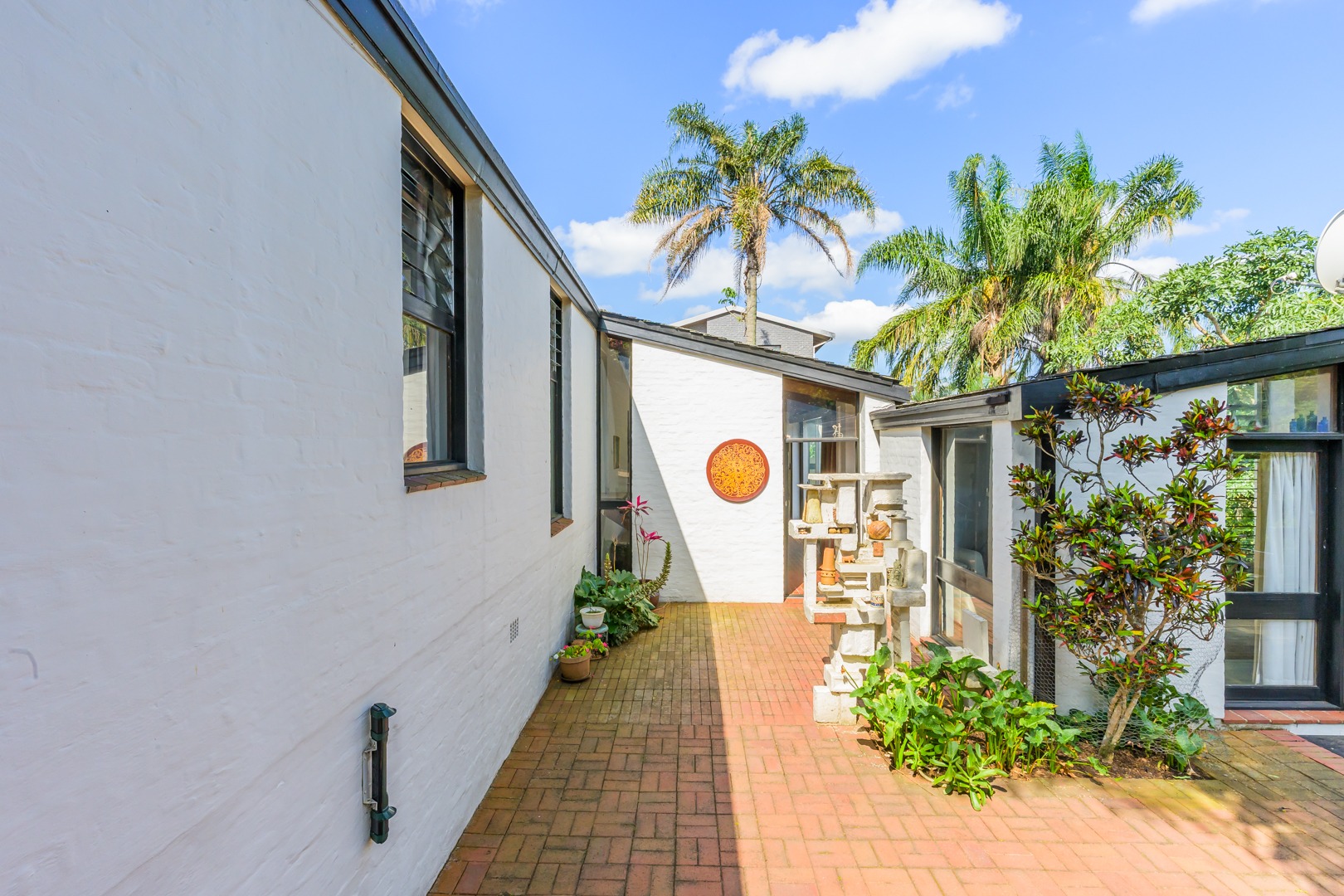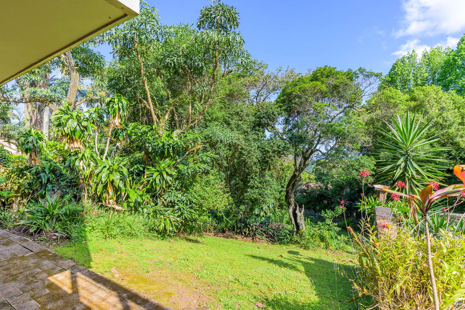 Discover this charming 3-bedroom residence nestled in the desirable suburb of Cowies Hill, Pinetown, South Africa. This home presents a striking modern architectural design, characterized by clean white walls, dark accents, and varied rooflines, creating an impressive kerb appeal. The exterior is complemented by lush, mature tropical landscaping, well-maintained lawns, and inviting brick pathways, leading to a serene outdoor pond and water feature. The interior boasts spacious living areas designed for comfort and natural light. The lounge features a distinctive exposed wooden beam ceiling, hardwood floors, and large windows that frame picturesque green views, creating an airy and inviting atmosphere. A built-in TV niche offers a streamlined entertainment setup, while sliding doors enhance the indoor-outdoor flow. The property also includes a dedicated study, perfect for remote work or a quiet retreat. The bright dining area continues the theme of natural light and warmth, with an exposed wooden beam and planked ceiling, terracotta-style flooring, and expansive glass windows that connect seamlessly with the surrounding greenery. The home offers three comfortable bedrooms and one well-appointed bathroom, alongside a convenient guest toilet. A functional kitchen and ample storage further enhance daily living. Outdoor living is a highlight, with an expansive wooden deck and a private patio providing ideal spaces for relaxation and entertaining amidst the beautiful garden. The property is totally walled for privacy and includes an access gate and burglar bars for enhanced security. Additional practical features include staff quarters and two dedicated parking spaces, with pets being allowed. This home offers a blend of character and functionality in a sought-after location. Key Features: * 3 Bedrooms, 1 Bathroom * Spacious Lounge with Wooden Beam Ceiling * Dedicated Study * Expansive Wooden Deck and Patio * Lush Tropical Garden with Water Feature * 2 Parking Spaces * Staff Quarters * Access Gate and Burglar Bars * Pets Allowed