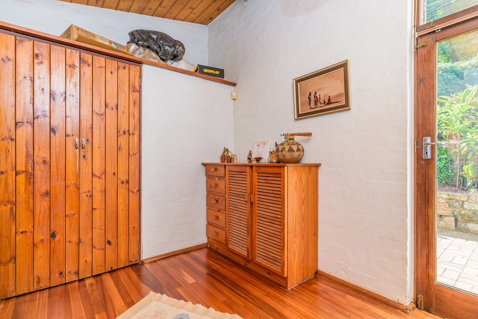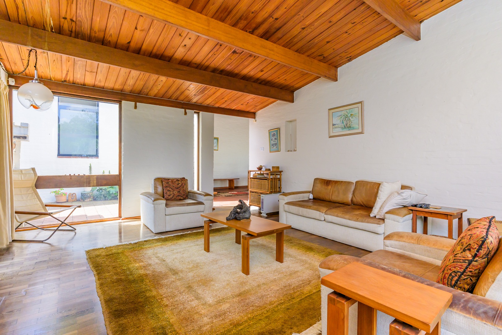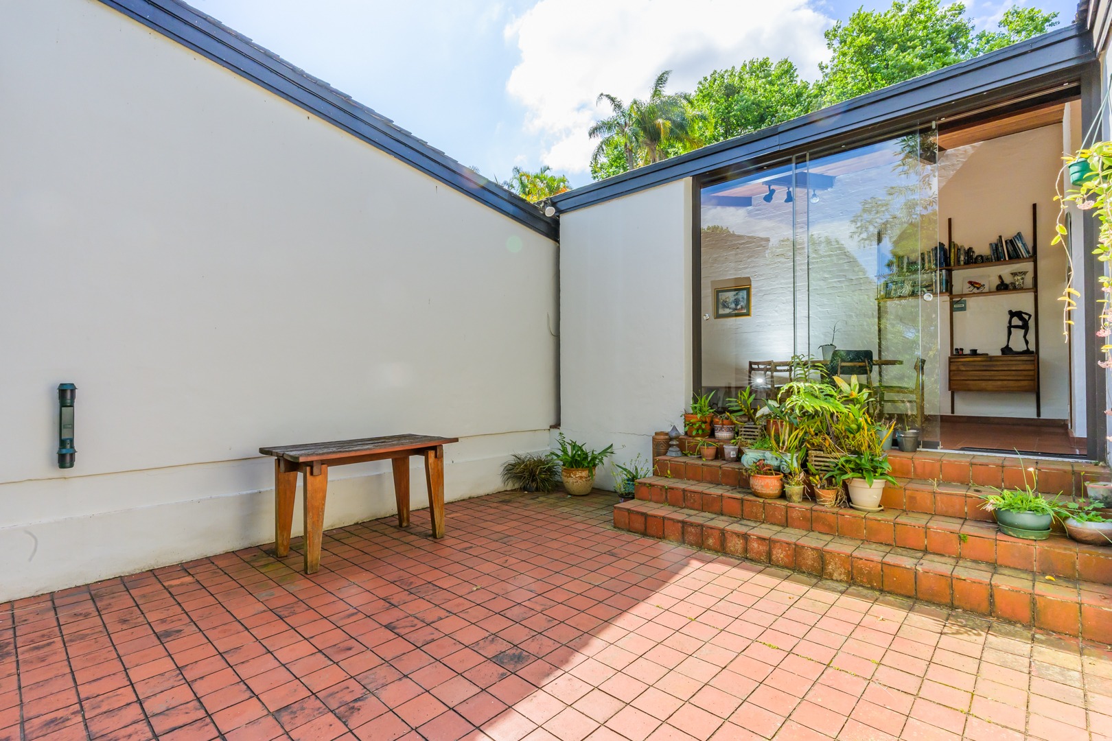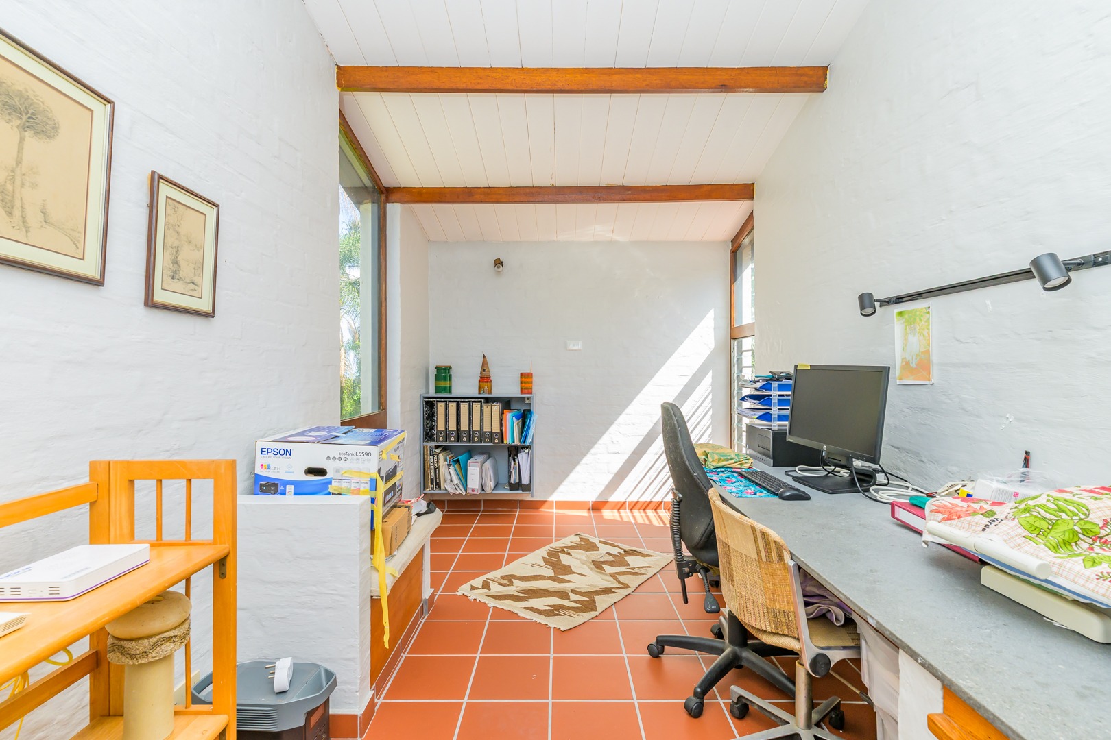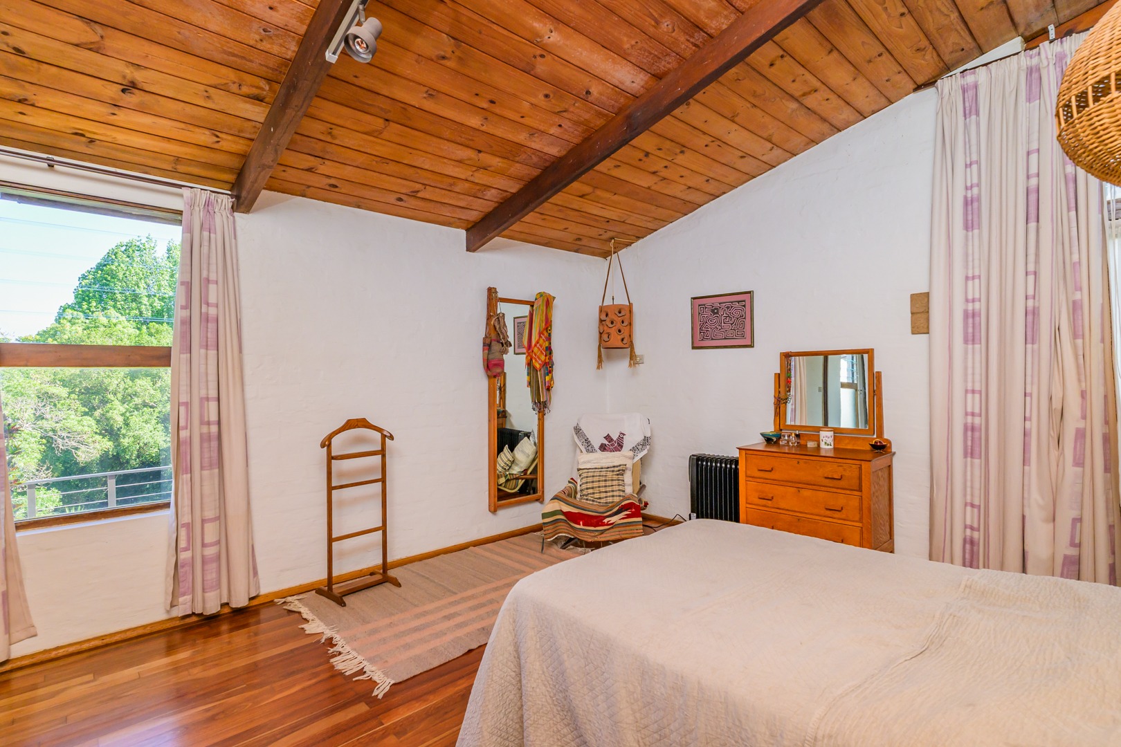 Discover this charming 3-bedroom residence nestled in the desirable suburb of Cowies Hill, Pinetown, South Africa. This home presents a striking modern architectural design, characterized by clean white walls, dark accents, and varied rooflines, creating an impressive kerb appeal. The exterior is complemented by lush, mature tropical landscaping, well-maintained lawns, and inviting brick pathways, leading to a serene outdoor pond and water feature. The interior boasts spacious living areas designed for comfort and natural light. The lounge features a distinctive exposed wooden beam ceiling, hardwood floors, and large windows that frame picturesque green views, creating an airy and inviting atmosphere. A built-in TV niche offers a streamlined entertainment setup, while sliding doors enhance the indoor-outdoor flow. The property also includes a dedicated study, perfect for remote work or a quiet retreat. The bright dining area continues the theme of natural light and warmth, with an exposed wooden beam and planked ceiling, terracotta-style flooring, and expansive glass windows that connect seamlessly with the surrounding greenery. The home offers three comfortable bedrooms and one well-appointed bathroom, alongside a convenient guest toilet. A functional kitchen and ample storage further enhance daily living. Outdoor living is a highlight, with an expansive wooden deck and a private patio providing ideal spaces for relaxation and entertaining amidst the beautiful garden. The property is totally walled for privacy and includes an access gate and burglar bars for enhanced security. Additional practical features include staff quarters and two dedicated parking spaces, with pets being allowed. This home offers a blend of character and functionality in a sought-after location. Key Features: * 3 Bedrooms, 1 Bathroom * Spacious Lounge with Wooden Beam Ceiling * Dedicated Study * Expansive Wooden Deck and Patio * Lush Tropical Garden with Water Feature * 2 Parking Spaces * Staff Quarters * Access Gate and Burglar Bars * Pets Allowed