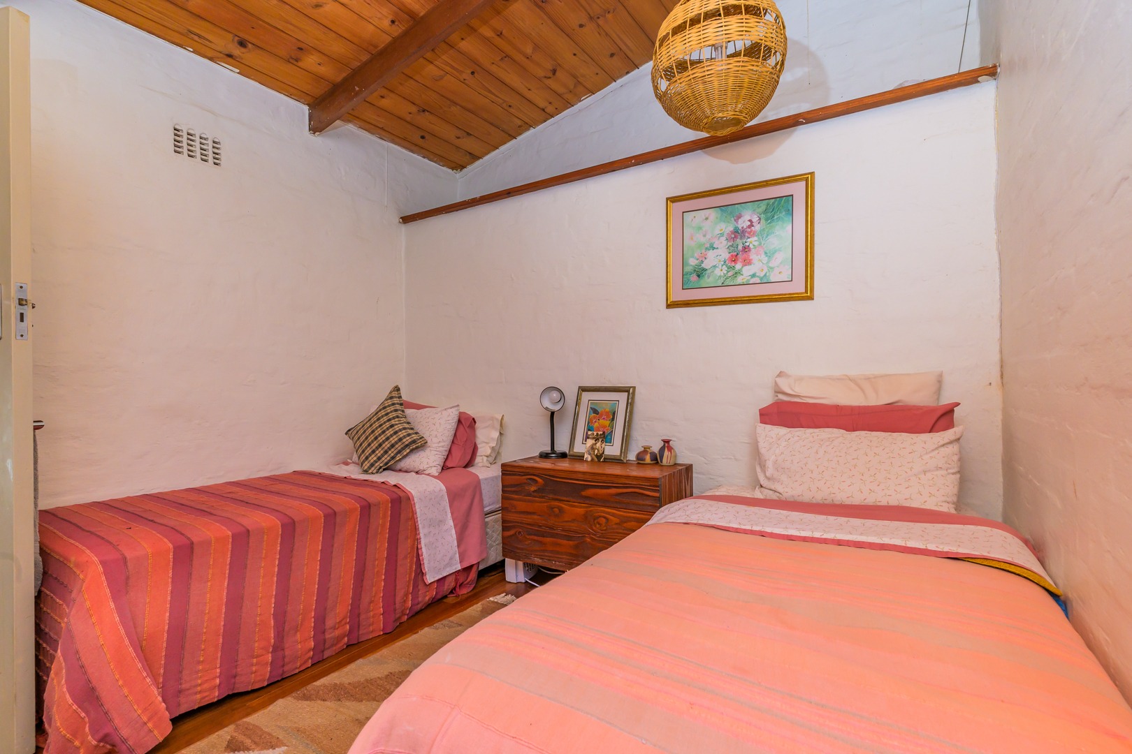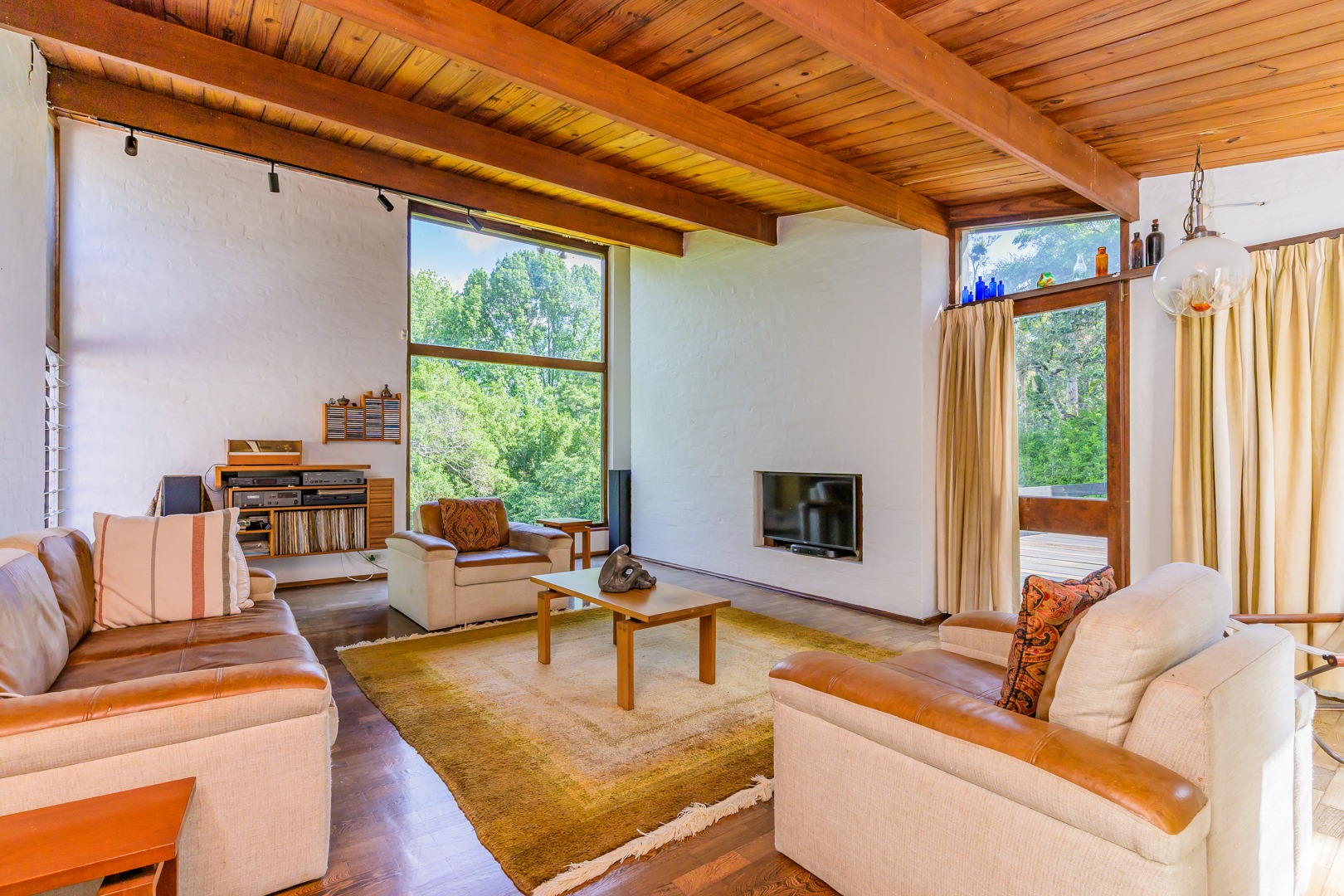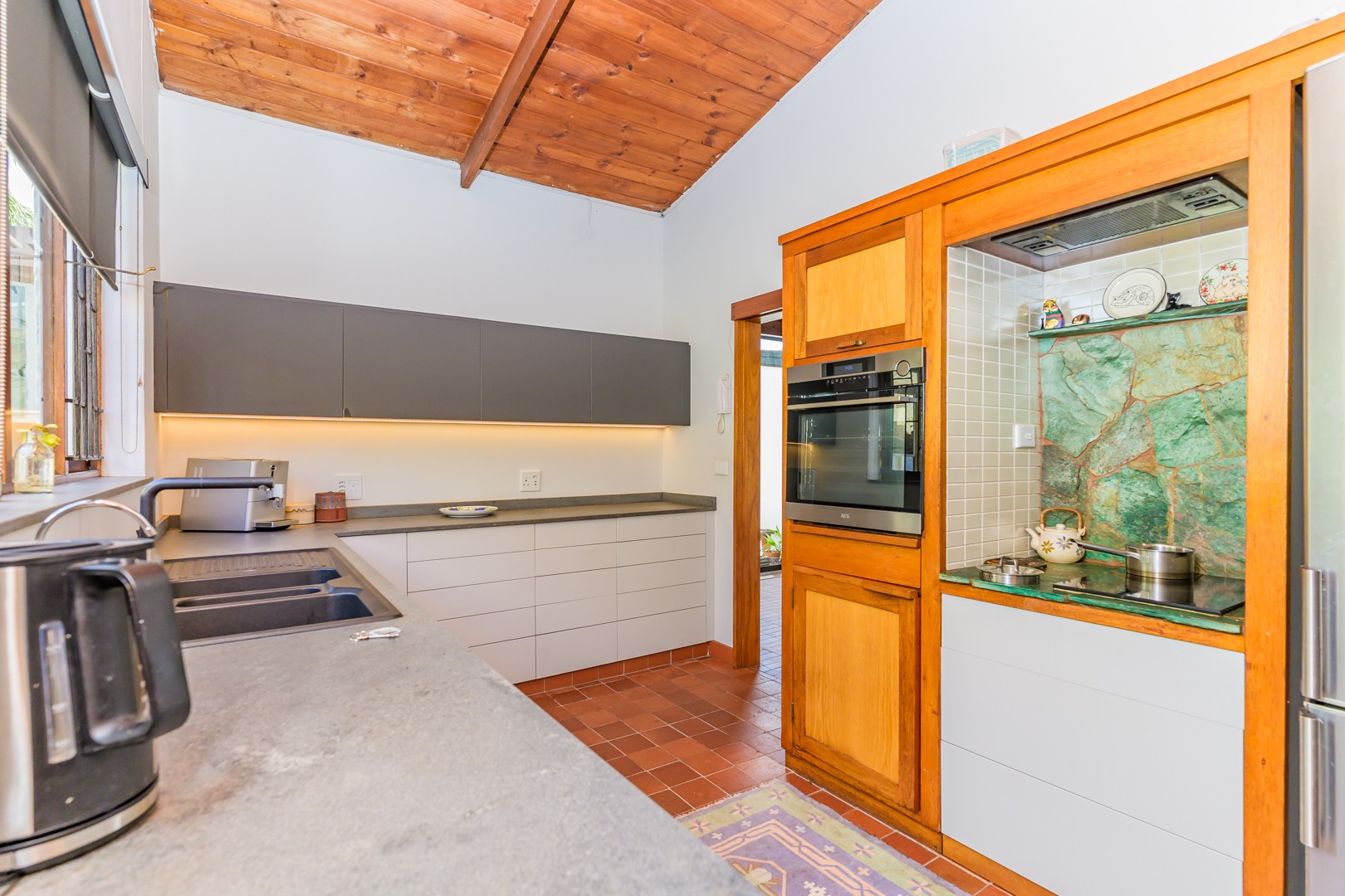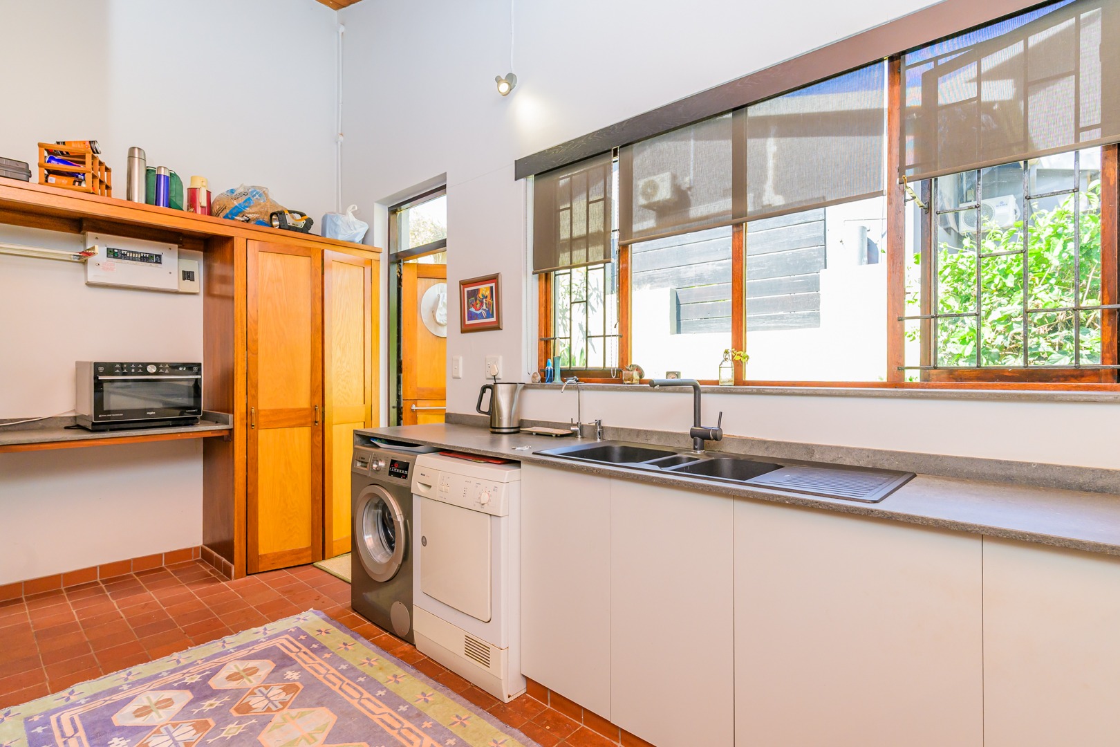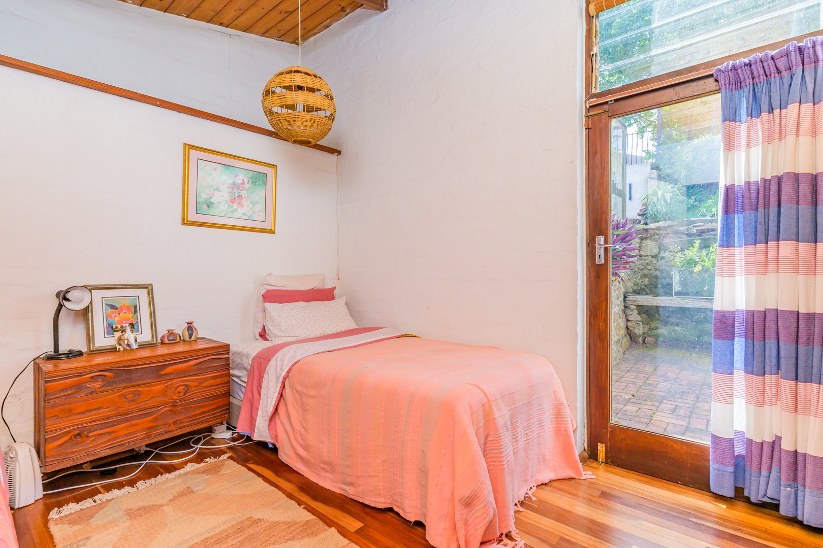 Discover this charming 3-bedroom residence nestled in the desirable suburb of Cowies Hill, Pinetown, South Africa. This home presents a striking modern architectural design, characterized by clean white walls, dark accents, and varied rooflines, creating an impressive kerb appeal. The exterior is complemented by lush, mature tropical landscaping, well-maintained lawns, and inviting brick pathways, leading to a serene outdoor pond and water feature. The interior boasts spacious living areas designed for comfort and natural light. The lounge features a distinctive exposed wooden beam ceiling, hardwood floors, and large windows that frame picturesque green views, creating an airy and inviting atmosphere. A built-in TV niche offers a streamlined entertainment setup, while sliding doors enhance the indoor-outdoor flow. The property also includes a dedicated study, perfect for remote work or a quiet retreat. The bright dining area continues the theme of natural light and warmth, with an exposed wooden beam and planked ceiling, terracotta-style flooring, and expansive glass windows that connect seamlessly with the surrounding greenery. The home offers three comfortable bedrooms and one well-appointed bathroom, alongside a convenient guest toilet. A functional kitchen and ample storage further enhance daily living. Outdoor living is a highlight, with an expansive wooden deck and a private patio providing ideal spaces for relaxation and entertaining amidst the beautiful garden. The property is totally walled for privacy and includes an access gate and burglar bars for enhanced security. Additional practical features include staff quarters and two dedicated parking spaces, with pets being allowed. This home offers a blend of character and functionality in a sought-after location. Key Features: * 3 Bedrooms, 1 Bathroom * Spacious Lounge with Wooden Beam Ceiling * Dedicated Study * Expansive Wooden Deck and Patio * Lush Tropical Garden with Water Feature * 2 Parking Spaces * Staff Quarters * Access Gate and Burglar Bars * Pets Allowed