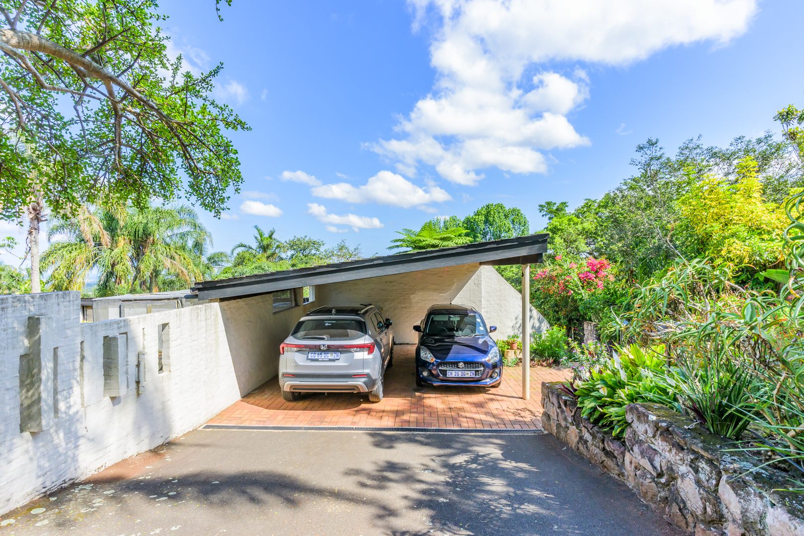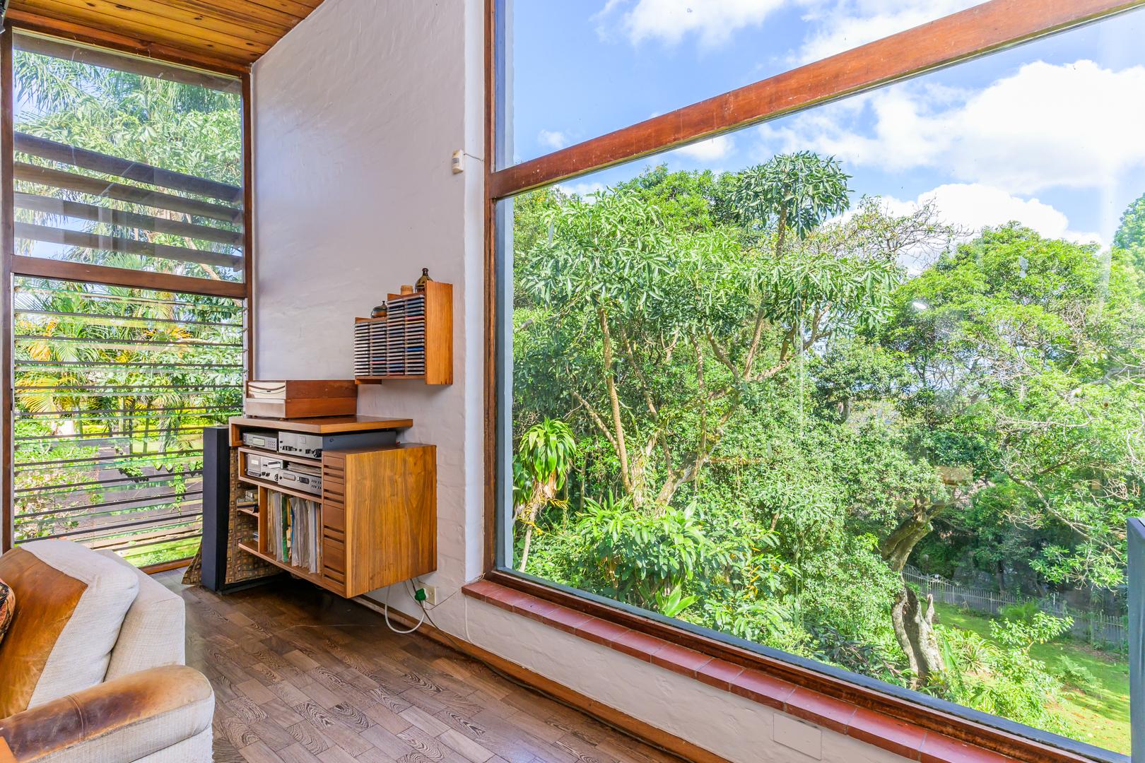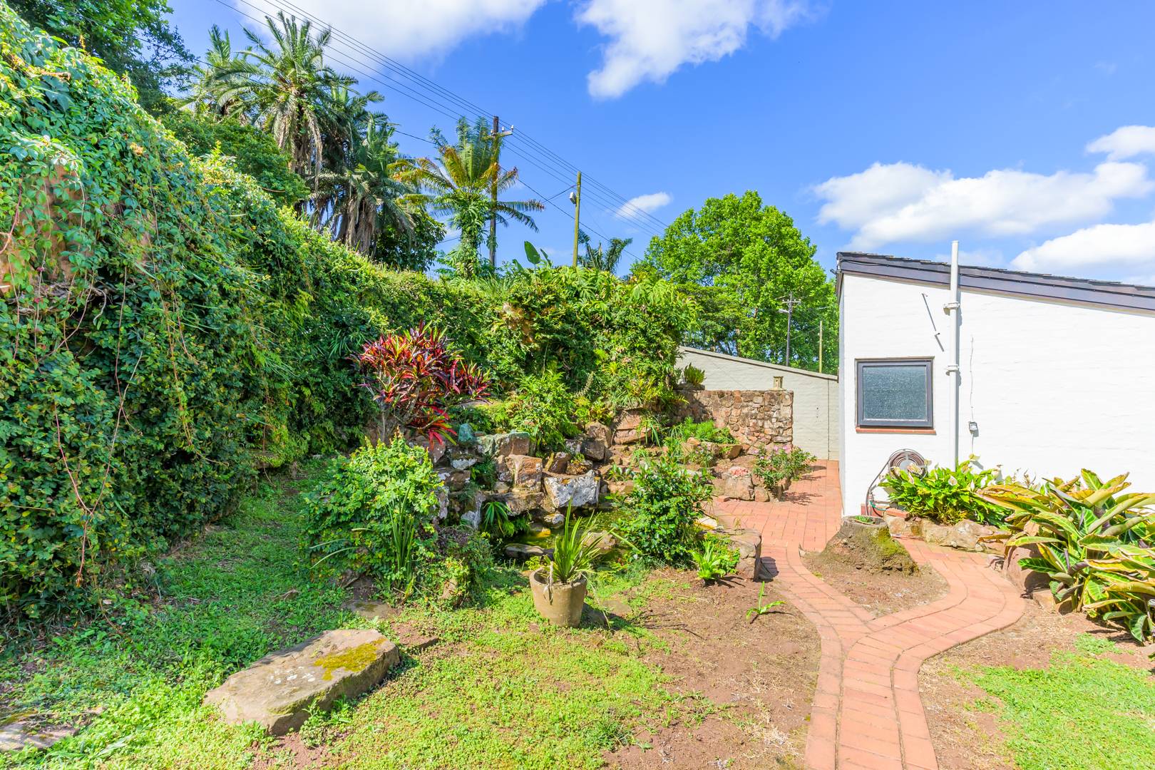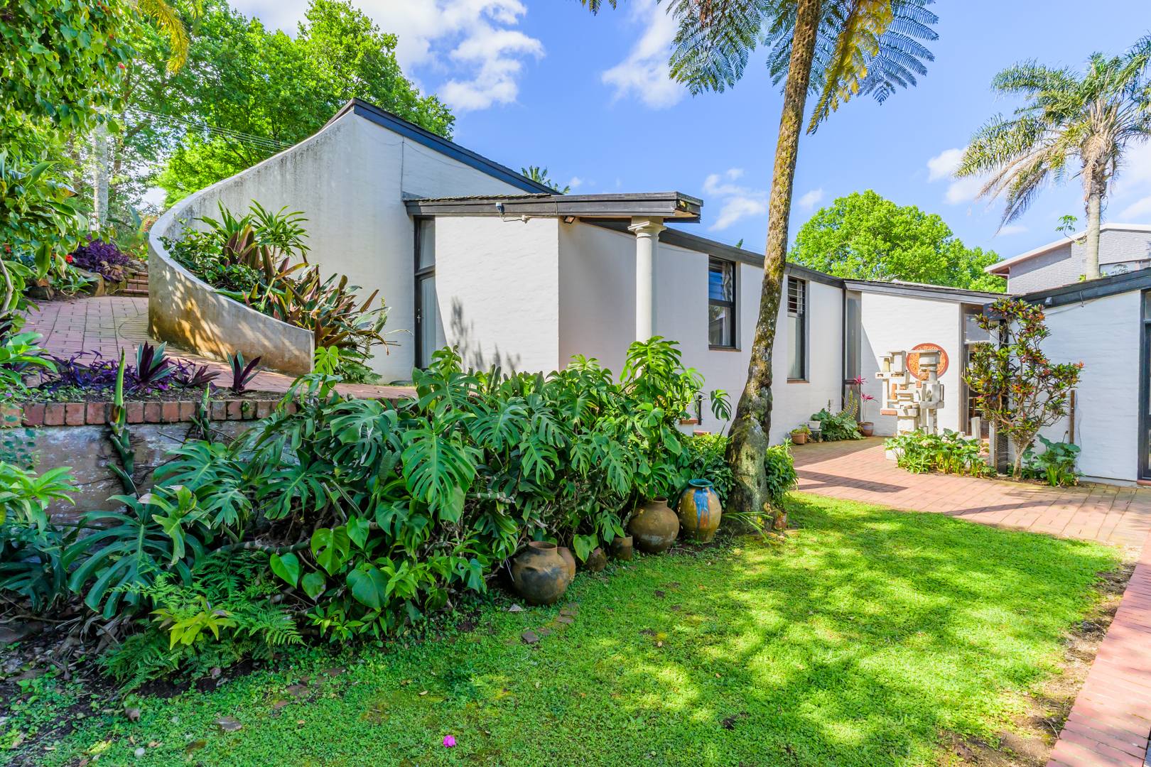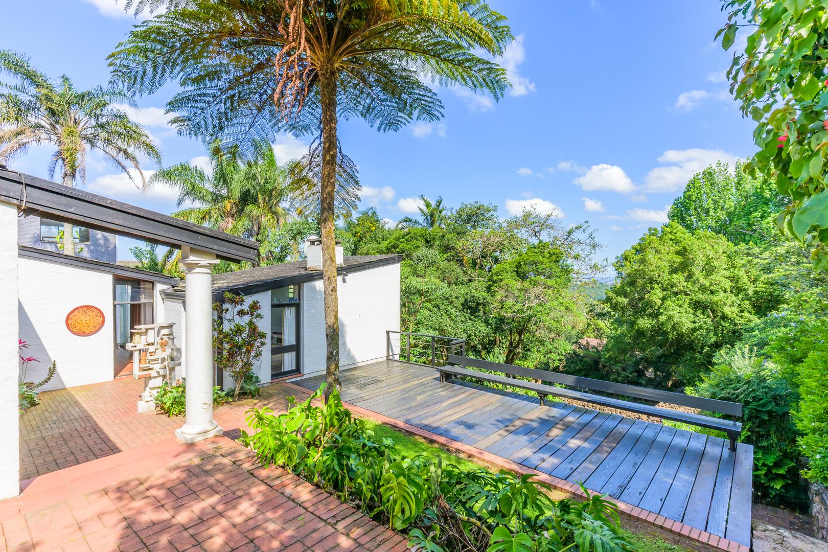 Discover this charming 3-bedroom residence nestled in the desirable suburb of Cowies Hill, Pinetown, South Africa. This home presents a striking modern architectural design, characterized by clean white walls, dark accents, and varied rooflines, creating an impressive kerb appeal. The exterior is complemented by lush, mature tropical landscaping, well-maintained lawns, and inviting brick pathways, leading to a serene outdoor pond and water feature. The interior boasts spacious living areas designed for comfort and natural light. The lounge features a distinctive exposed wooden beam ceiling, hardwood floors, and large windows that frame picturesque green views, creating an airy and inviting atmosphere. A built-in TV niche offers a streamlined entertainment setup, while sliding doors enhance the indoor-outdoor flow. The property also includes a dedicated study, perfect for remote work or a quiet retreat. The bright dining area continues the theme of natural light and warmth, with an exposed wooden beam and planked ceiling, terracotta-style flooring, and expansive glass windows that connect seamlessly with the surrounding greenery. The home offers three comfortable bedrooms and one well-appointed bathroom, alongside a convenient guest toilet. A functional kitchen and ample storage further enhance daily living. Outdoor living is a highlight, with an expansive wooden deck and a private patio providing ideal spaces for relaxation and entertaining amidst the beautiful garden. The property is totally walled for privacy and includes an access gate and burglar bars for enhanced security. Additional practical features include staff quarters and two dedicated parking spaces, with pets being allowed. This home offers a blend of character and functionality in a sought-after location. Key Features: * 3 Bedrooms, 1 Bathroom * Spacious Lounge with Wooden Beam Ceiling * Dedicated Study * Expansive Wooden Deck and Patio * Lush Tropical Garden with Water Feature * 2 Parking Spaces * Staff Quarters * Access Gate and Burglar Bars * Pets Allowed