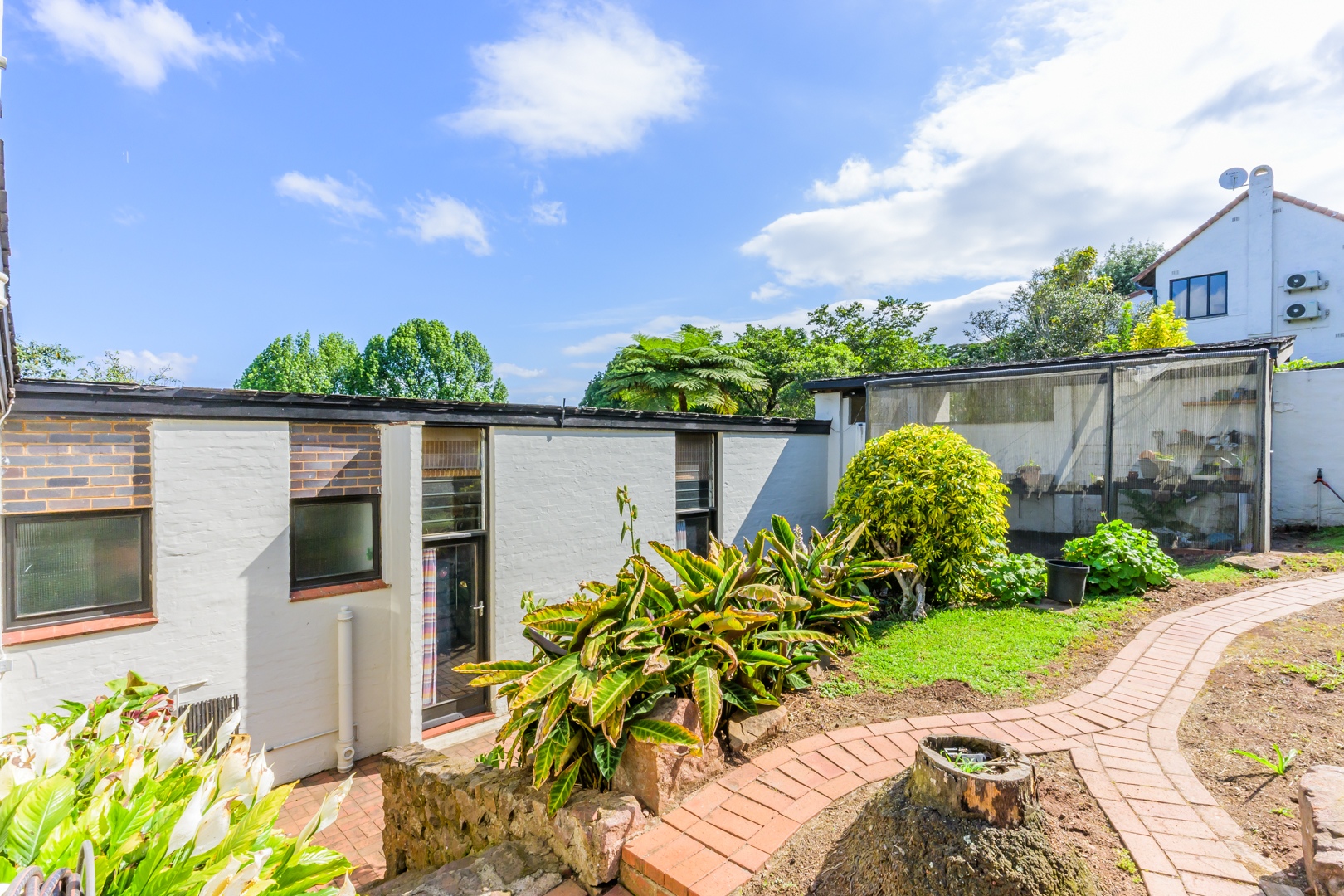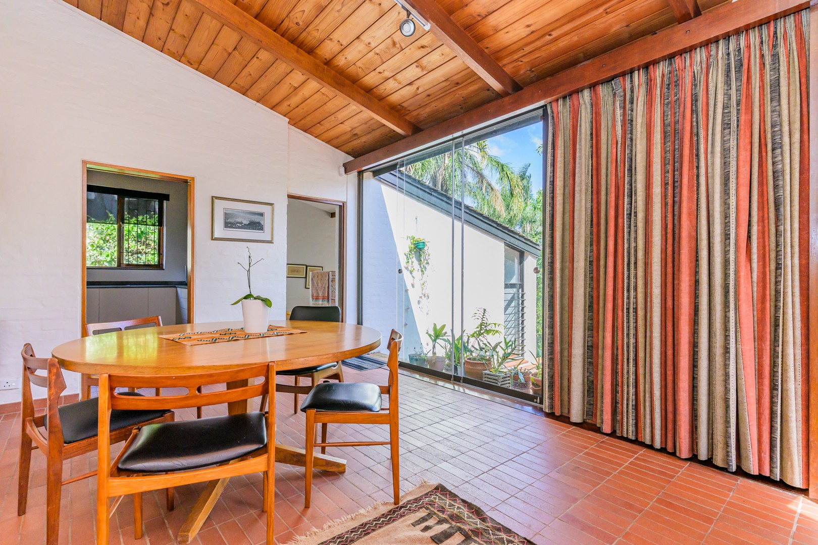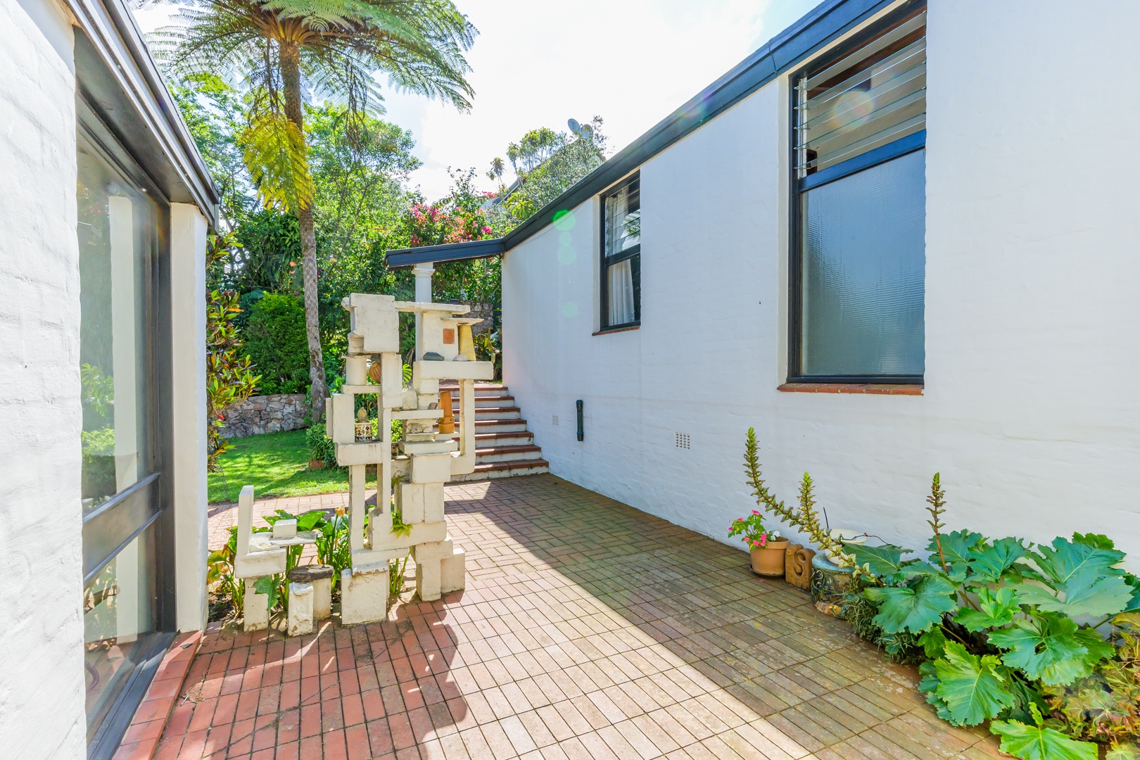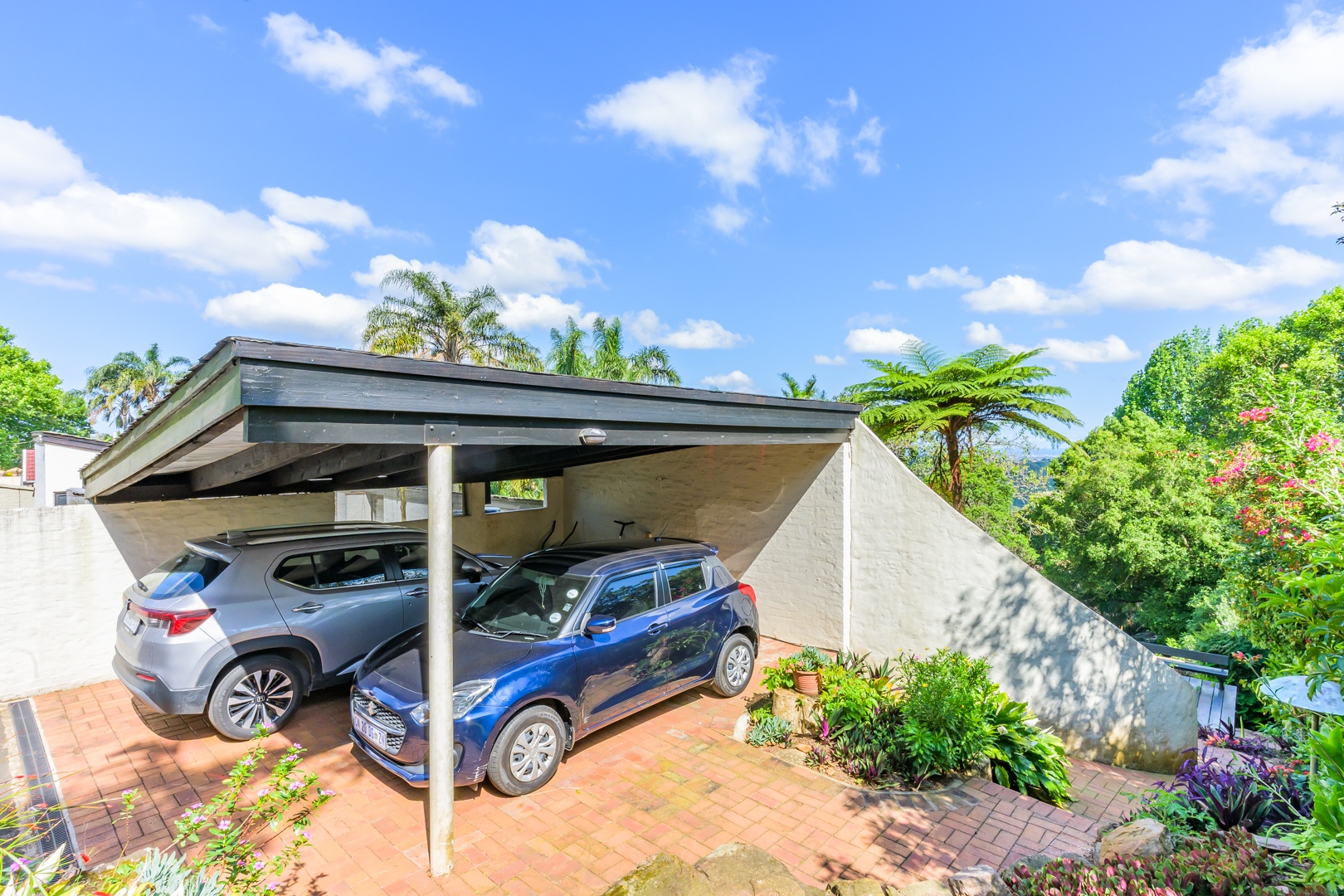 Discover this charming 3-bedroom residence nestled in the desirable suburb of Cowies Hill, Pinetown, South Africa. This home presents a striking modern architectural design, characterized by clean white walls, dark accents, and varied rooflines, creating an impressive kerb appeal. The exterior is complemented by lush, mature tropical landscaping, well-maintained lawns, and inviting brick pathways, leading to a serene outdoor pond and water feature. The interior boasts spacious living areas designed for comfort and natural light. The lounge features a distinctive exposed wooden beam ceiling, hardwood floors, and large windows that frame picturesque green views, creating an airy and inviting atmosphere. A built-in TV niche offers a streamlined entertainment setup, while sliding doors enhance the indoor-outdoor flow. The property also includes a dedicated study, perfect for remote work or a quiet retreat. The bright dining area continues the theme of natural light and warmth, with an exposed wooden beam and planked ceiling, terracotta-style flooring, and expansive glass windows that connect seamlessly with the surrounding greenery. The home offers three comfortable bedrooms and one well-appointed bathroom, alongside a convenient guest toilet. A functional kitchen and ample storage further enhance daily living. Outdoor living is a highlight, with an expansive wooden deck and a private patio providing ideal spaces for relaxation and entertaining amidst the beautiful garden. The property is totally walled for privacy and includes an access gate and burglar bars for enhanced security. Additional practical features include staff quarters and two dedicated parking spaces, with pets being allowed. This home offers a blend of character and functionality in a sought-after location. Key Features: * 3 Bedrooms, 1 Bathroom * Spacious Lounge with Wooden Beam Ceiling * Dedicated Study * Expansive Wooden Deck and Patio * Lush Tropical Garden with Water Feature * 2 Parking Spaces * Staff Quarters * Access Gate and Burglar Bars * Pets Allowed
