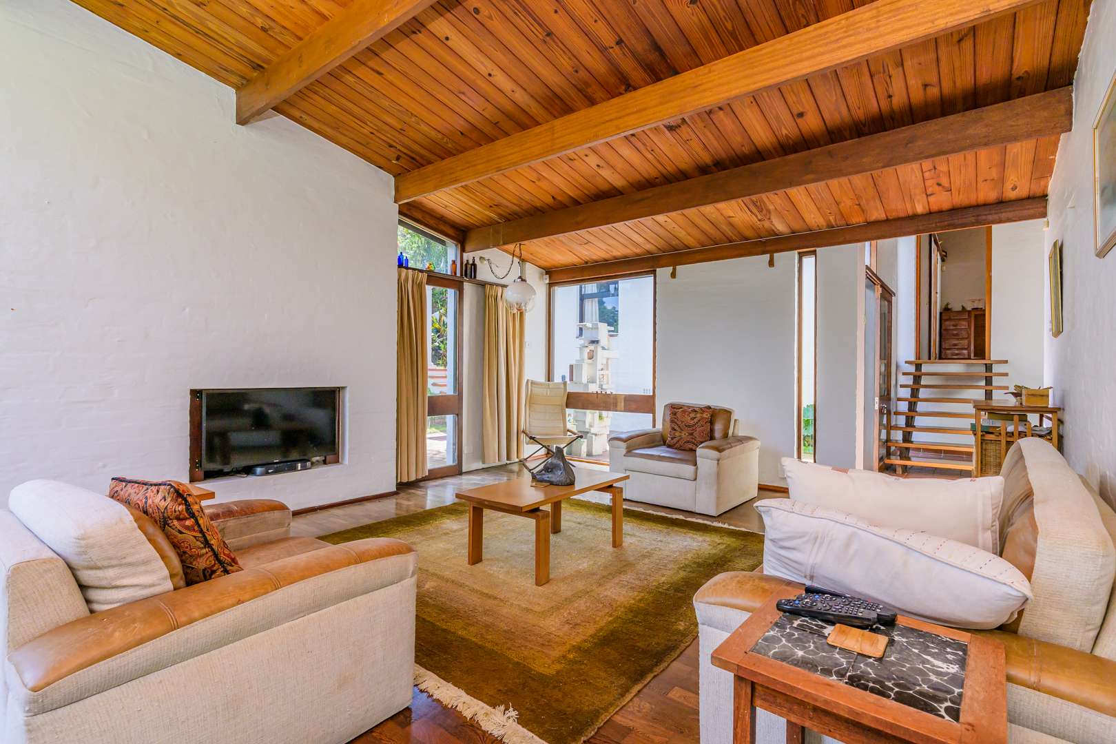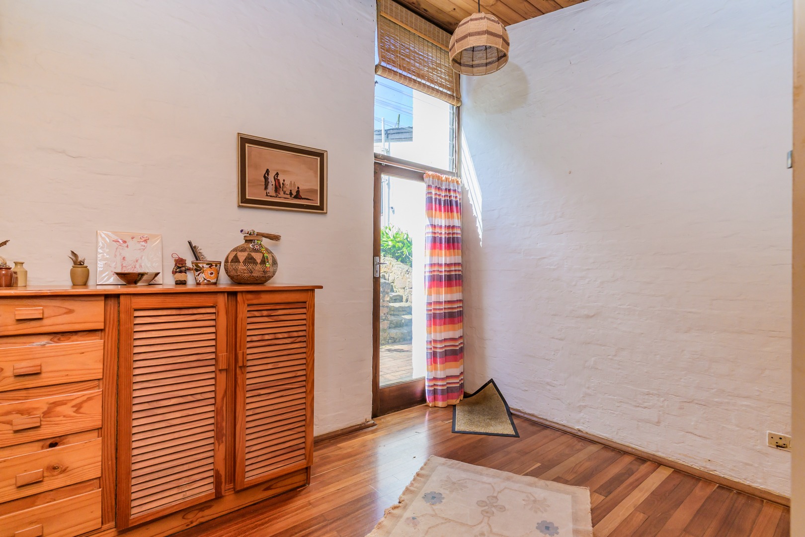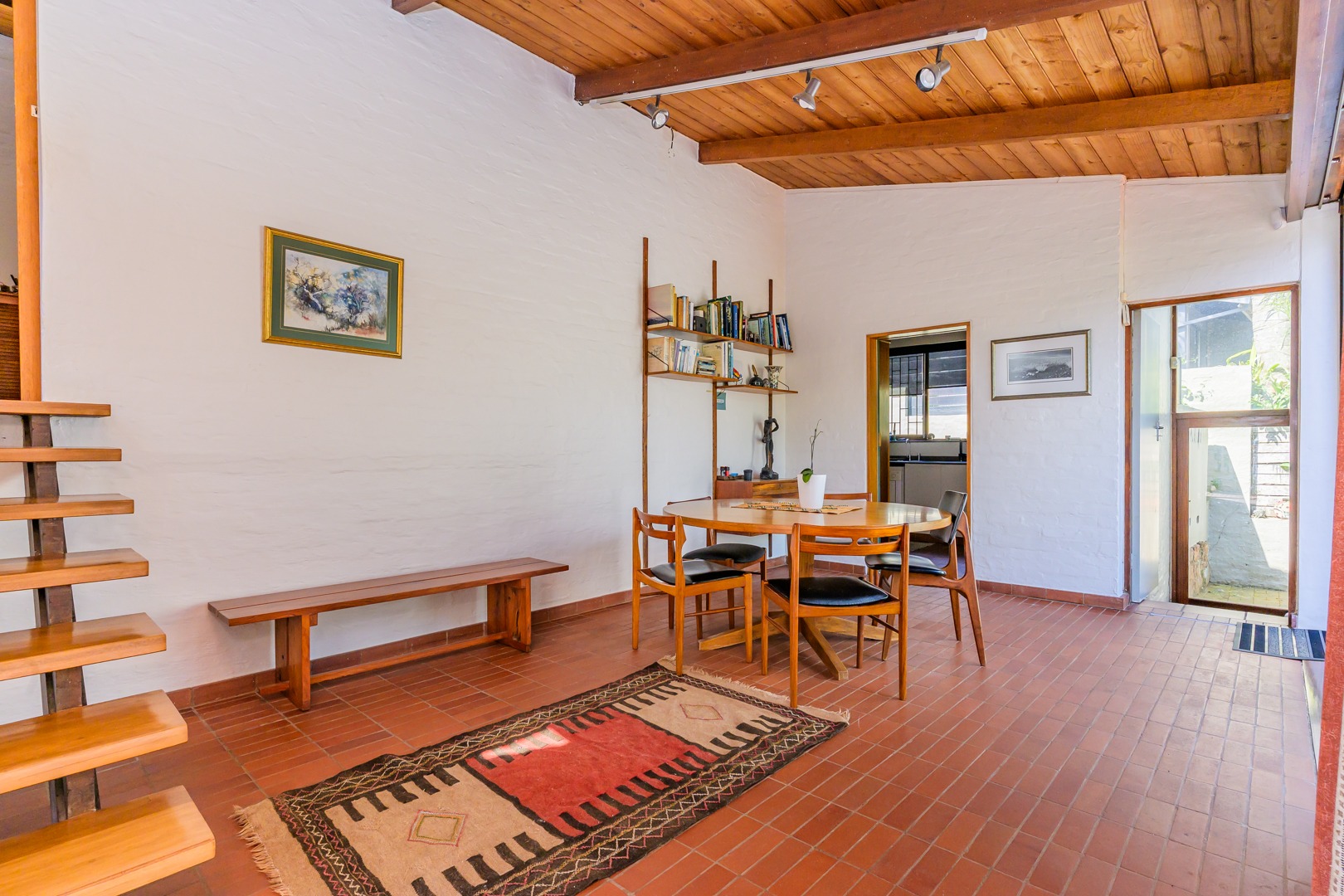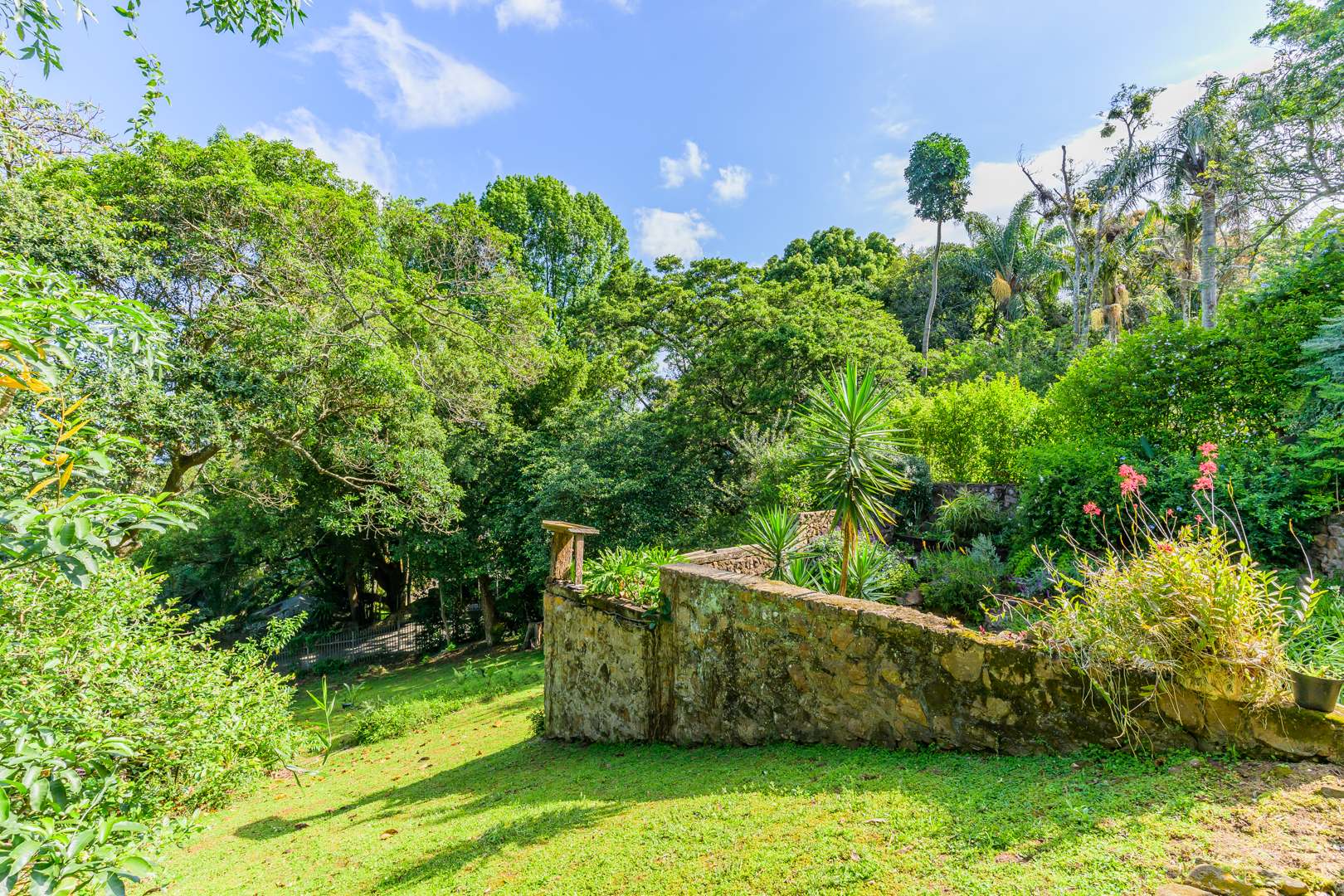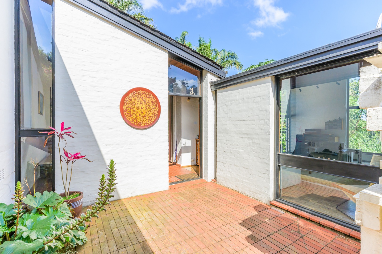 Discover this charming 3-bedroom residence nestled in the desirable suburb of Cowies Hill, Pinetown, South Africa. This home presents a striking modern architectural design, characterized by clean white walls, dark accents, and varied rooflines, creating an impressive kerb appeal. The exterior is complemented by lush, mature tropical landscaping, well-maintained lawns, and inviting brick pathways, leading to a serene outdoor pond and water feature. The interior boasts spacious living areas designed for comfort and natural light. The lounge features a distinctive exposed wooden beam ceiling, hardwood floors, and large windows that frame picturesque green views, creating an airy and inviting atmosphere. A built-in TV niche offers a streamlined entertainment setup, while sliding doors enhance the indoor-outdoor flow. The property also includes a dedicated study, perfect for remote work or a quiet retreat. The bright dining area continues the theme of natural light and warmth, with an exposed wooden beam and planked ceiling, terracotta-style flooring, and expansive glass windows that connect seamlessly with the surrounding greenery. The home offers three comfortable bedrooms and one well-appointed bathroom, alongside a convenient guest toilet. A functional kitchen and ample storage further enhance daily living. Outdoor living is a highlight, with an expansive wooden deck and a private patio providing ideal spaces for relaxation and entertaining amidst the beautiful garden. The property is totally walled for privacy and includes an access gate and burglar bars for enhanced security. Additional practical features include staff quarters and two dedicated parking spaces, with pets being allowed. This home offers a blend of character and functionality in a sought-after location. Key Features: * 3 Bedrooms, 1 Bathroom * Spacious Lounge with Wooden Beam Ceiling * Dedicated Study * Expansive Wooden Deck and Patio * Lush Tropical Garden with Water Feature * 2 Parking Spaces * Staff Quarters * Access Gate and Burglar Bars * Pets Allowed