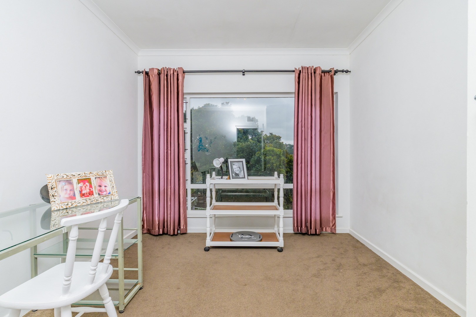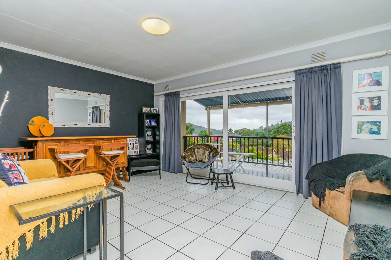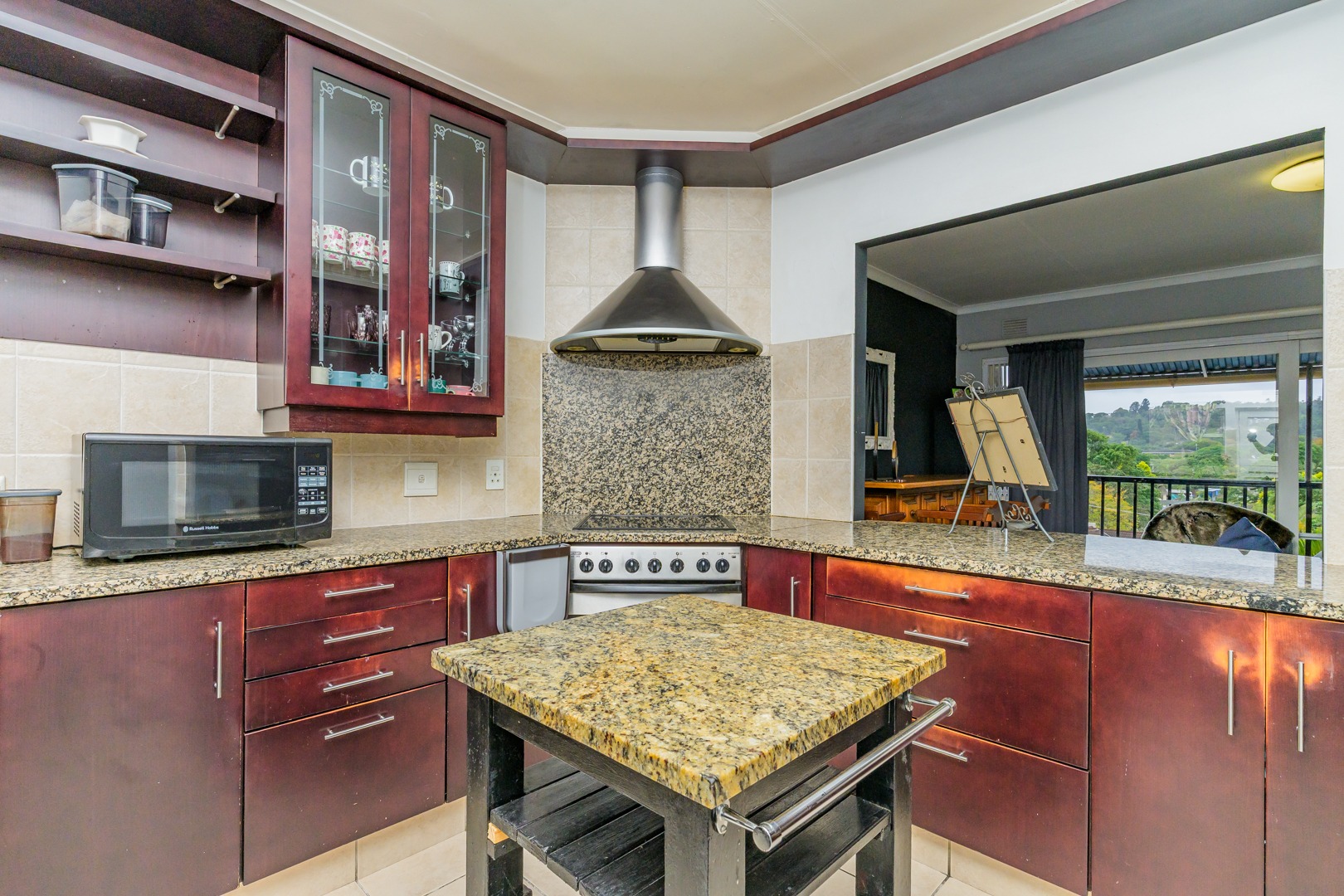 Step inside to a functional interior designed for everyday living. The kitchen boasts ample dark wood cabinetry, granite countertops, a built-in oven, hob, and extractor fan, complemented by a convenient movable island and a pass-through window connecting to the living area. Tiled flooring extends into the spacious lounge and dining room, creating a cohesive flow. The lounge features modern two-tone walls and offers direct access to a deck, perfect for enjoying the scenic views. A dedicated bar area adds to the entertainment potential of the space.