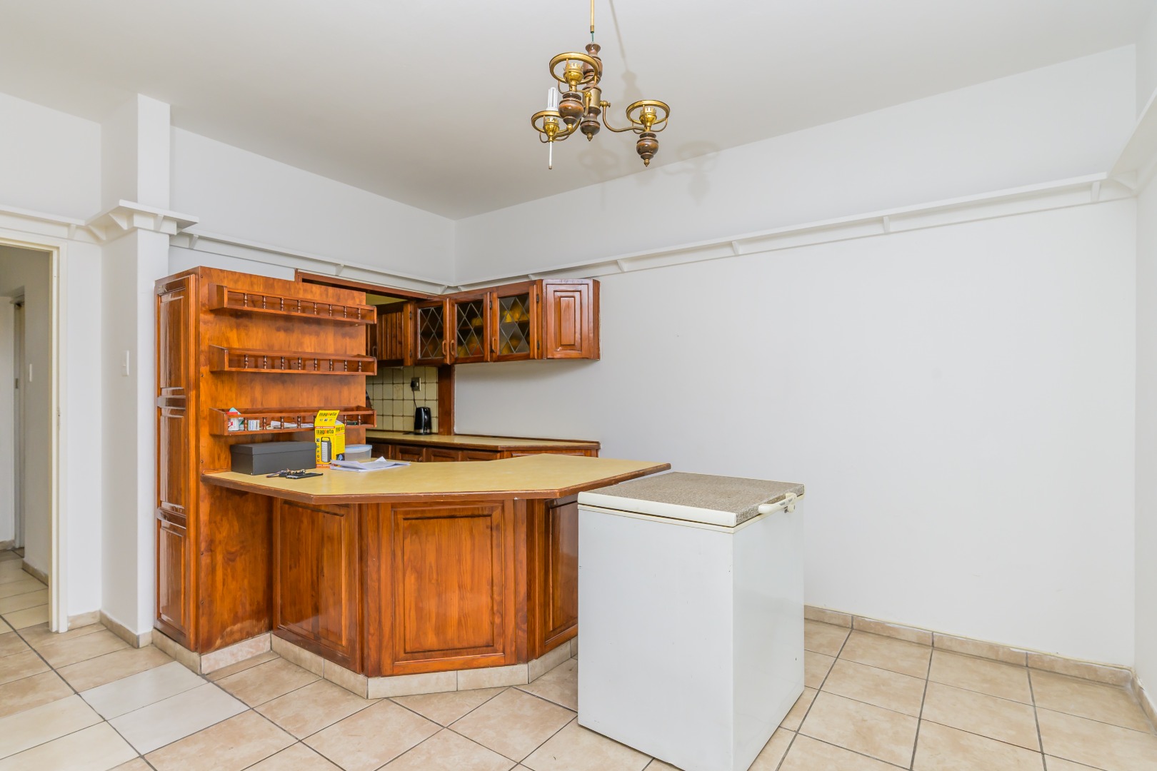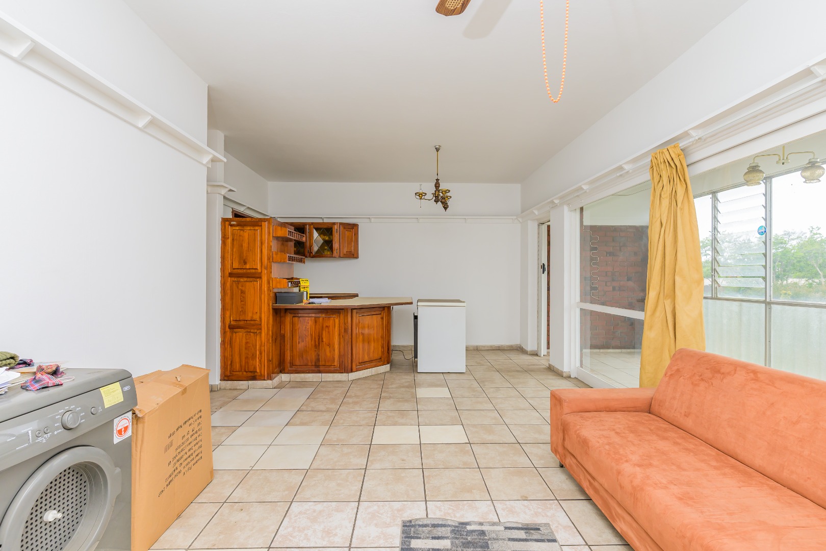 The pine fitted kitchen offers ample cupboard space and flows into a generously sized lounge and dining area, which leads to an enclosed balcony, ideal as a sunroom or extra living space.
