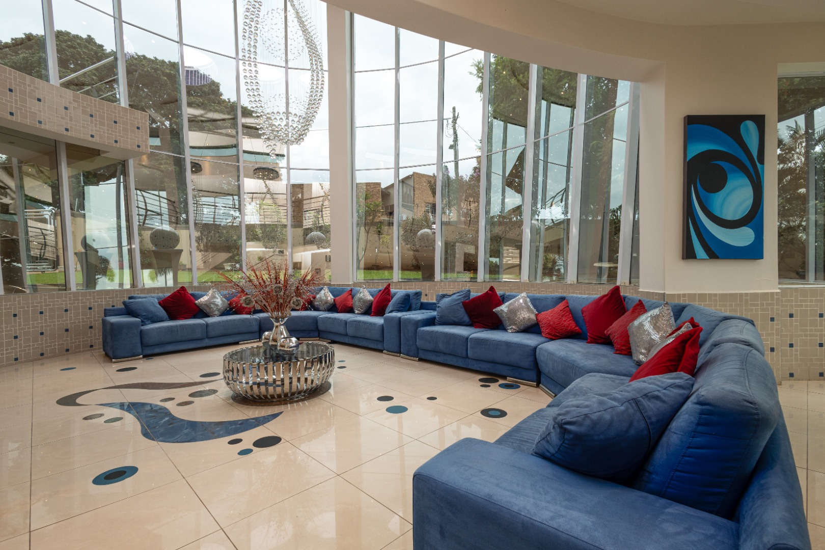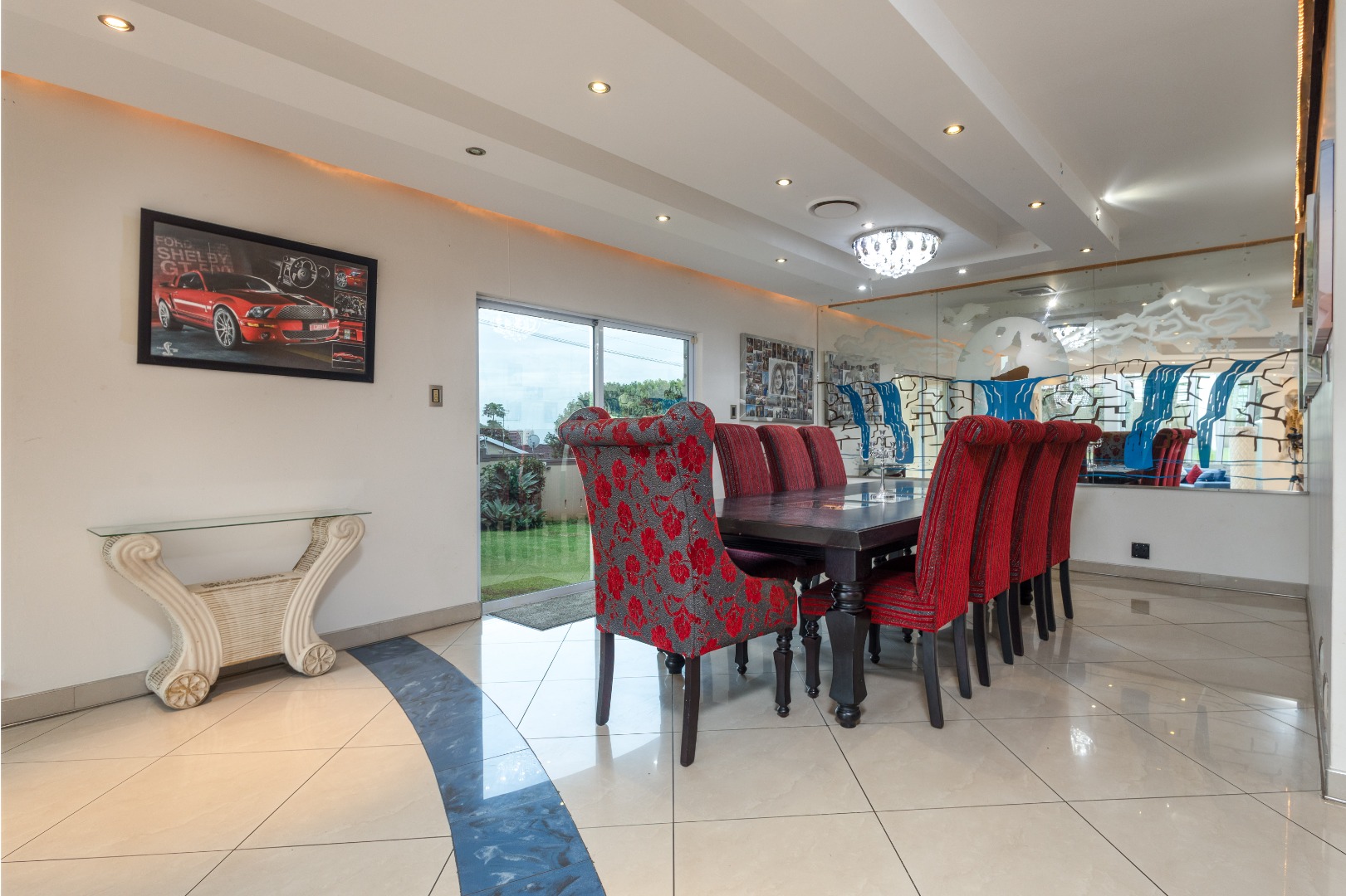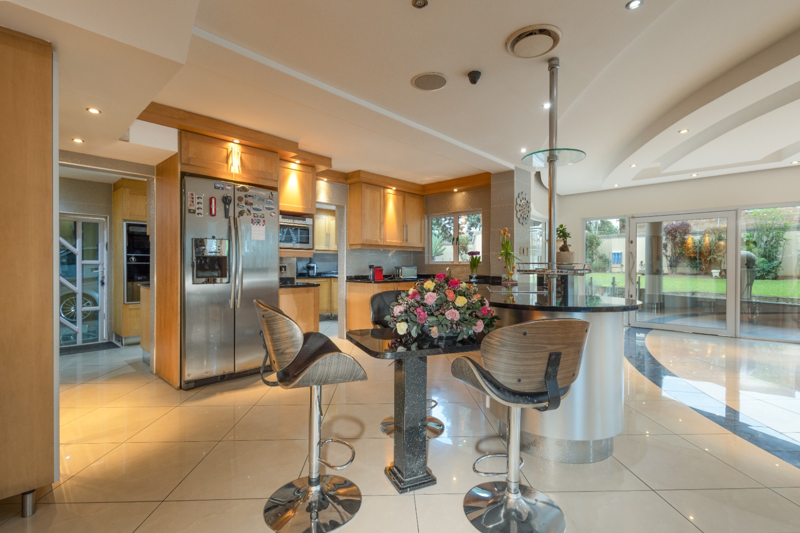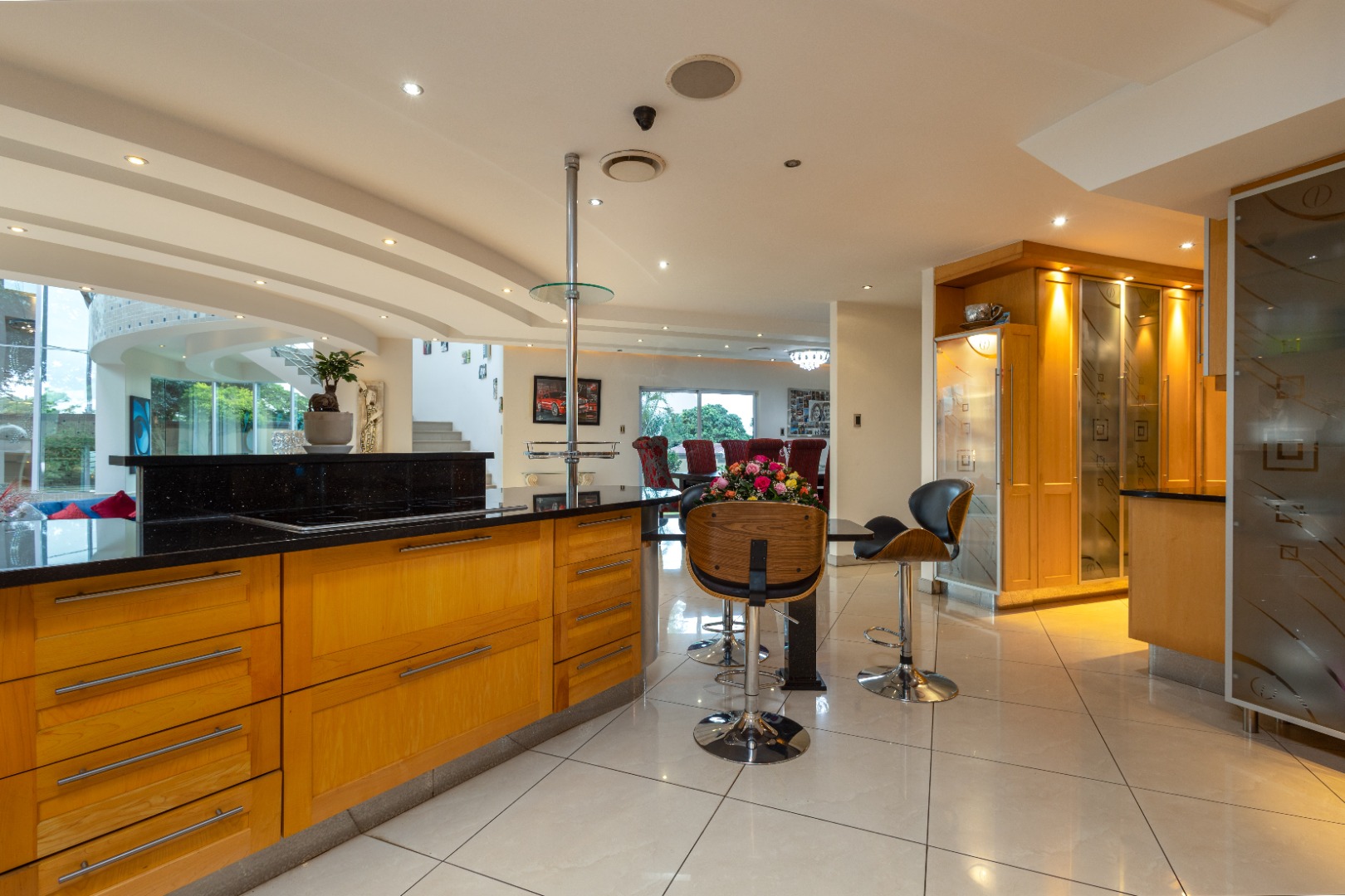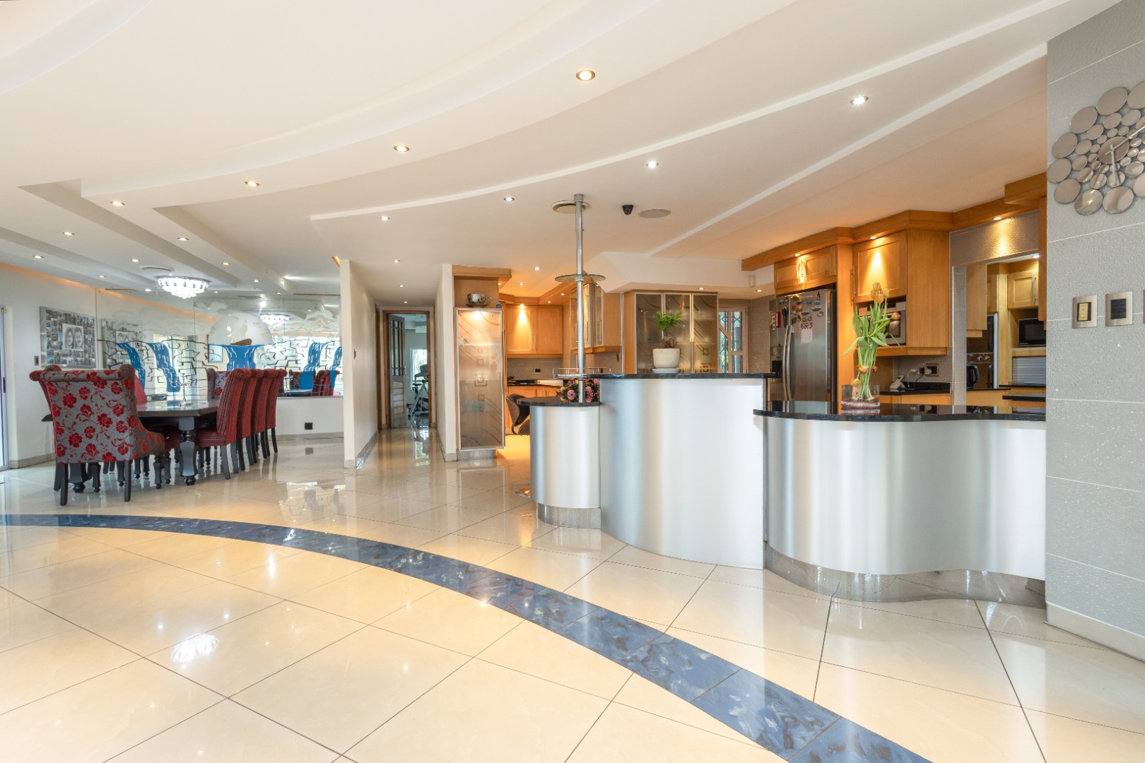 open-plan dining area flows seamlessly into a chic lounge and ornate glass