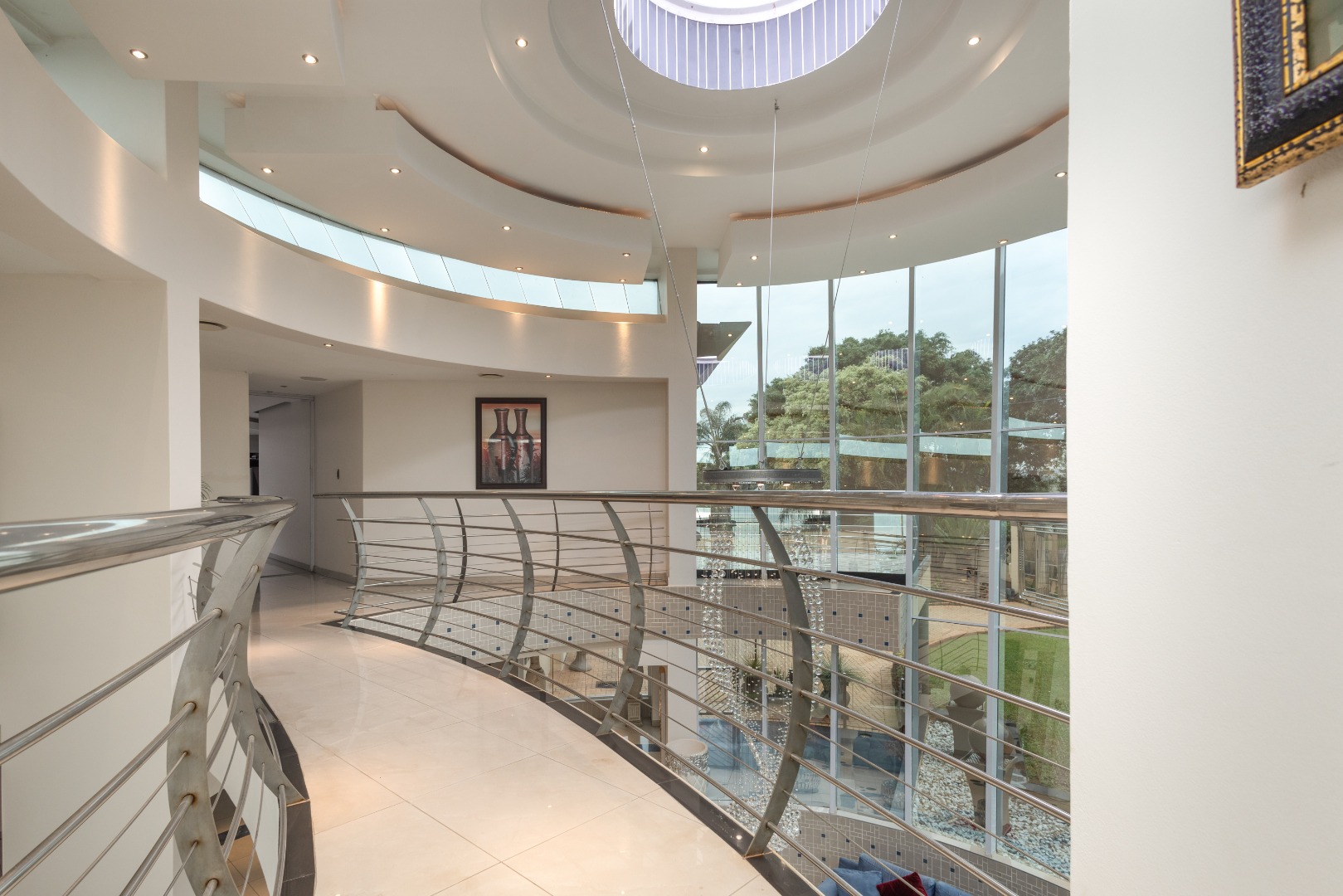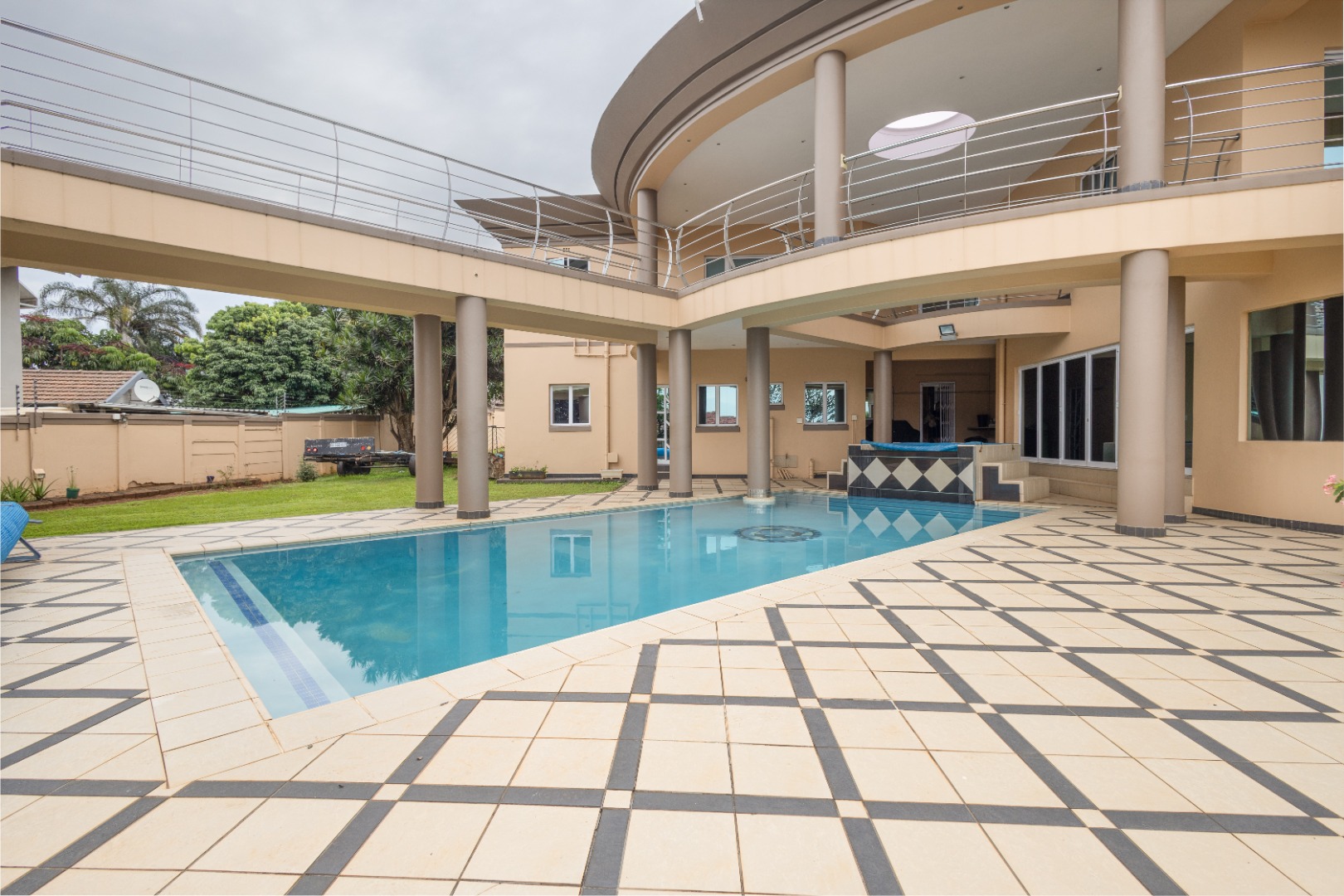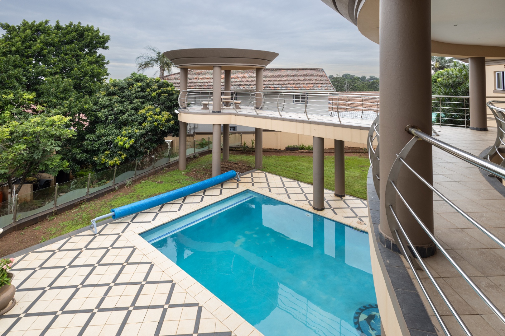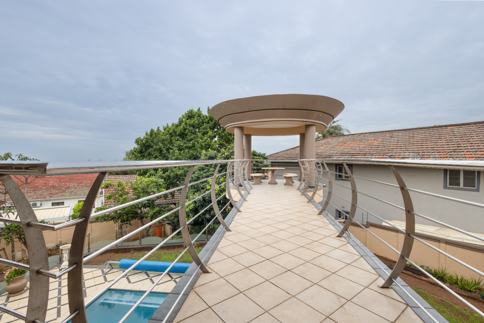 Step from the main bedroom onto a suspended bridge supported by concrete columns overlooking the heated pool that leads to a viewing tower over seeing Pavillion Mall ,the Durban Harbour skyline and distant sea views. A perfect spot to relax and unwind.
