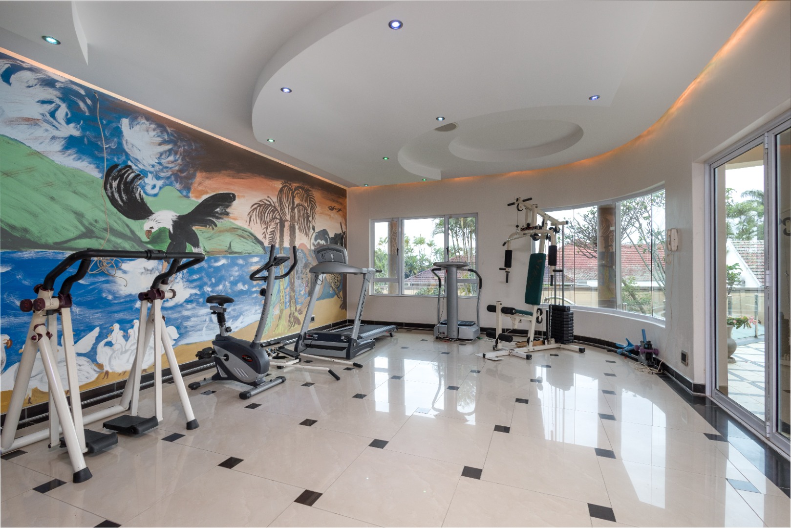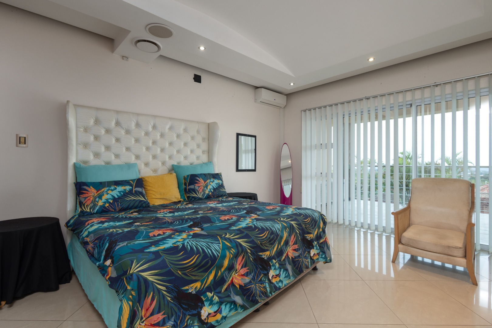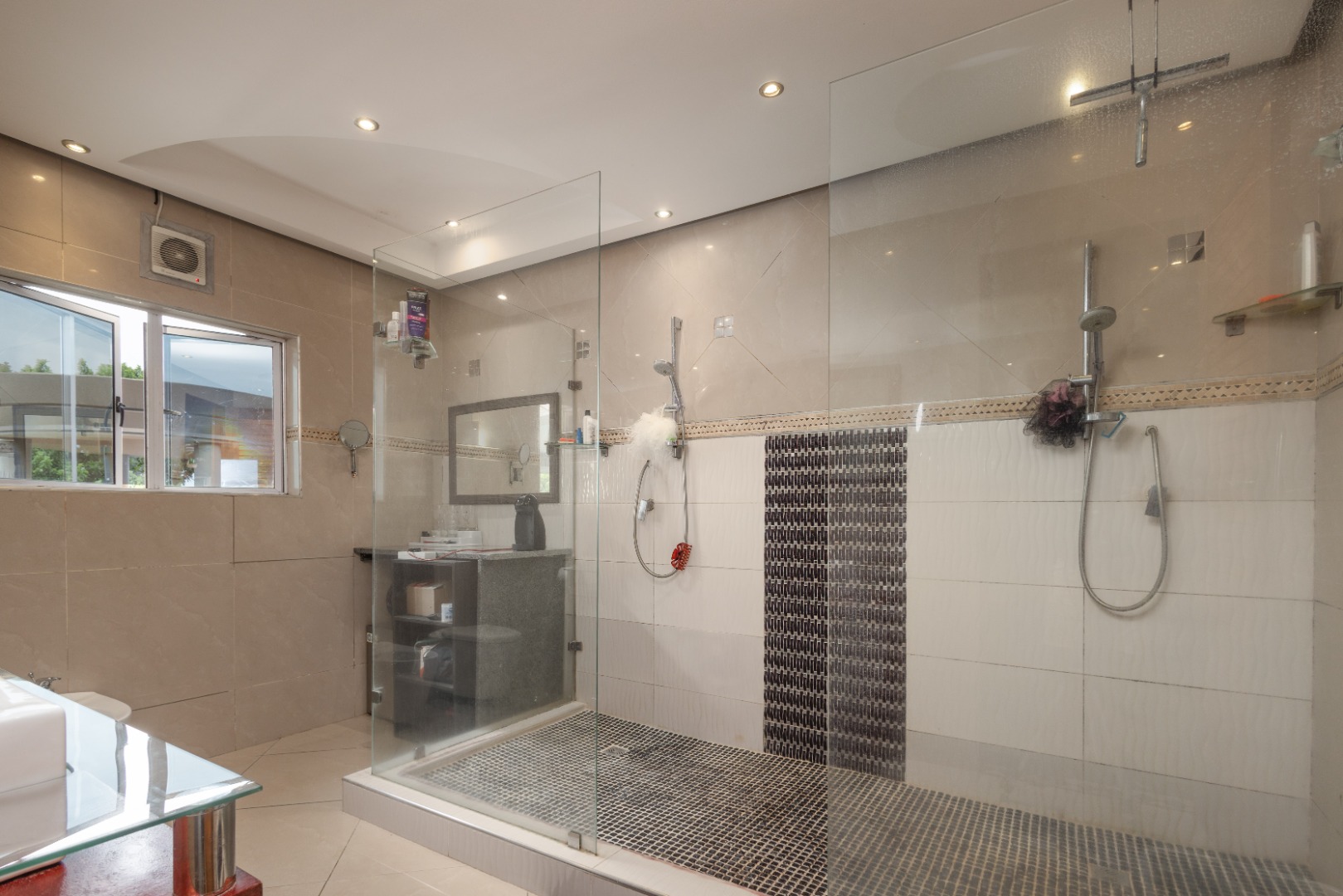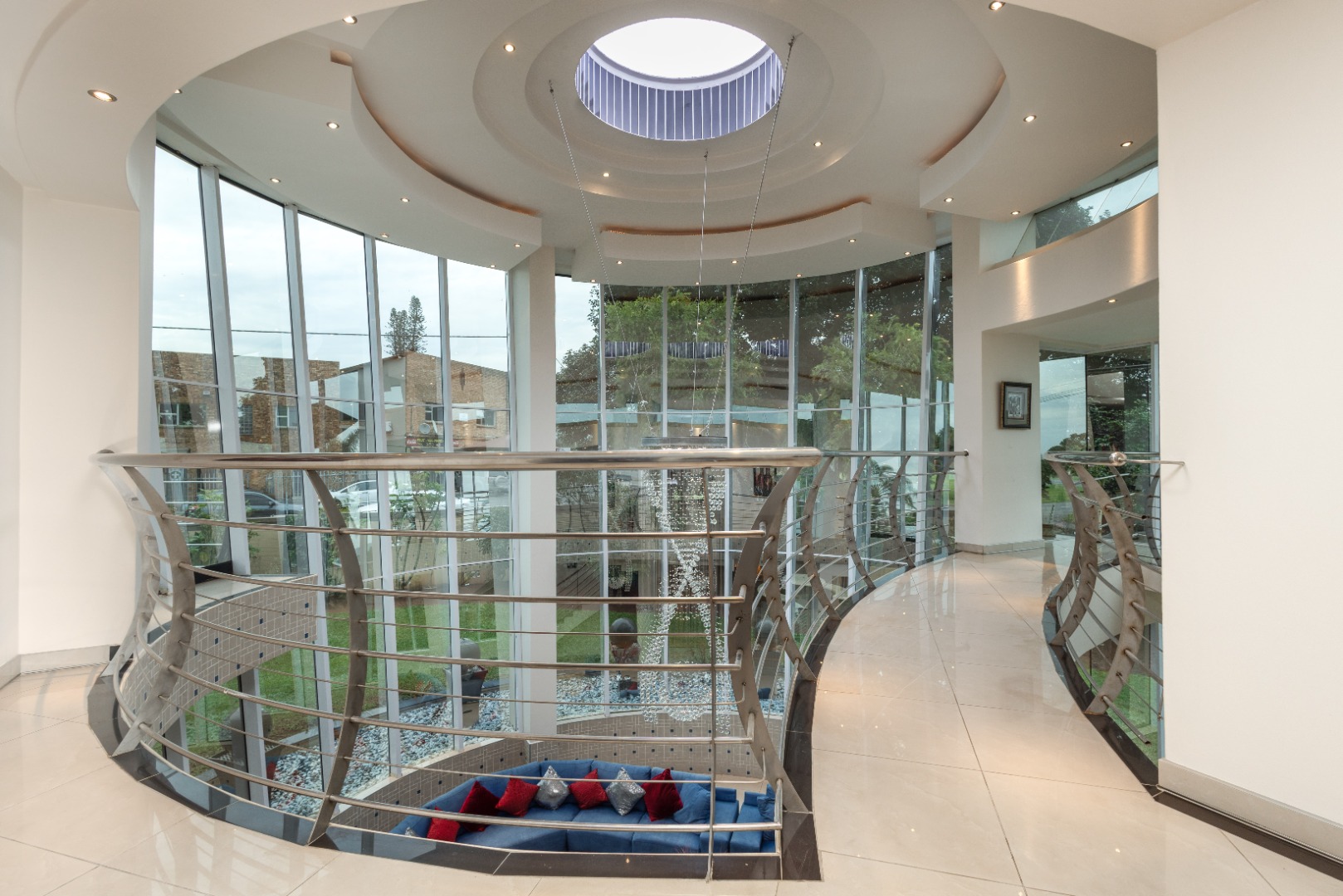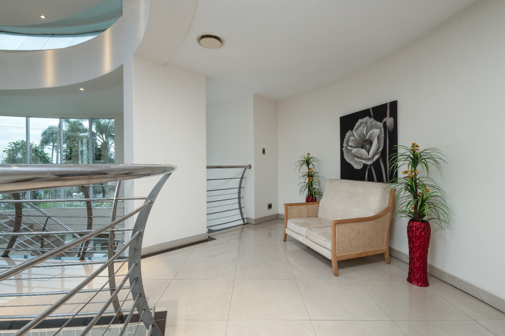 Step from the main bedroom onto a suspended bridge supported by concrete columns overlooking the heated pool that leads to a viewing tower over seeing Pavillion Mall ,the Durban Harbour skyline and distant sea views. A perfect spot to relax and unwind.