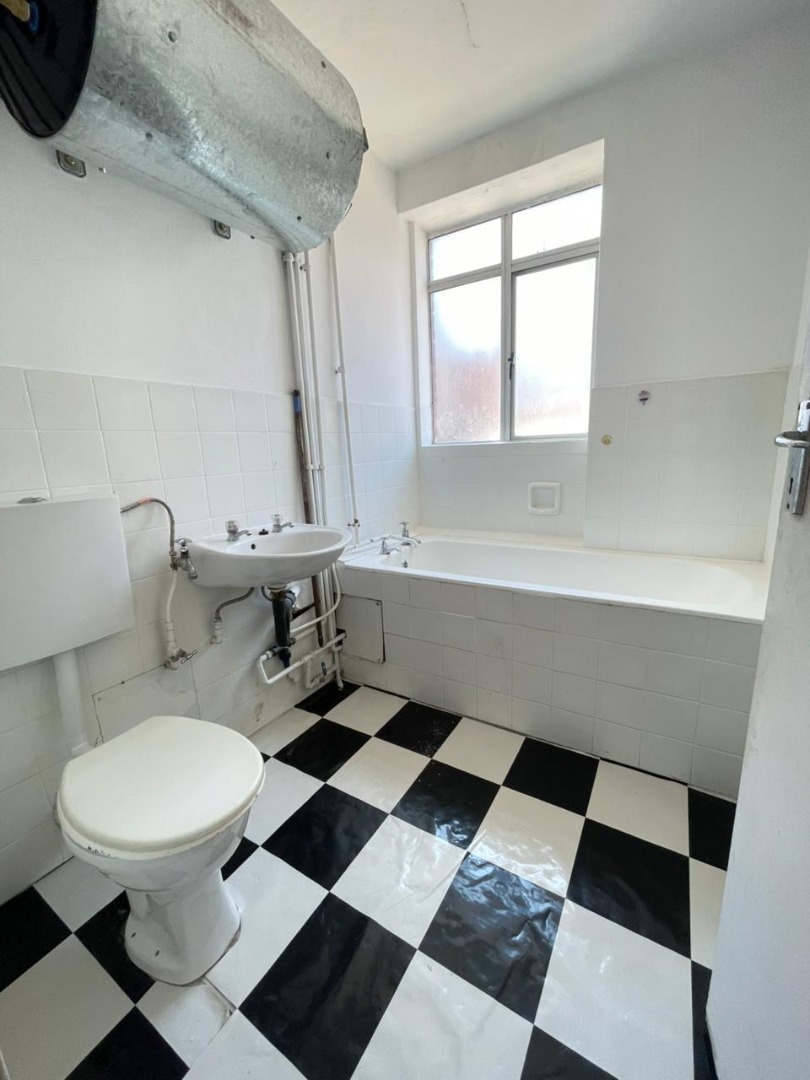 This apartment features three bedrooms, two with built-in cupboards. The main bedroom offers an enclosed balcony with sea views — ideal as a private retreat or additional living space — and an en-suite bathroom with a bathtub. A second bathroom, also fitted with a bathtub, services the rest of the apartment.