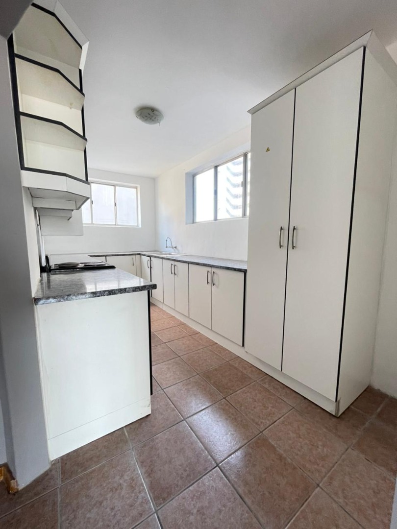 The tiled kitchen is neatly fitted with spacious white built-in cupboards and includes a stove, creating a practical and functional cooking space.