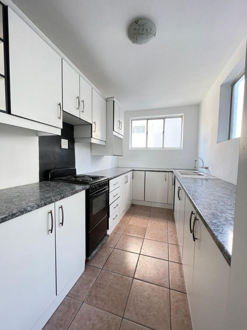 The tiled kitchen is neatly fitted with spacious white built-in cupboards and includes a stove, creating a practical and functional cooking space.
