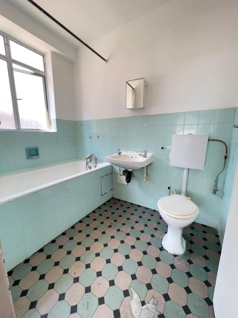 This apartment features three bedrooms, two with built-in cupboards. The main bedroom offers an enclosed balcony with sea views — ideal as a private retreat or additional living space — and an en-suite bathroom with a bathtub. A second bathroom, also fitted with a bathtub, services the rest of the apartment.
