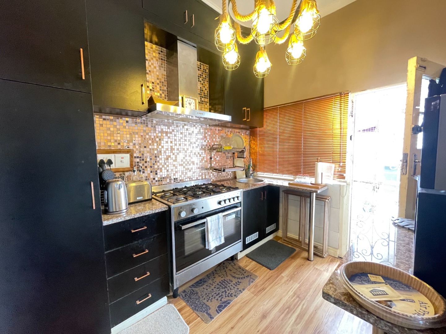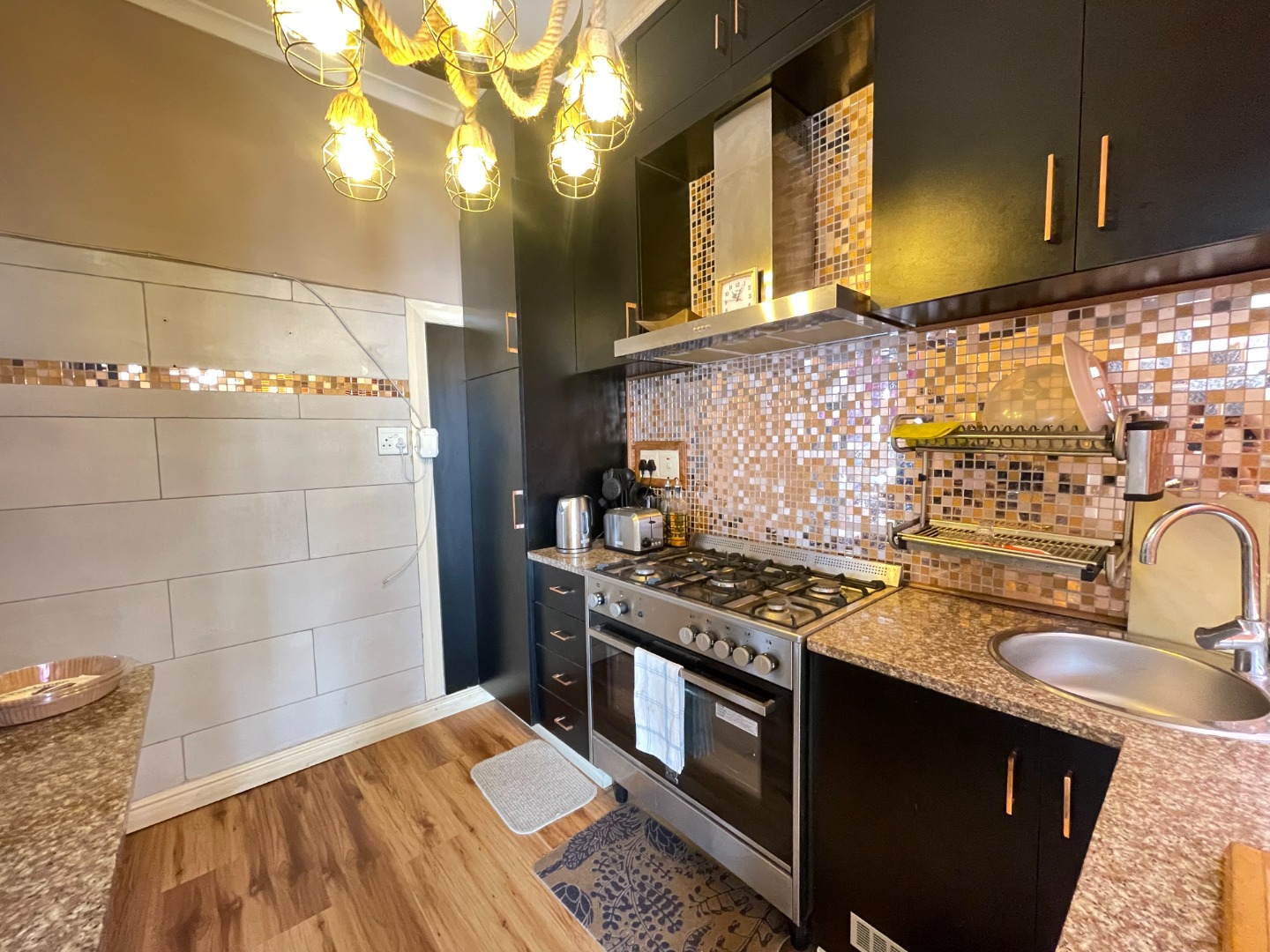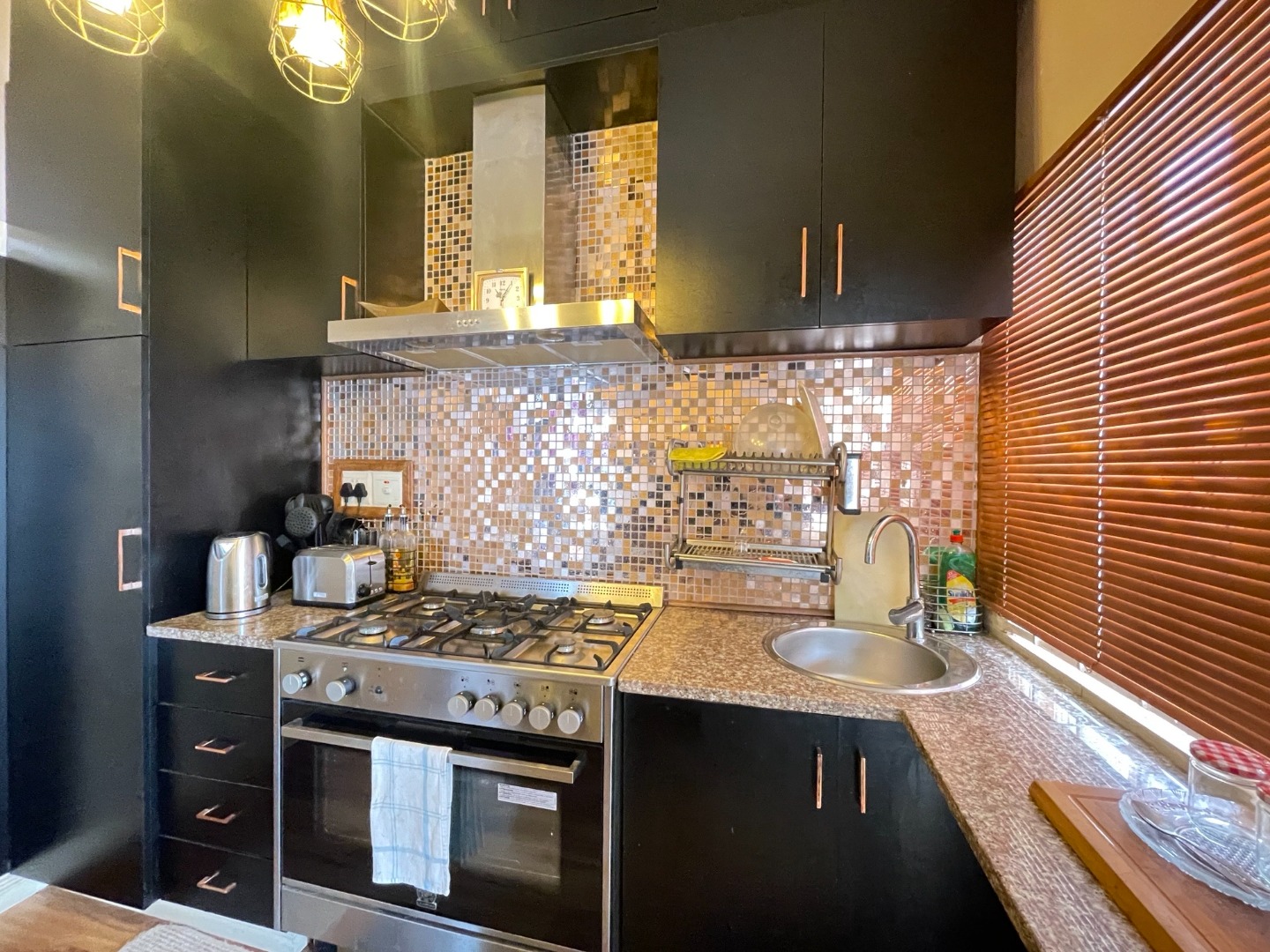 The kitchen is finished with wall tiles and a backsplash on one side, and includes built-in cupboards, a gas stove and hob, and blinds for privacy and light control.