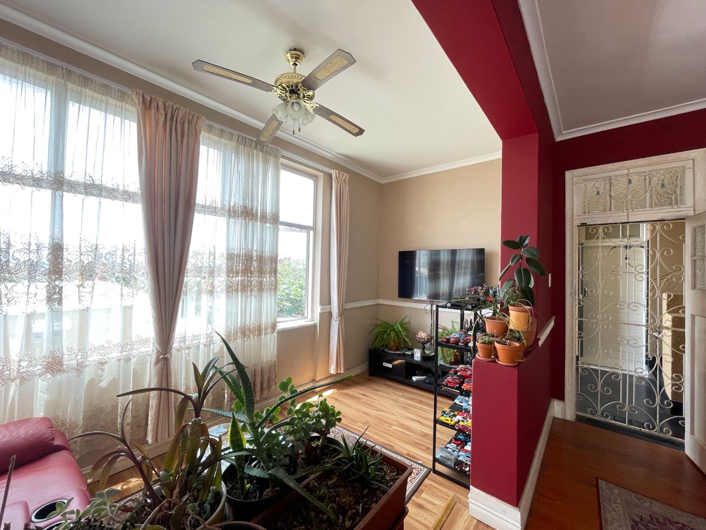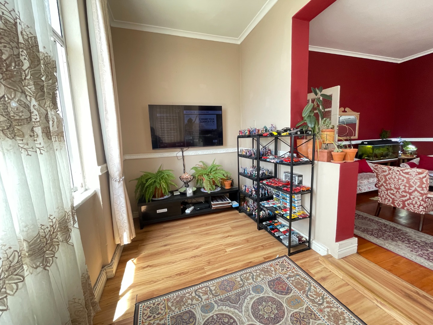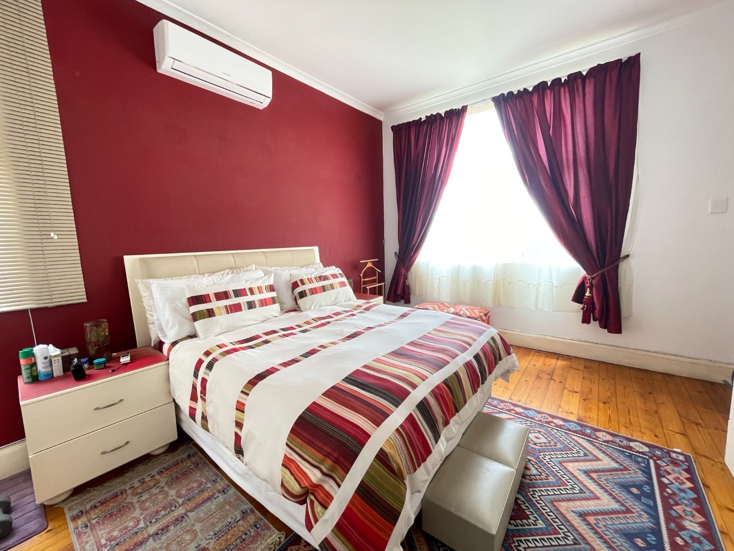 The main bedroom is fitted with an air conditioner and offers two windows, one with blinds and the other with a curtain, allowing flexibility for natural light and ventilation.