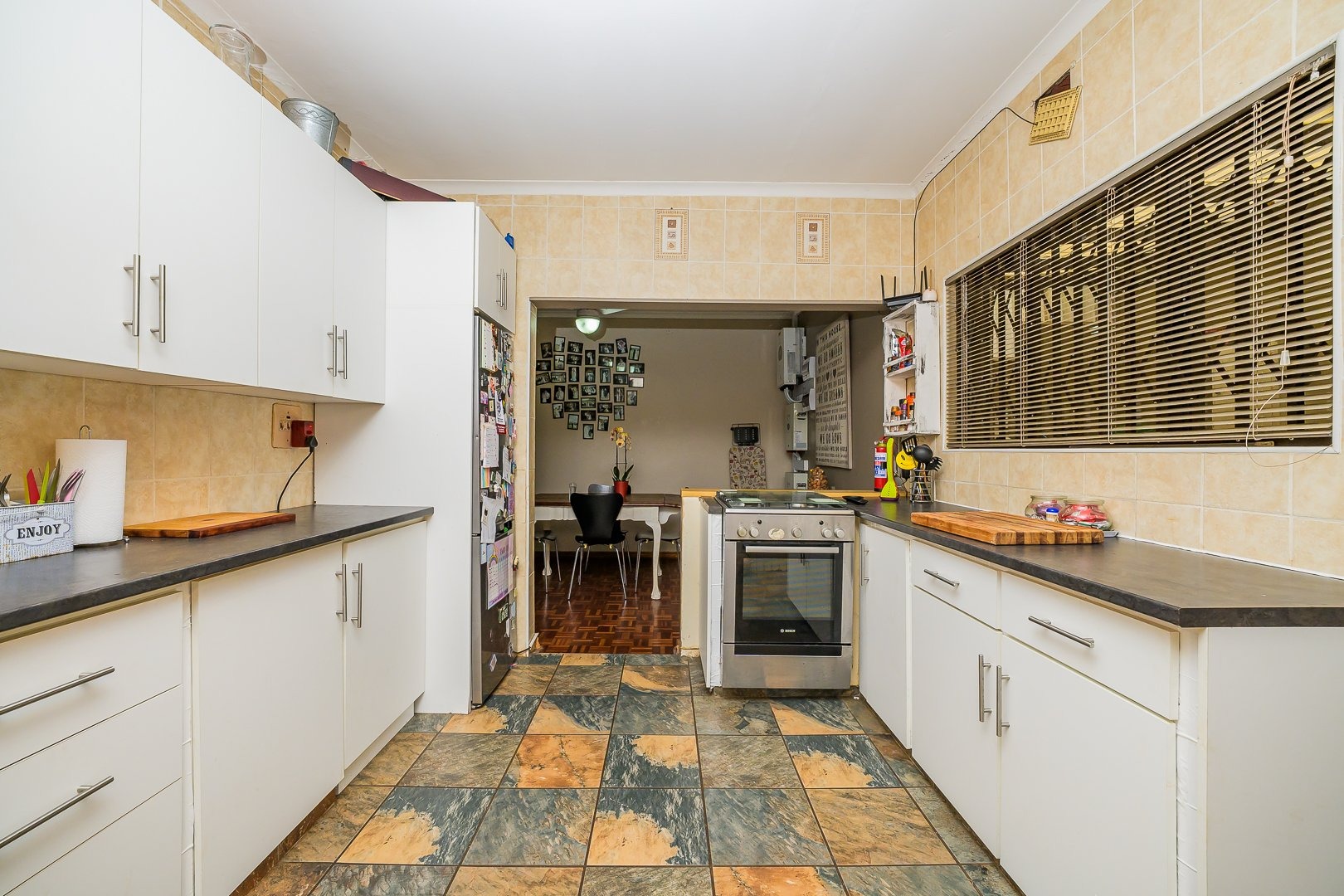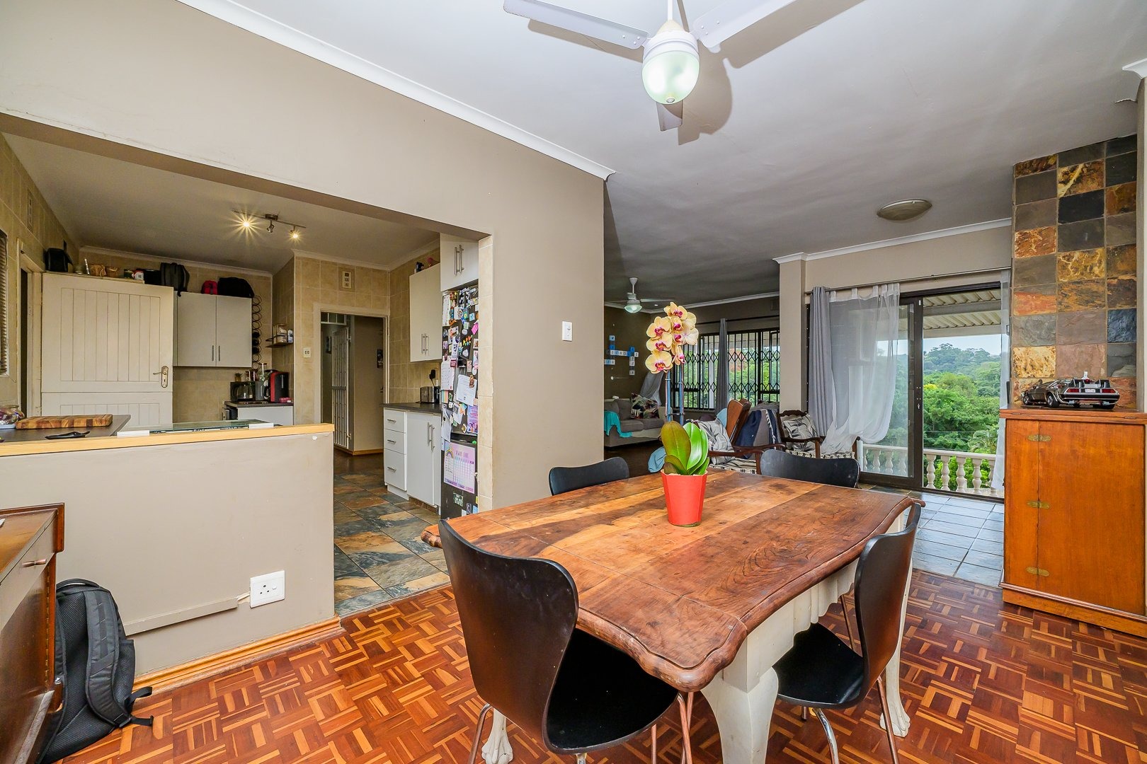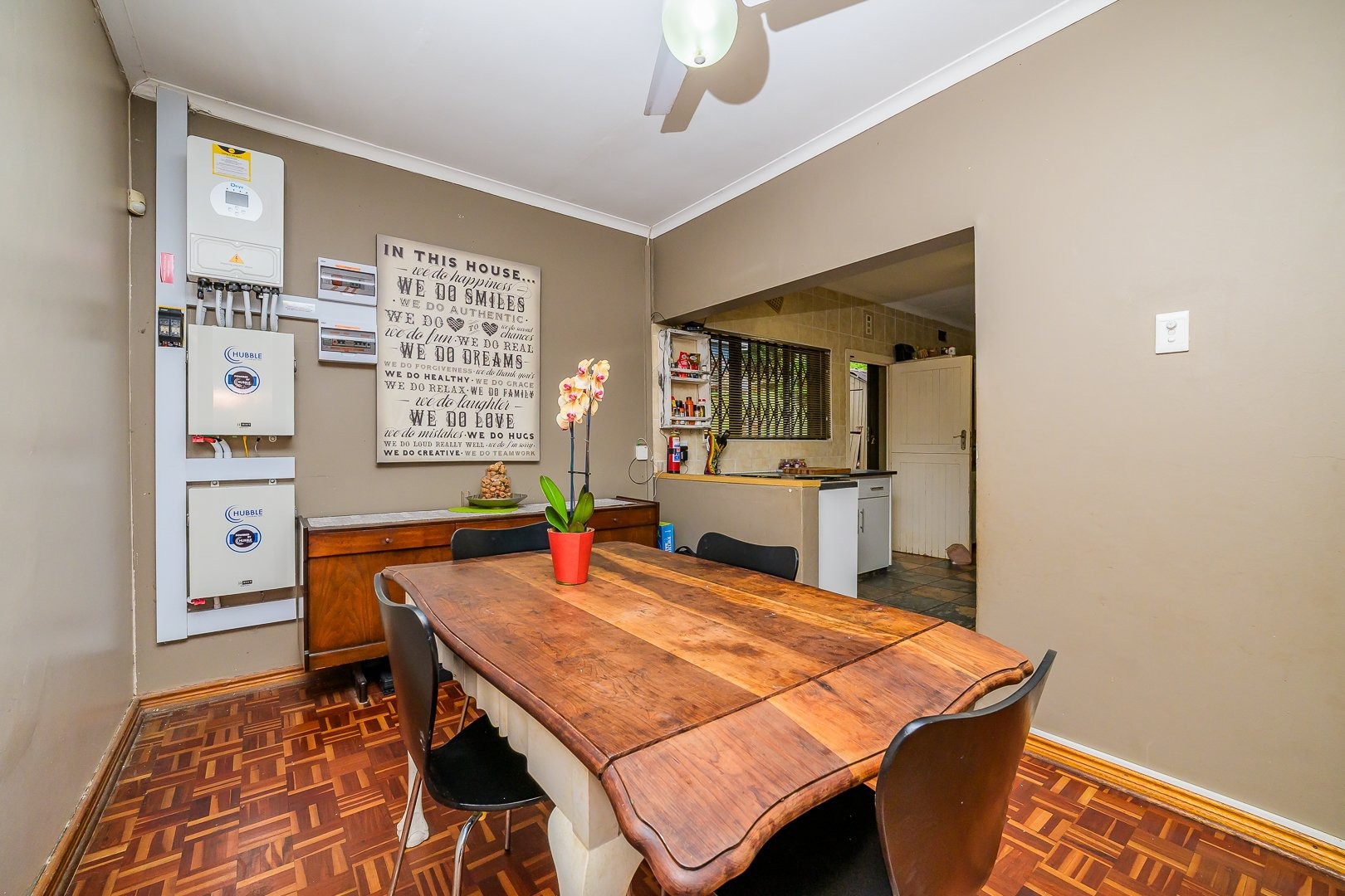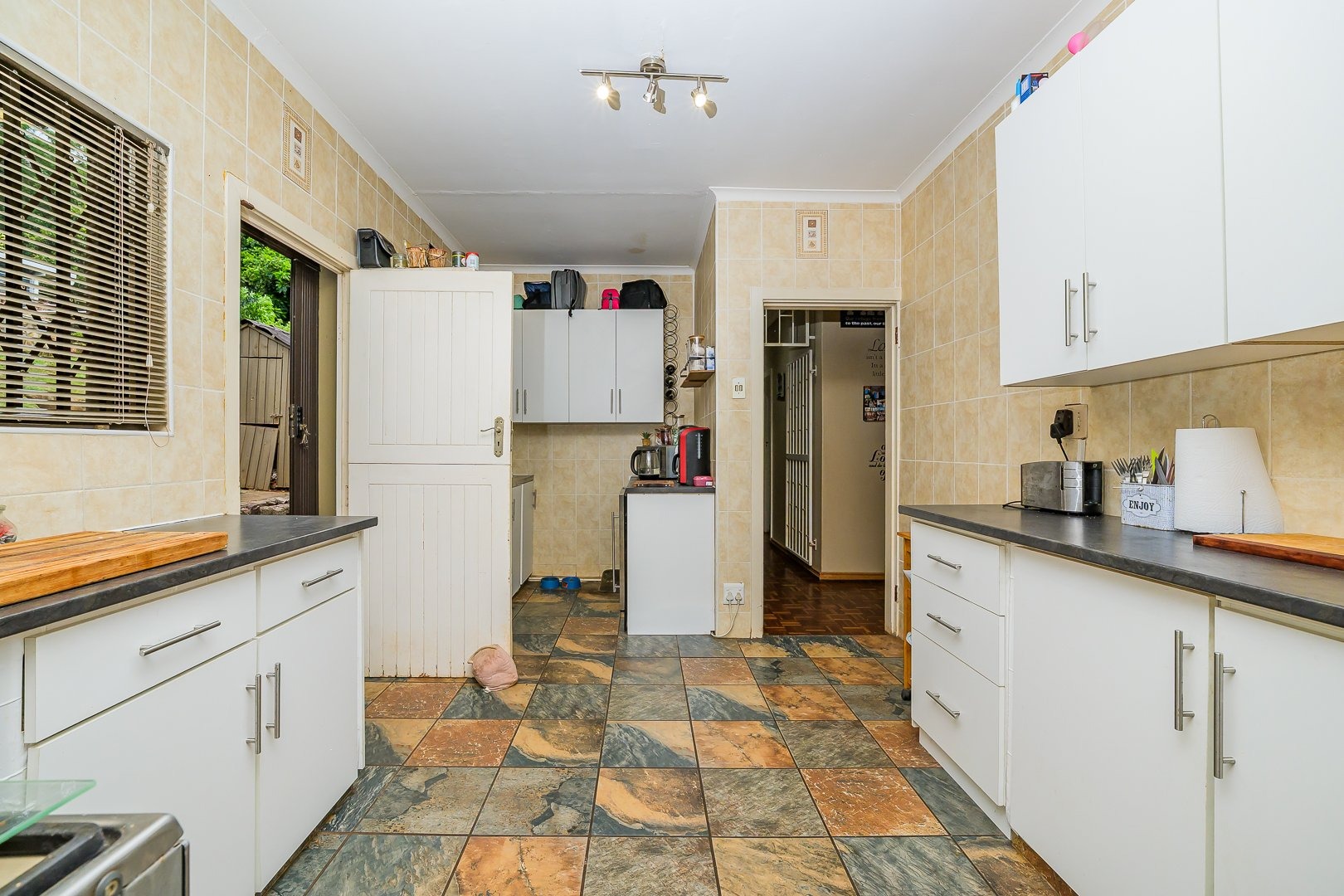 The open plan kitchen provides ample cupboard space and a separate scullery, leading to an undercover area that connects to the domestic quarters.