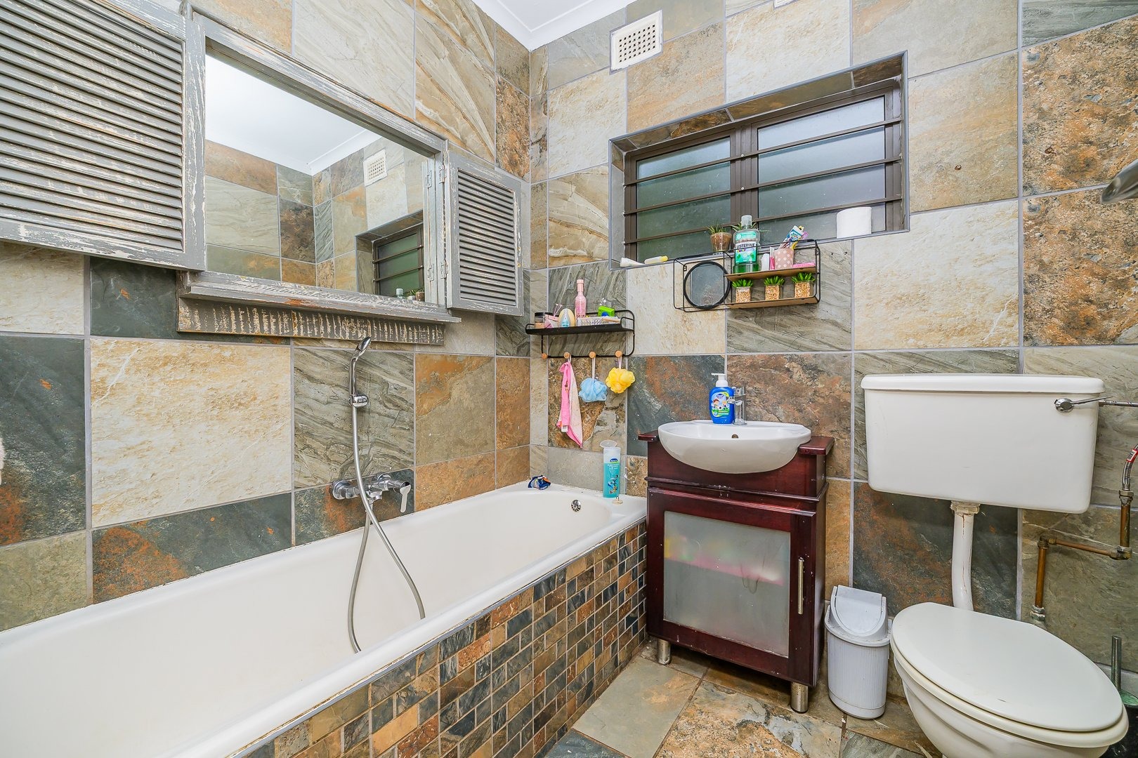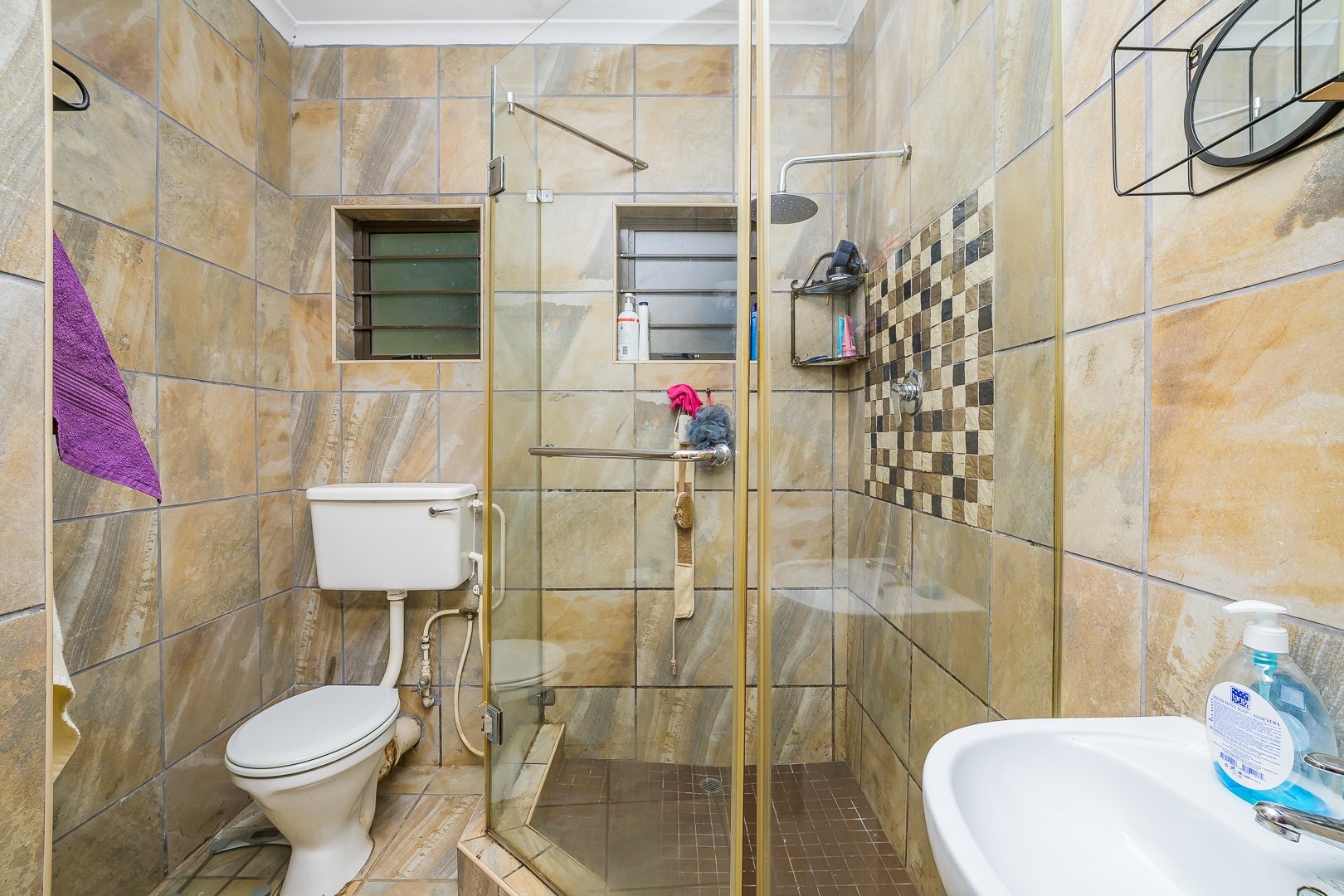 This home includes three bedrooms and two bathrooms — one bathroom with bath and toilet, and the other with shower and toilet.
