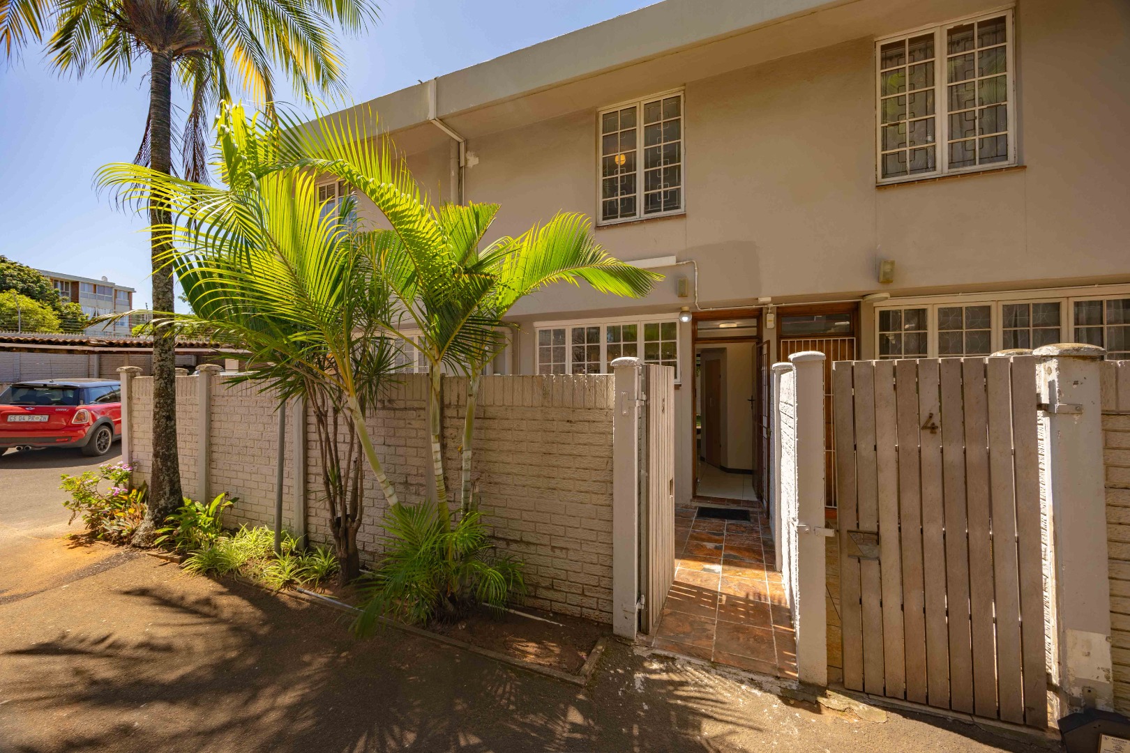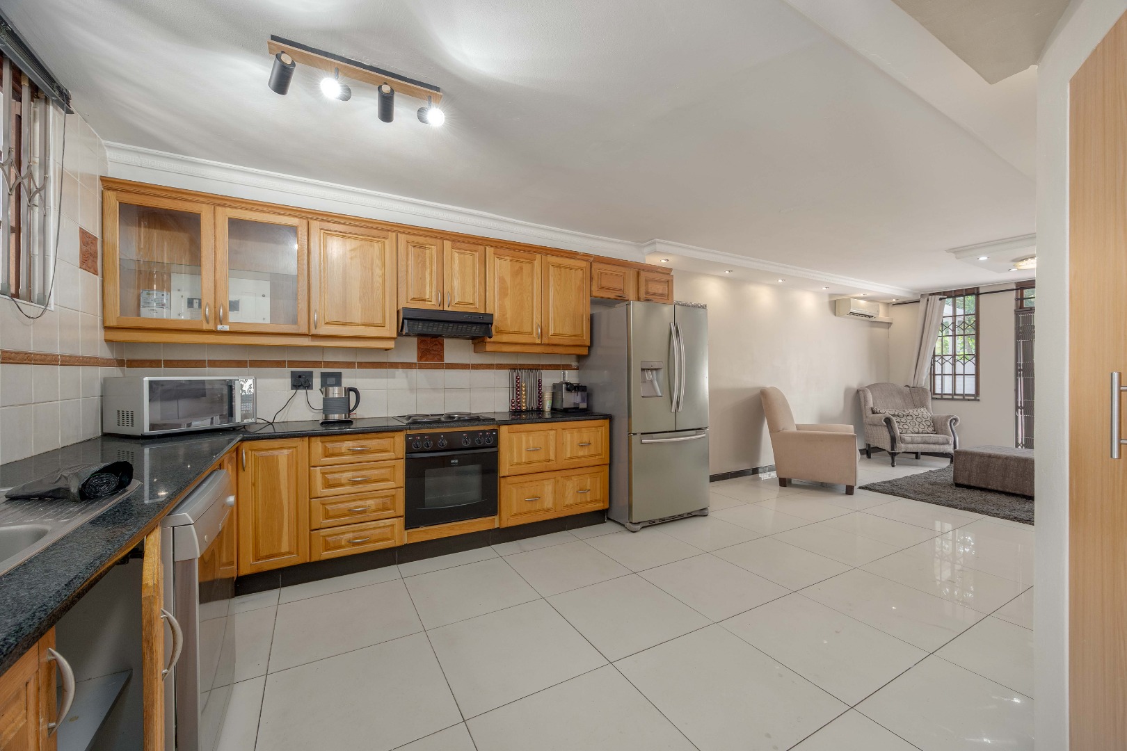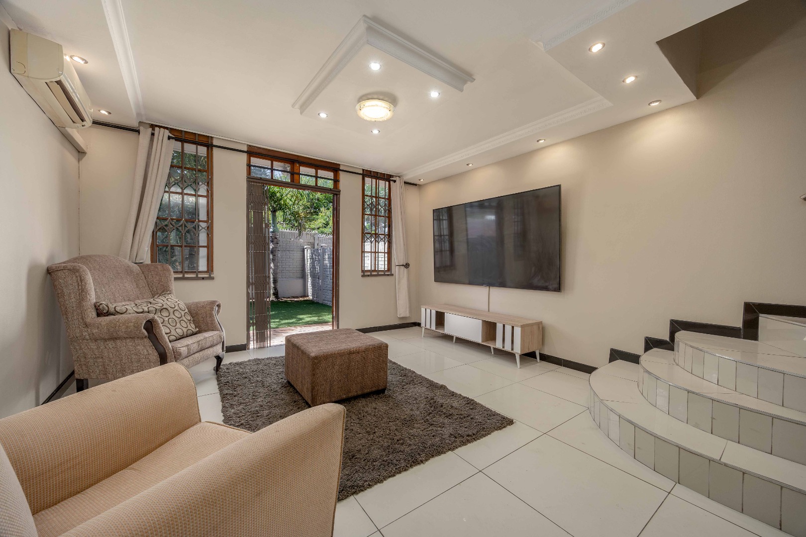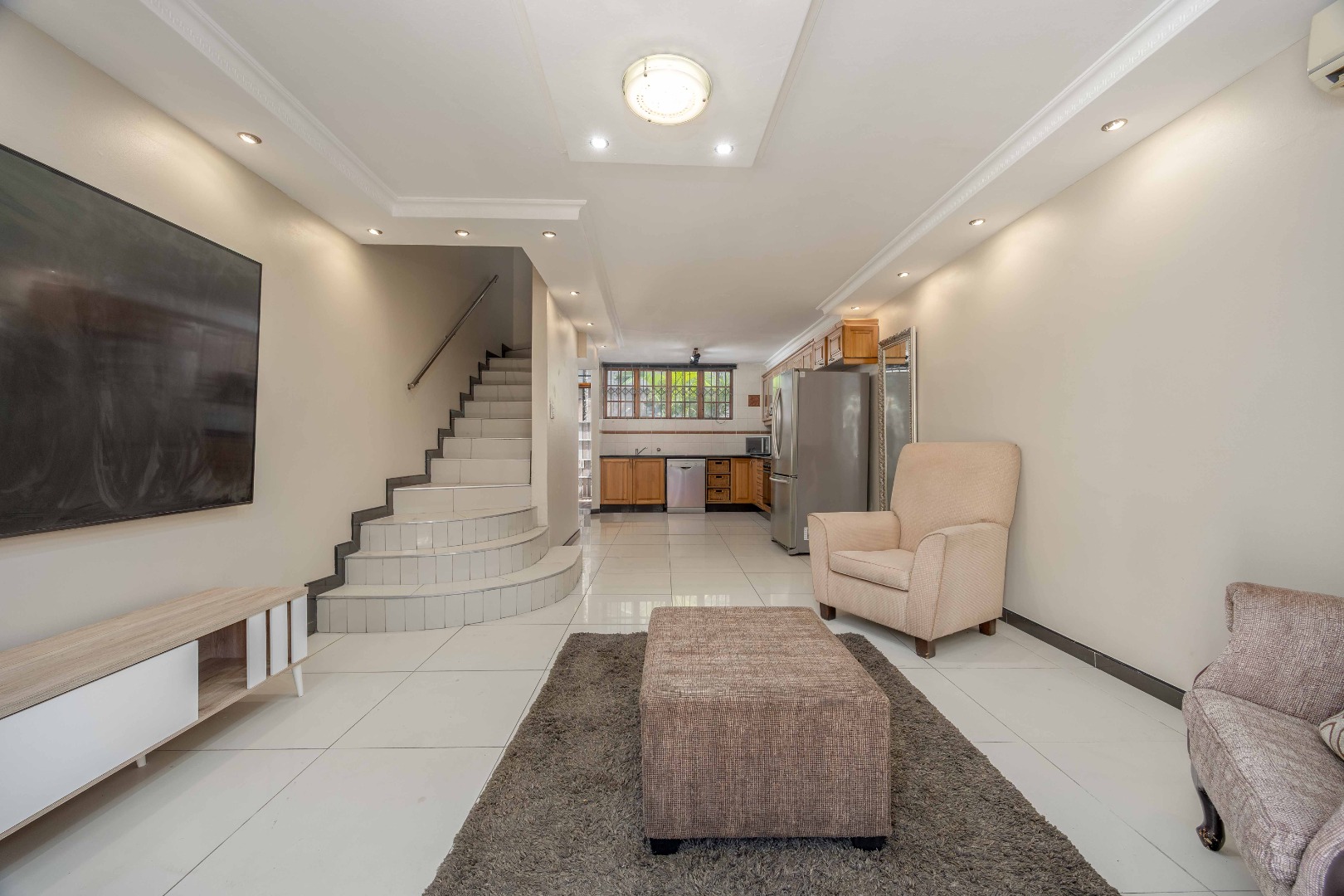 Enter through a private tiled courtyard leading into an open-plan kitchen and lounge that can easily accommodate a dining table. The kitchen is fitted with built-in cupboards, a stove, hob, and a washing machine connection, making it practical for everyday living. The lounge features an air conditioner and modern downlights.