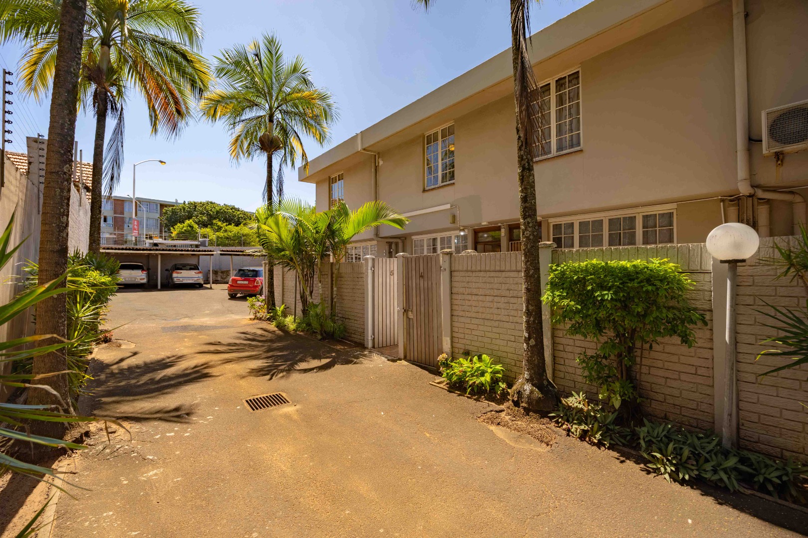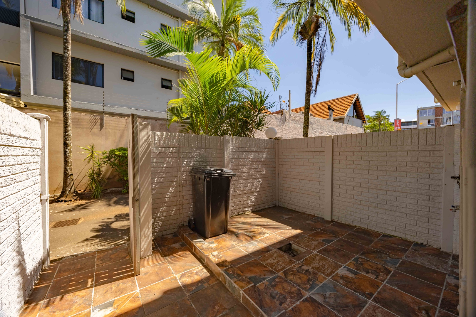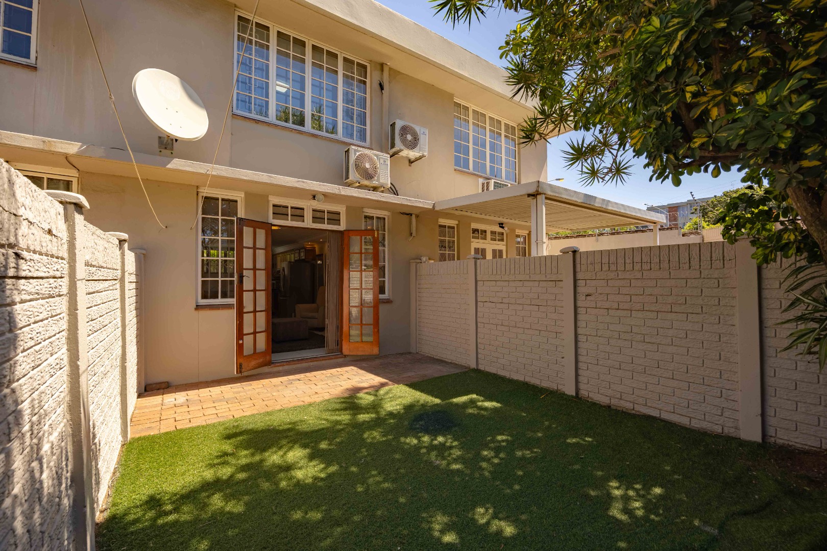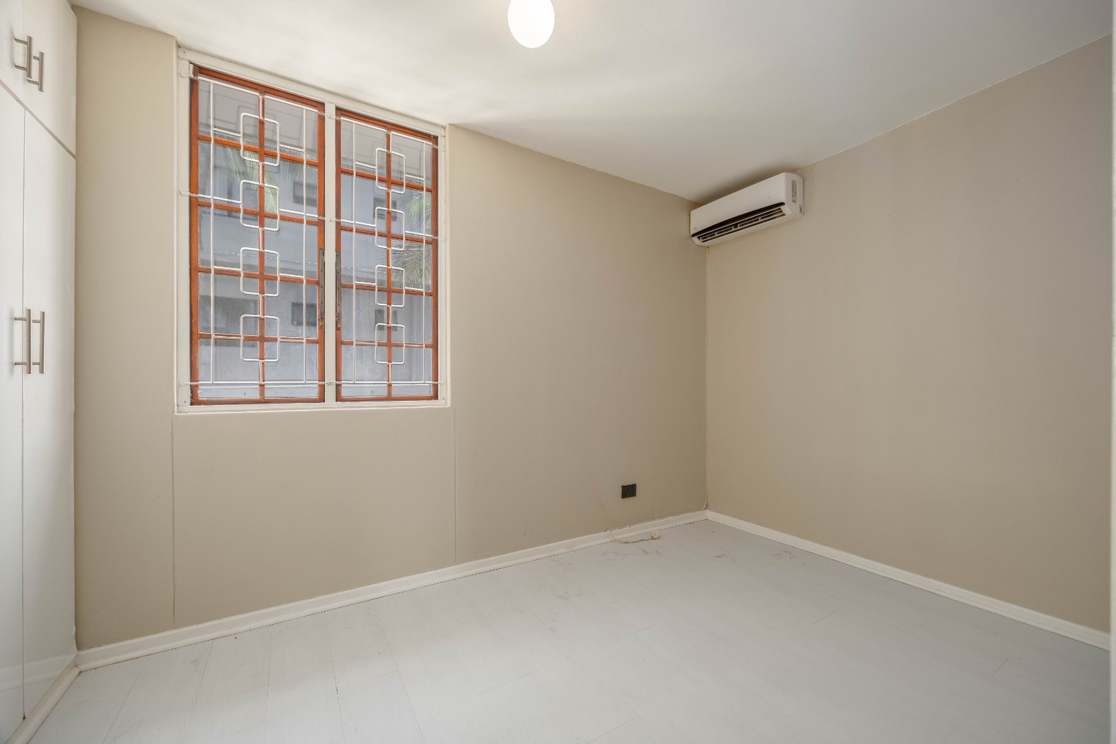 Enter through a private tiled courtyard leading into an open-plan kitchen and lounge that can easily accommodate a dining table. The kitchen is fitted with built-in cupboards, a stove, hob, and a washing machine connection, making it practical for everyday living. The lounge features an air conditioner and modern downlights.