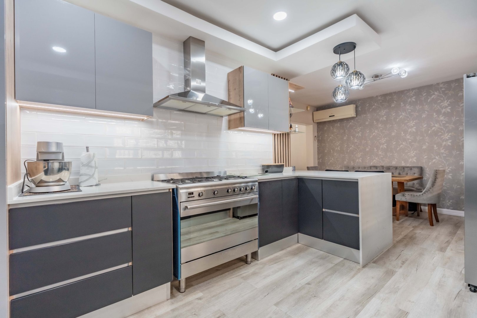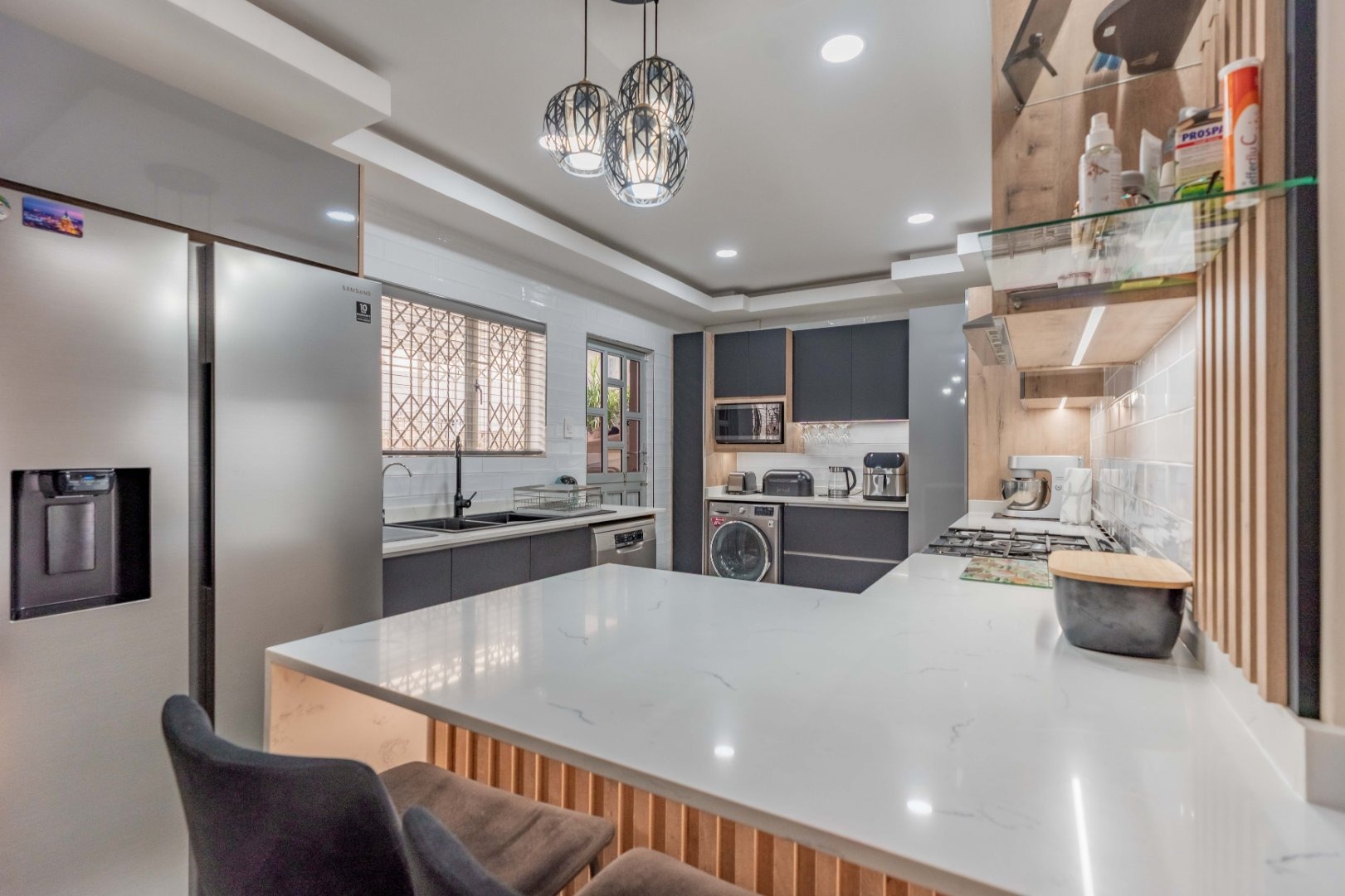 Caesarstone waterfall countertops, gas hob, sleek cabinetry, and ambient designer lighting create a bright, contemporary heart of the home.