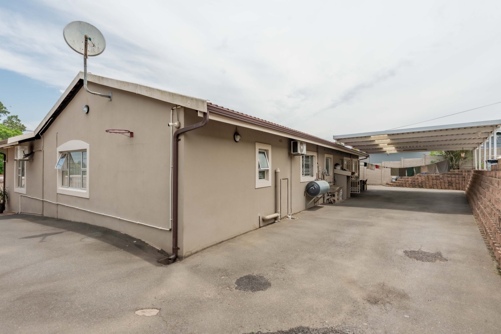 Tarred driveway leads to an immaculate double garage with premium tiling, a 3-car carport, and abundant secure parking behind the home.