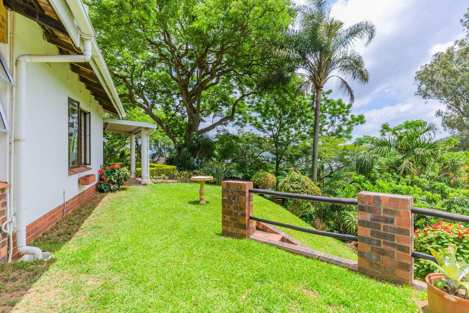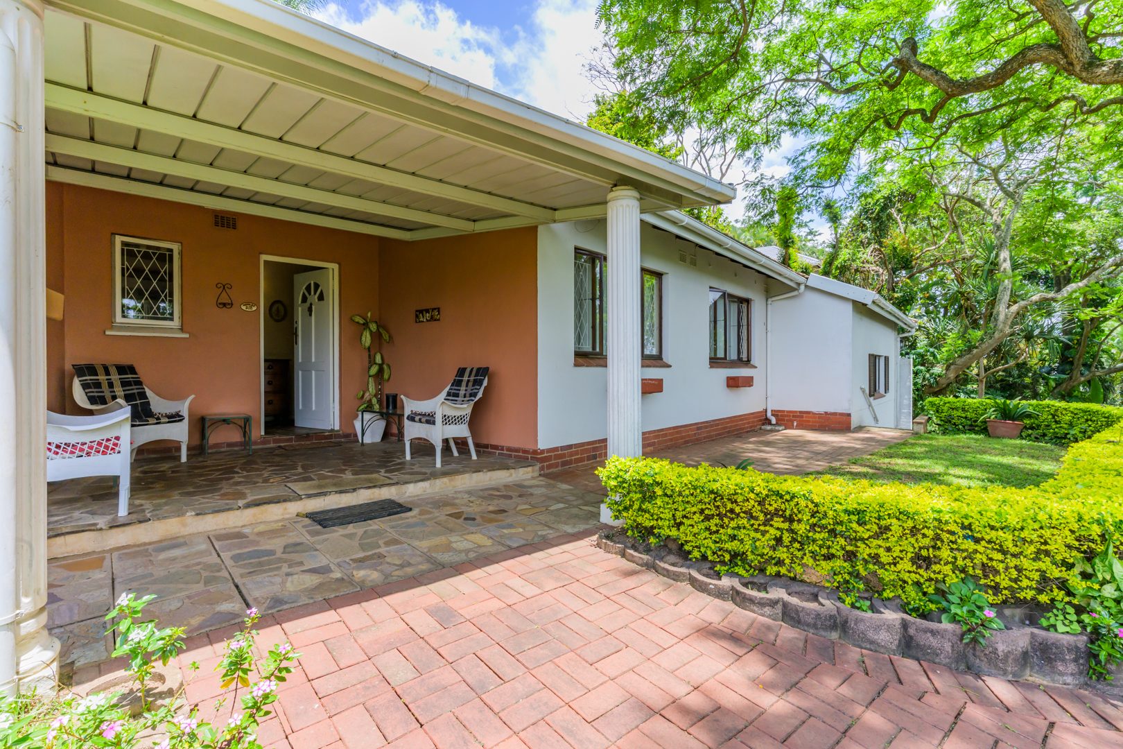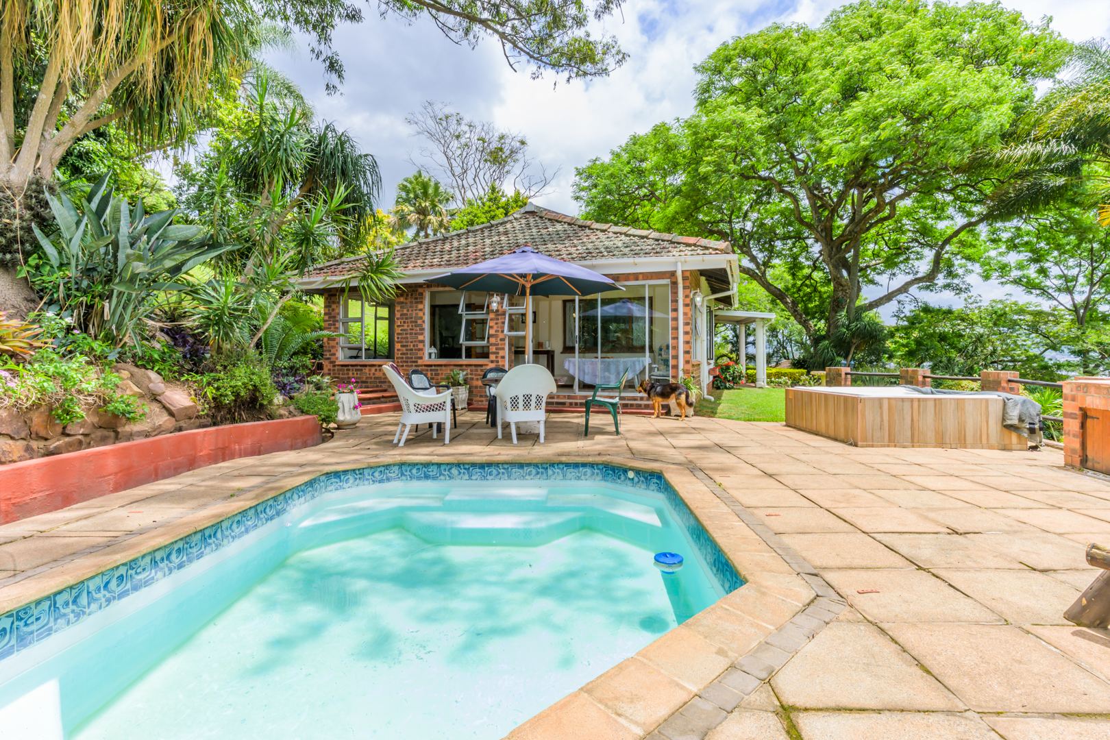 Welcome to this charming and versatile family home set above road level, offering space, comfort and beautiful views. The main house features 3 well-sized bedrooms and 2 bathrooms, including a warm and inviting flow from the entrance hall into the open-plan lounge and dining room. An enclosed veranda extends your living space and leads straight out to the sparkling pool, jacuzzi, and built-in braai — perfect for entertaining and enjoying our gorgeous KZN sunsets.