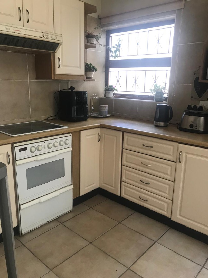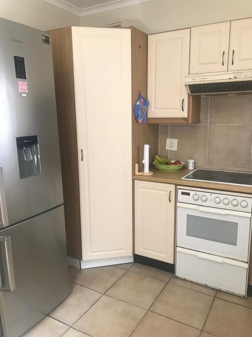 The kitchen is well-fitted with cabinets, u.c.o./ hob and a large pantry cupboard.