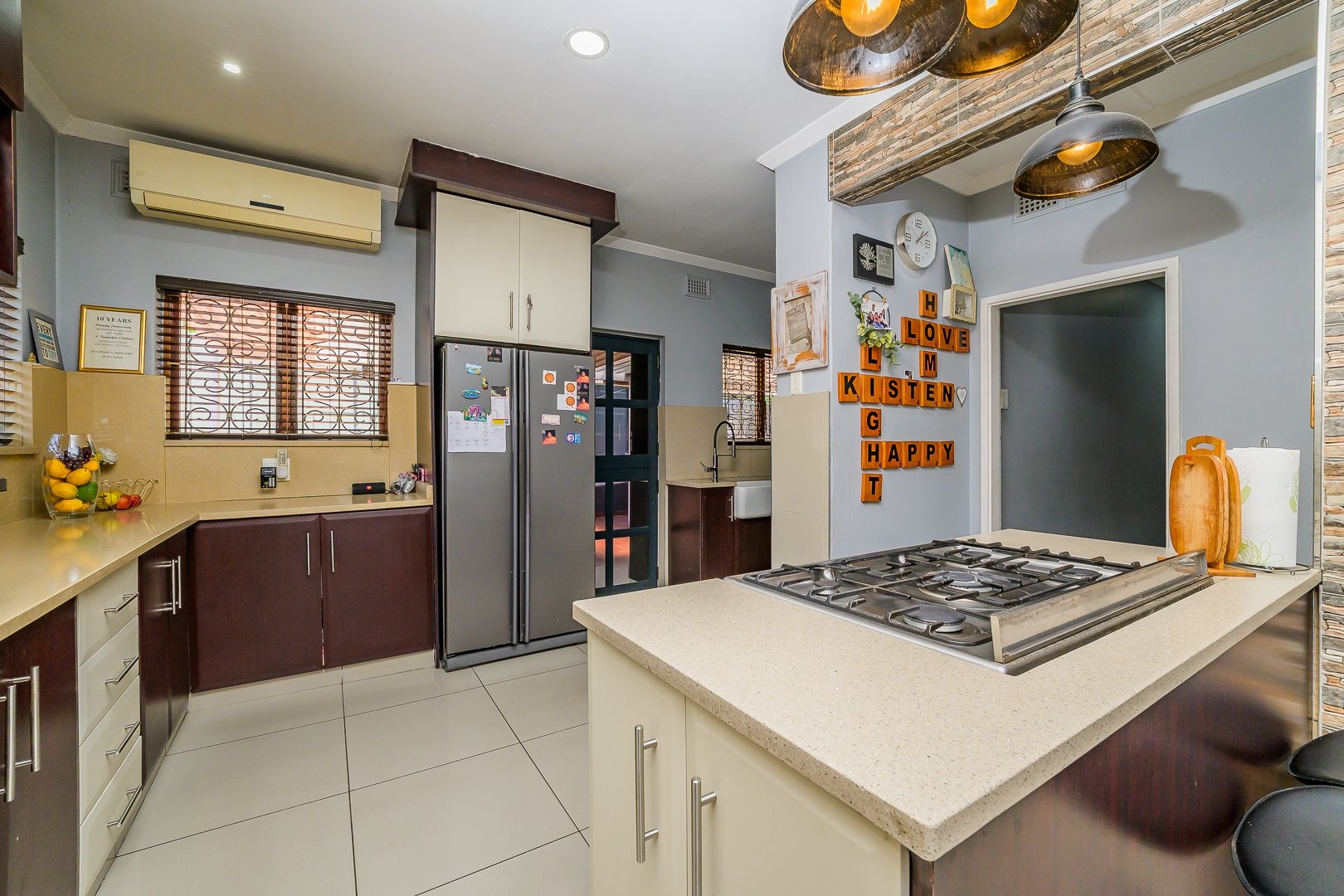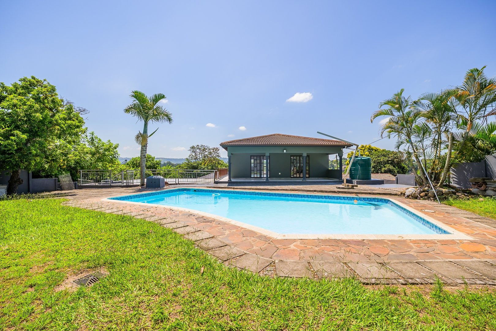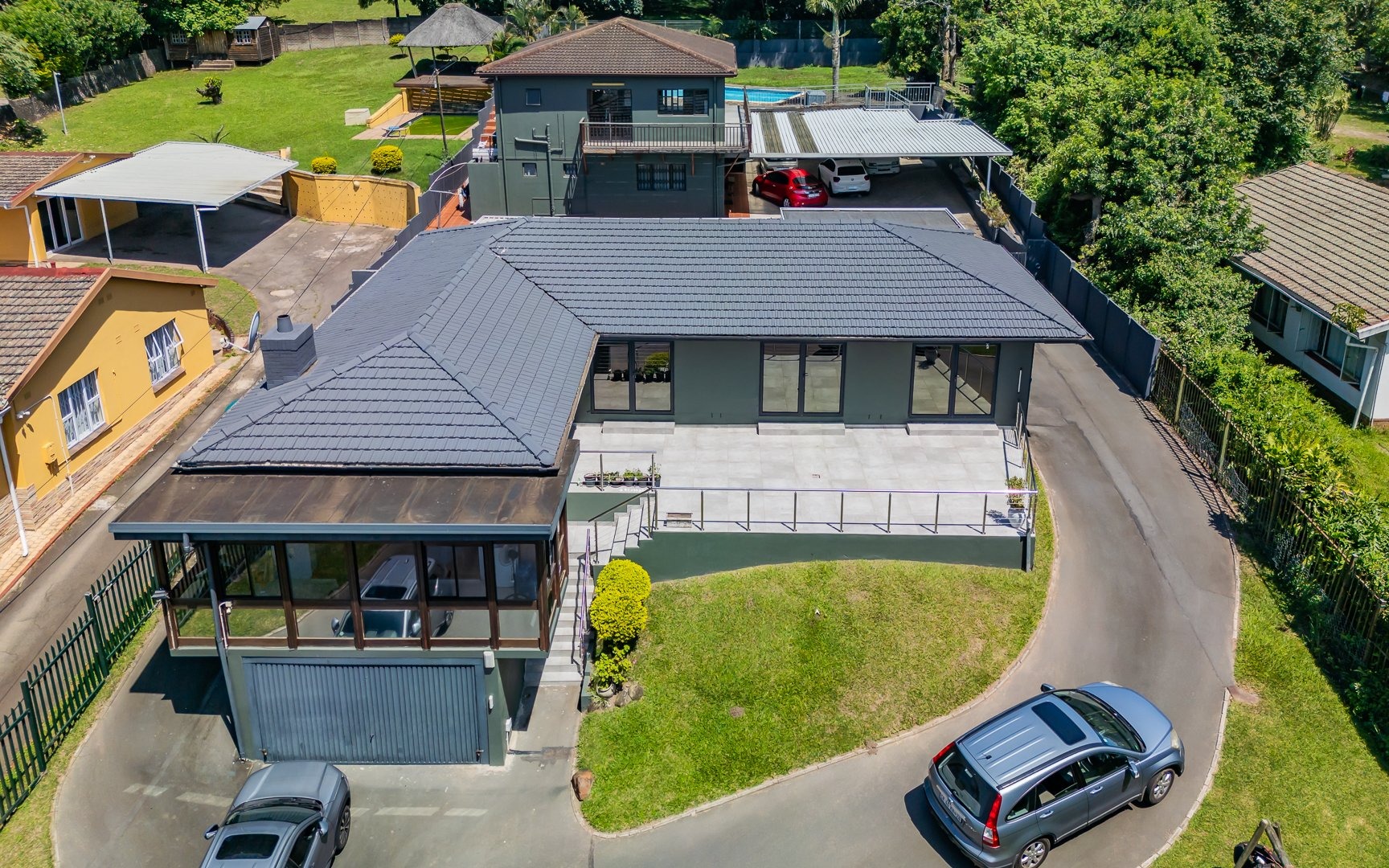 This multi-level residence in Farningham Ridge, Pinetown, offers a compelling blend of modern design and practical living. The property immediately impresses with its distinctive architecture, featuring a sleek, modern exterior and a prominent glass-enclosed veranda or sunroom that enhances its kerb appeal. A winding paved driveway leads to ample parking, including two garages and space for up to eight vehicles, all set amidst lush green surroundings and mature trees. Inside, the home provides a functional and comfortable layout, ideal for family living. It features a dedicated lounge and a dining room, complemented by a well-appointed kitchen. The interior spaces benefit from good natural light, often enhanced by modern recessed lighting and durable hard flooring, creating a welcoming atmosphere throughout. Accommodation comprises four spacious bedrooms and three bathrooms, ensuring comfort and privacy for all residents. Several bedrooms are equipped with air conditioning units for climate control and feature built-in wardrobes for convenient storage. The bathrooms are fully tiled, offering a clean and low-maintenance environment, with one featuring a glass-enclosed shower stall. Outdoor living is a highlight, with a well-maintained swimming pool providing a refreshing escape. The property boasts a large covered patio or deck, perfect for entertaining or relaxing while enjoying the garden views. Extensive paved areas around the pool and garden ensure ease of maintenance and ample space for outdoor activities. Security is well-addressed with an alarm system, an access gate, and a perimeter fence. Additional security features include security bars on windows and security gates, providing peace of mind. Farningham Ridge is a well-established residential area within Pinetown, known for its family-friendly environment and convenient access to local amenities and transport routes. Key Features: * 4 Bedrooms, 3 Bathrooms * 1 Lounge, 1 Dining Room, 1 Kitchen * 2 Garages, 8 Parking Spaces * Swimming Pool * Glass-enclosed Veranda/Sunroom * Large Covered Patio/Deck * Alarm System, Access Gate, Fence * Air Conditioning Units in Bedrooms * Paved Driveway and Outdoor Areas