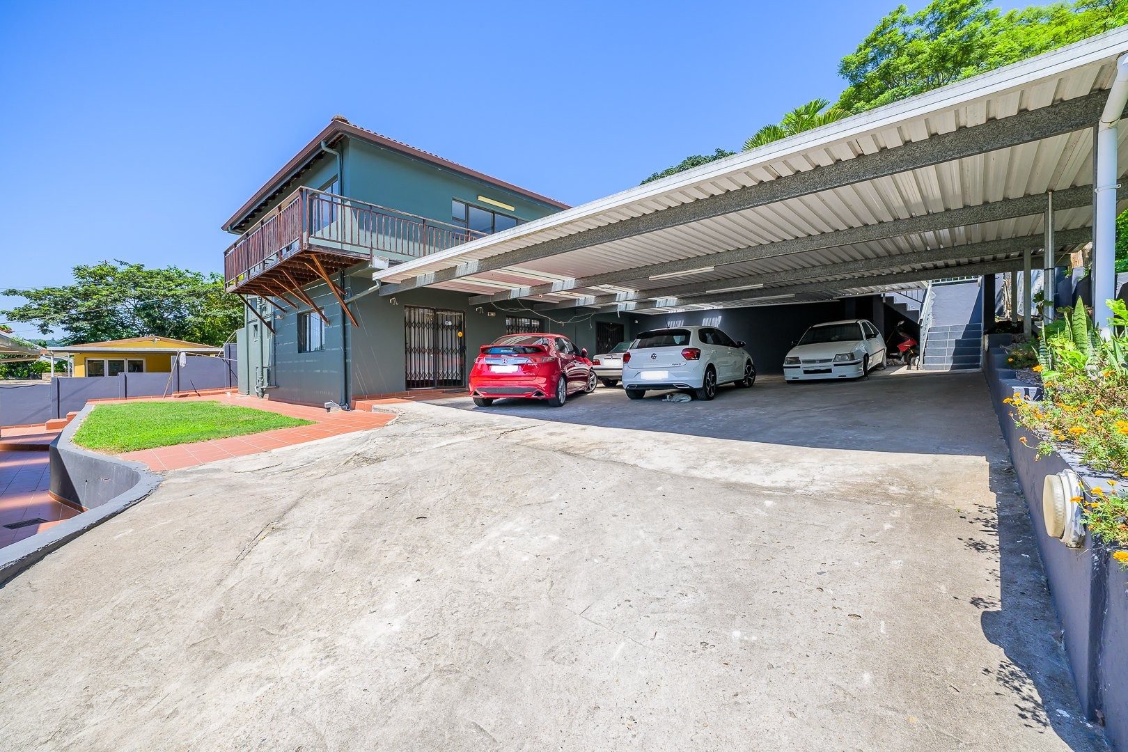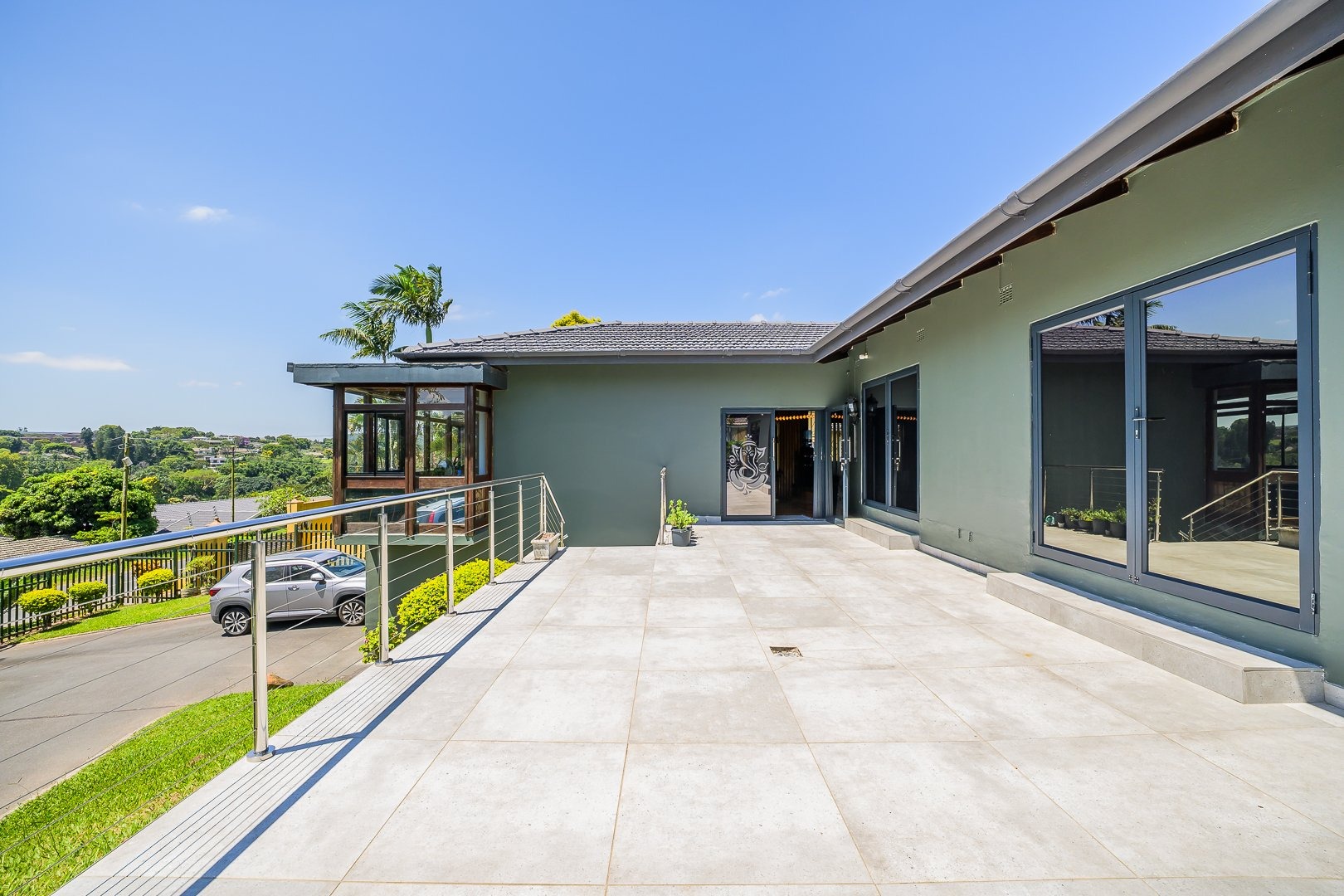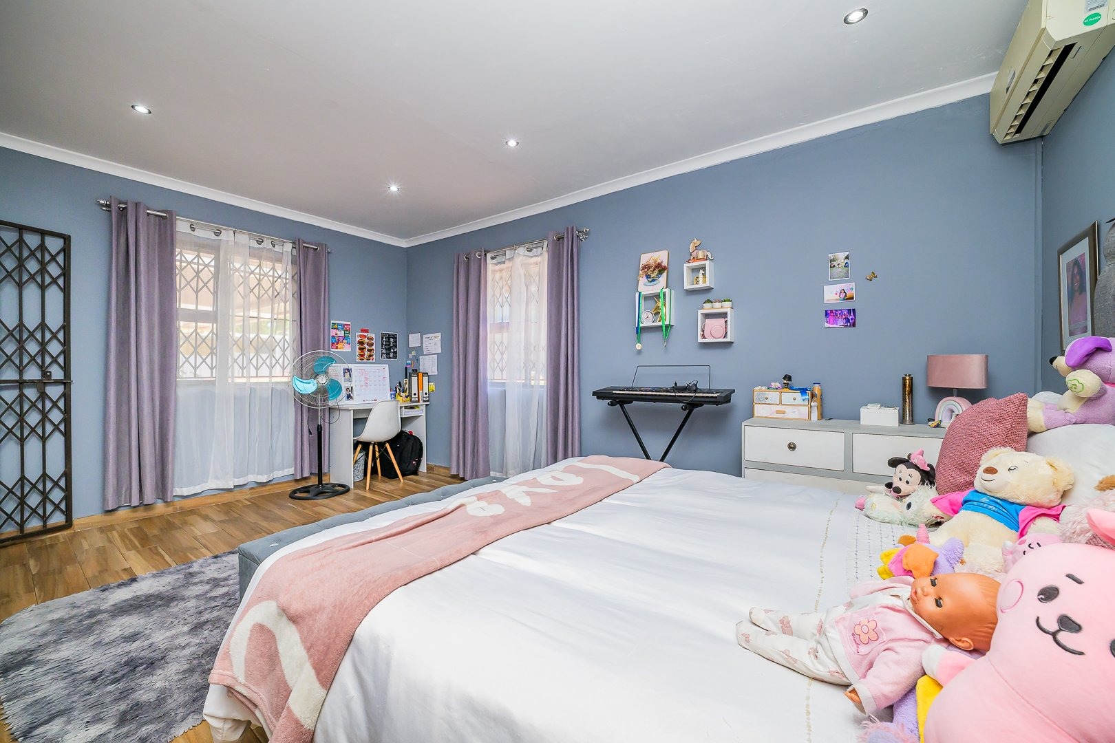 This multi-level residence in Farningham Ridge, Pinetown, offers a compelling blend of modern design and practical living. The property immediately impresses with its distinctive architecture, featuring a sleek, modern exterior and a prominent glass-enclosed veranda or sunroom that enhances its kerb appeal. A winding paved driveway leads to ample parking, including two garages and space for up to eight vehicles, all set amidst lush green surroundings and mature trees. Inside, the home provides a functional and comfortable layout, ideal for family living. It features a dedicated lounge and a dining room, complemented by a well-appointed kitchen. The interior spaces benefit from good natural light, often enhanced by modern recessed lighting and durable hard flooring, creating a welcoming atmosphere throughout. Accommodation comprises four spacious bedrooms and three bathrooms, ensuring comfort and privacy for all residents. Several bedrooms are equipped with air conditioning units for climate control and feature built-in wardrobes for convenient storage. The bathrooms are fully tiled, offering a clean and low-maintenance environment, with one featuring a glass-enclosed shower stall. Outdoor living is a highlight, with a well-maintained swimming pool providing a refreshing escape. The property boasts a large covered patio or deck, perfect for entertaining or relaxing while enjoying the garden views. Extensive paved areas around the pool and garden ensure ease of maintenance and ample space for outdoor activities. Security is well-addressed with an alarm system, an access gate, and a perimeter fence. Additional security features include security bars on windows and security gates, providing peace of mind. Farningham Ridge is a well-established residential area within Pinetown, known for its family-friendly environment and convenient access to local amenities and transport routes. Key Features: * 4 Bedrooms, 3 Bathrooms * 1 Lounge, 1 Dining Room, 1 Kitchen * 2 Garages, 8 Parking Spaces * Swimming Pool * Glass-enclosed Veranda/Sunroom * Large Covered Patio/Deck * Alarm System, Access Gate, Fence * Air Conditioning Units in Bedrooms * Paved Driveway and Outdoor Areas
