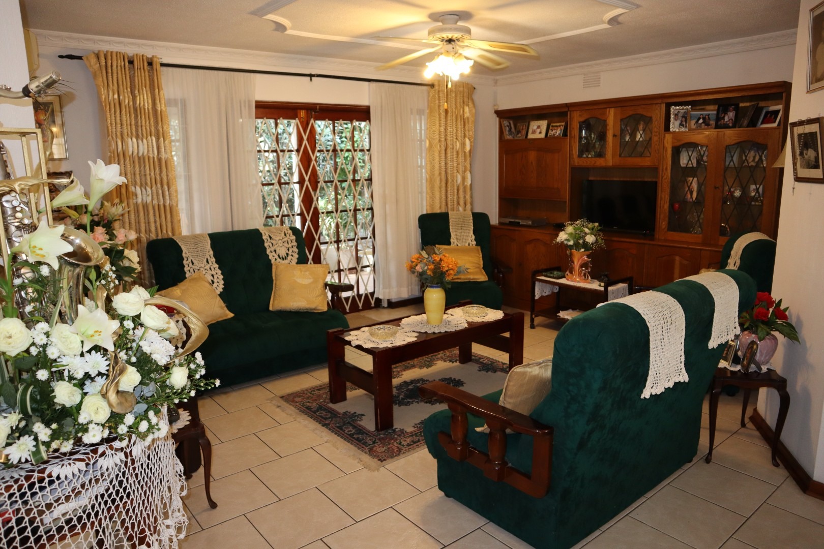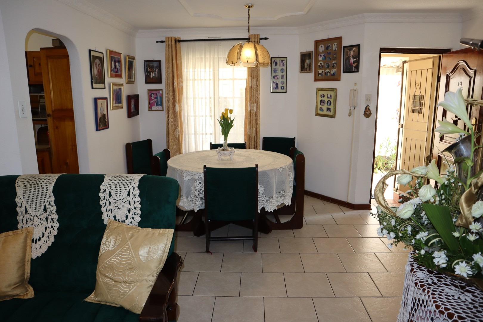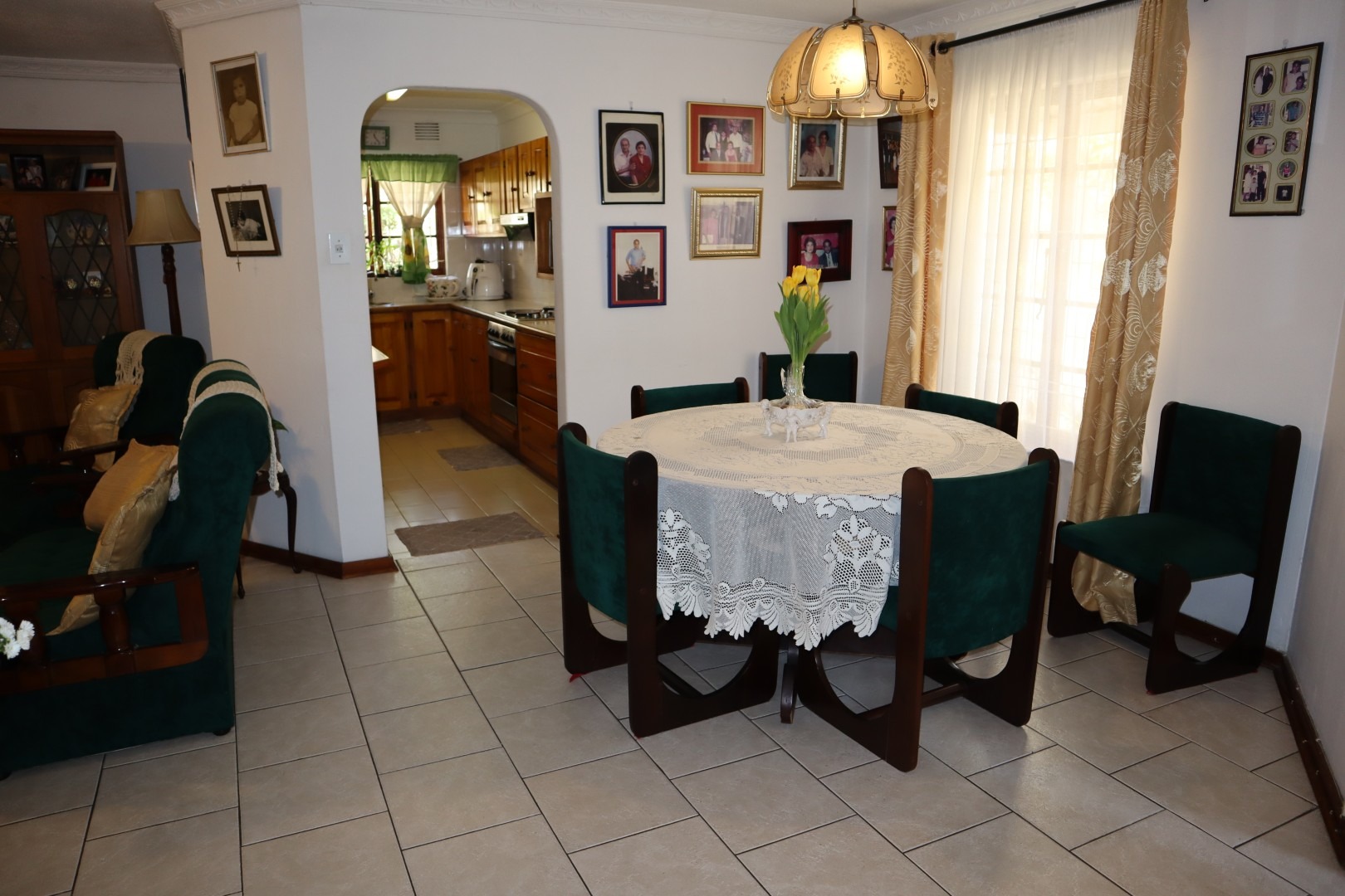 Fully tiled open plan lounge and dining room with French doors leading out to an under-cover patio, built in braai area and corner garden ideal for relaxing and unwinding.
