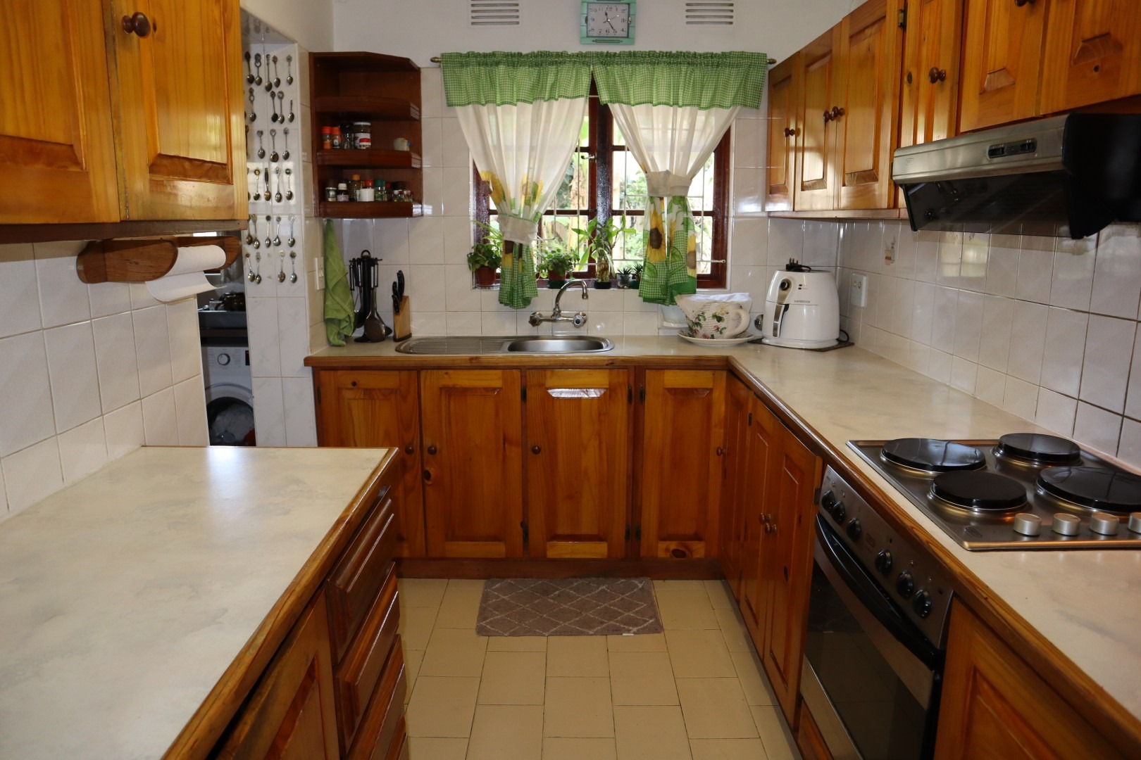The kitchen features a built-in oven, hob and extractor fan with a separate laundry and scullery area.