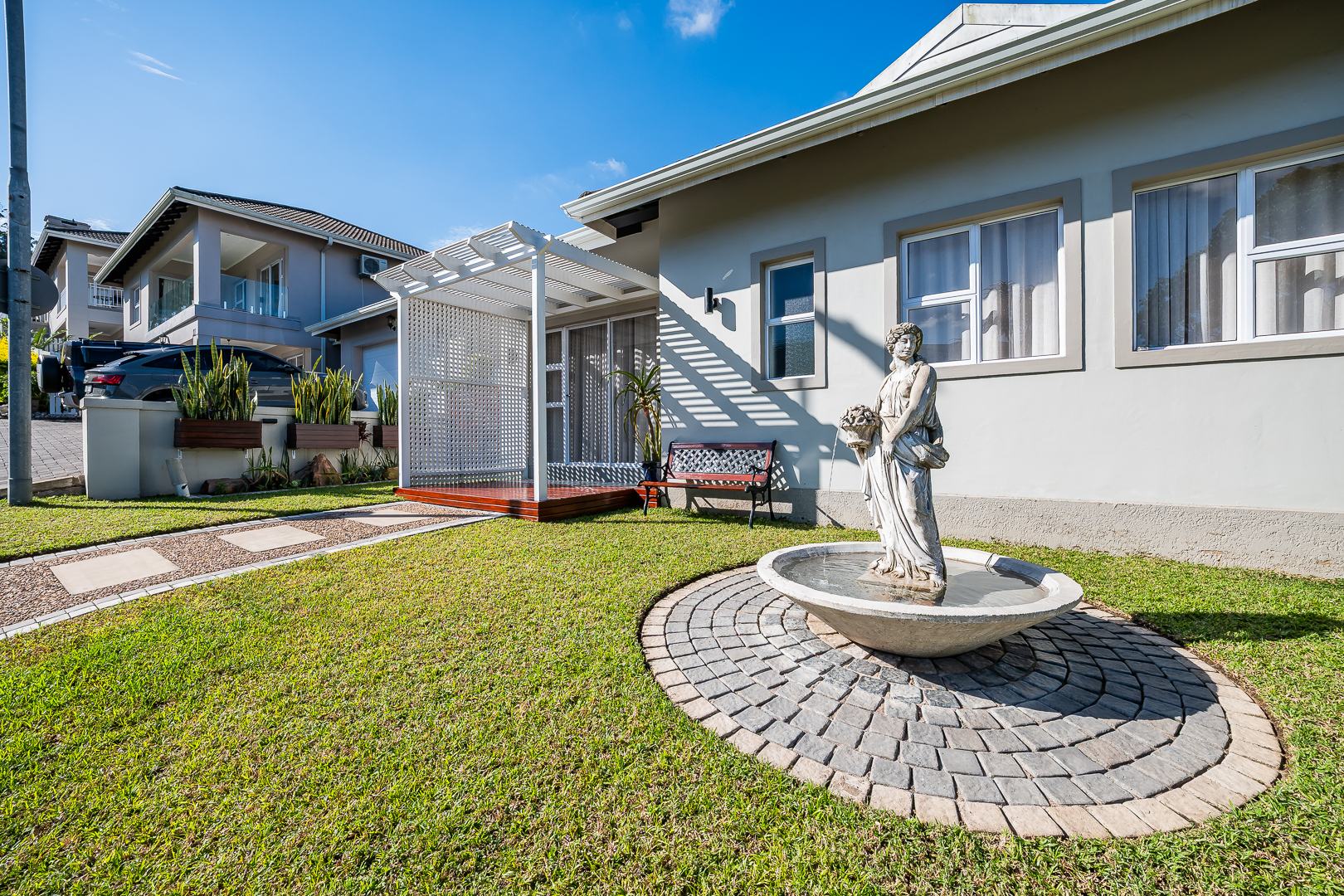 Step outside onto your private patio or take a stroll to the Roman water feature, nestled within a perfectly manicured garden. With lush surroundings and an elegant ambiance, this garden is your own serene retreat.