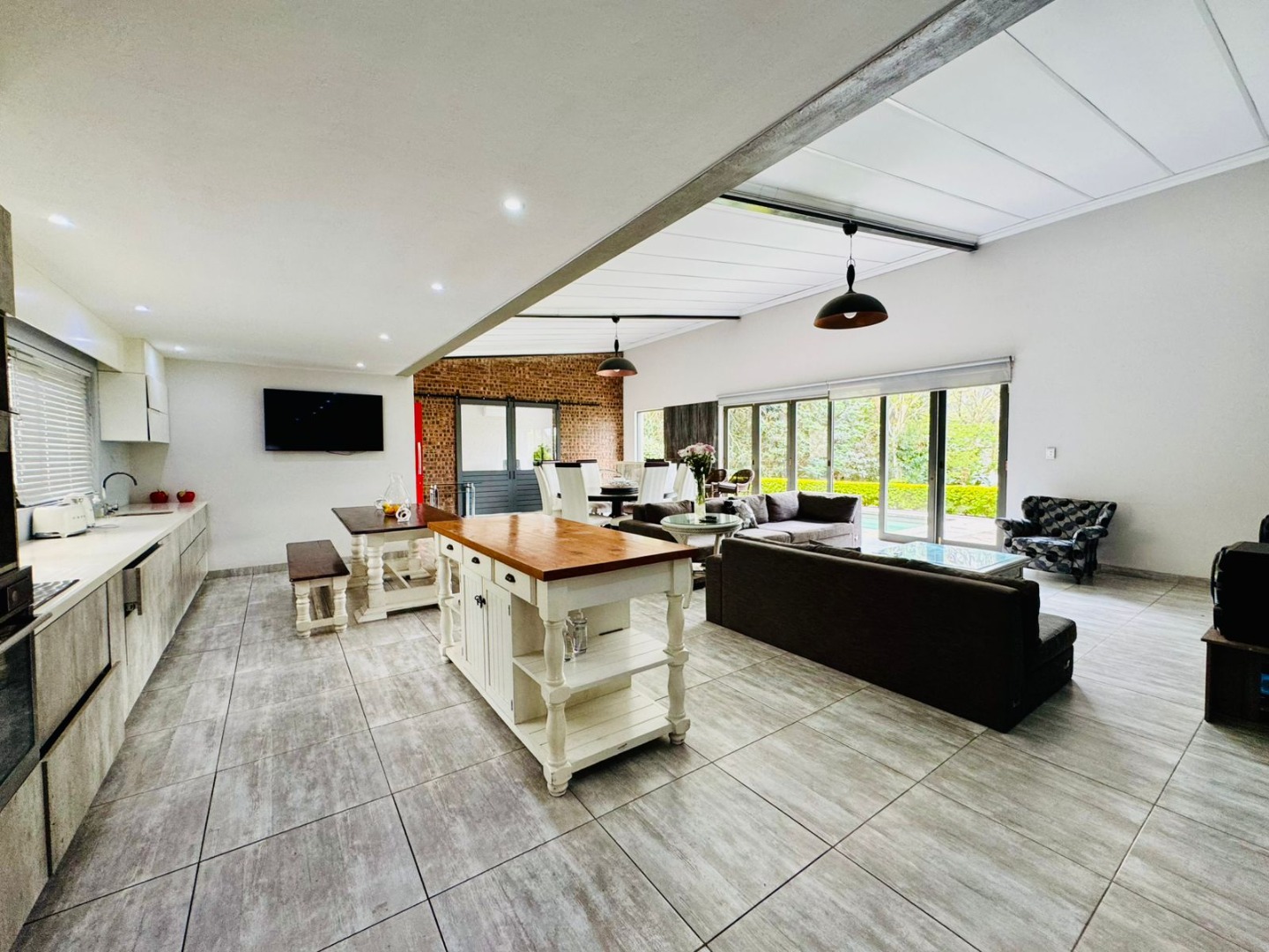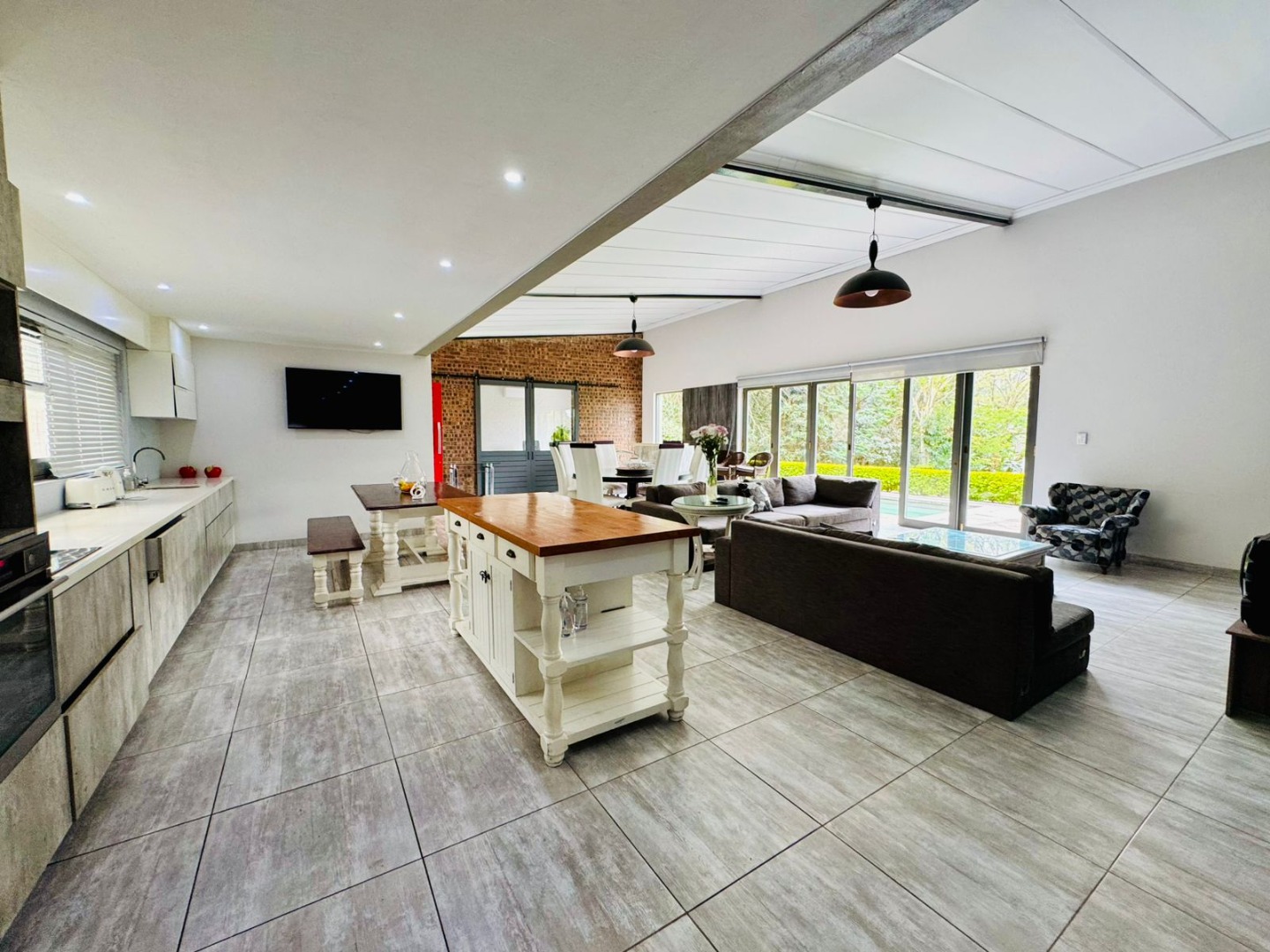 The open-plan living area forms the heart of the home, seamlessly connecting the lounge, dining room, and kitchen. Large glass doors open onto an enclosed veranda, creating an easy flow between indoor and outdoor living. Overlooking a beautifully landscaped garden, this space is ideal for both relaxed evenings and lively gatherings.
