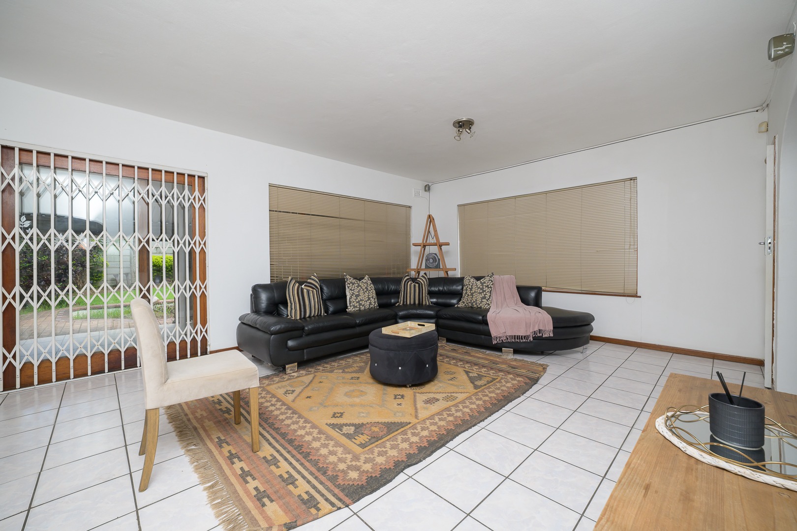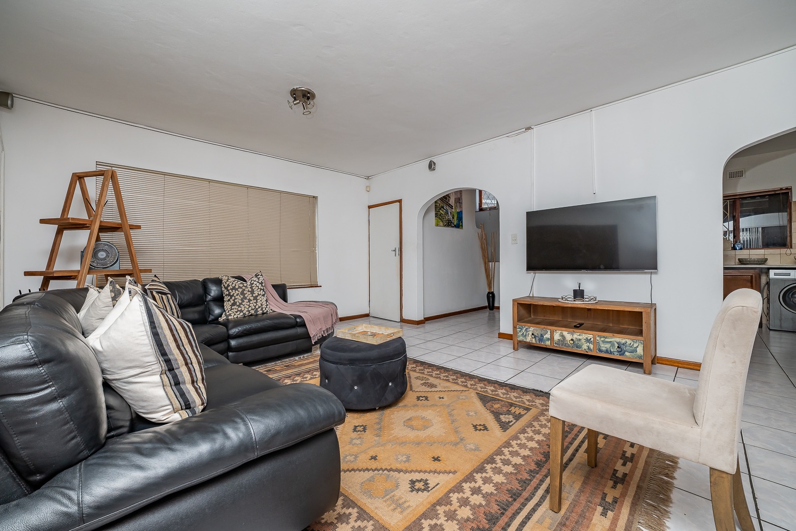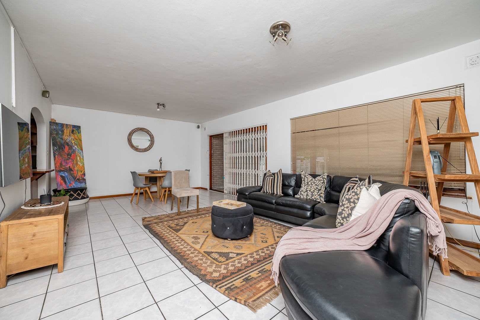 The home features a fully equipped kitchen that flows seamlessly into an open-plan lounge and dining area, creating a warm and inviting space for everyday living and entertaining. Sliding doors lead out to a covered awning fitted with wind blinds, overlooking a private garden—ideal for relaxing or hosting guests.