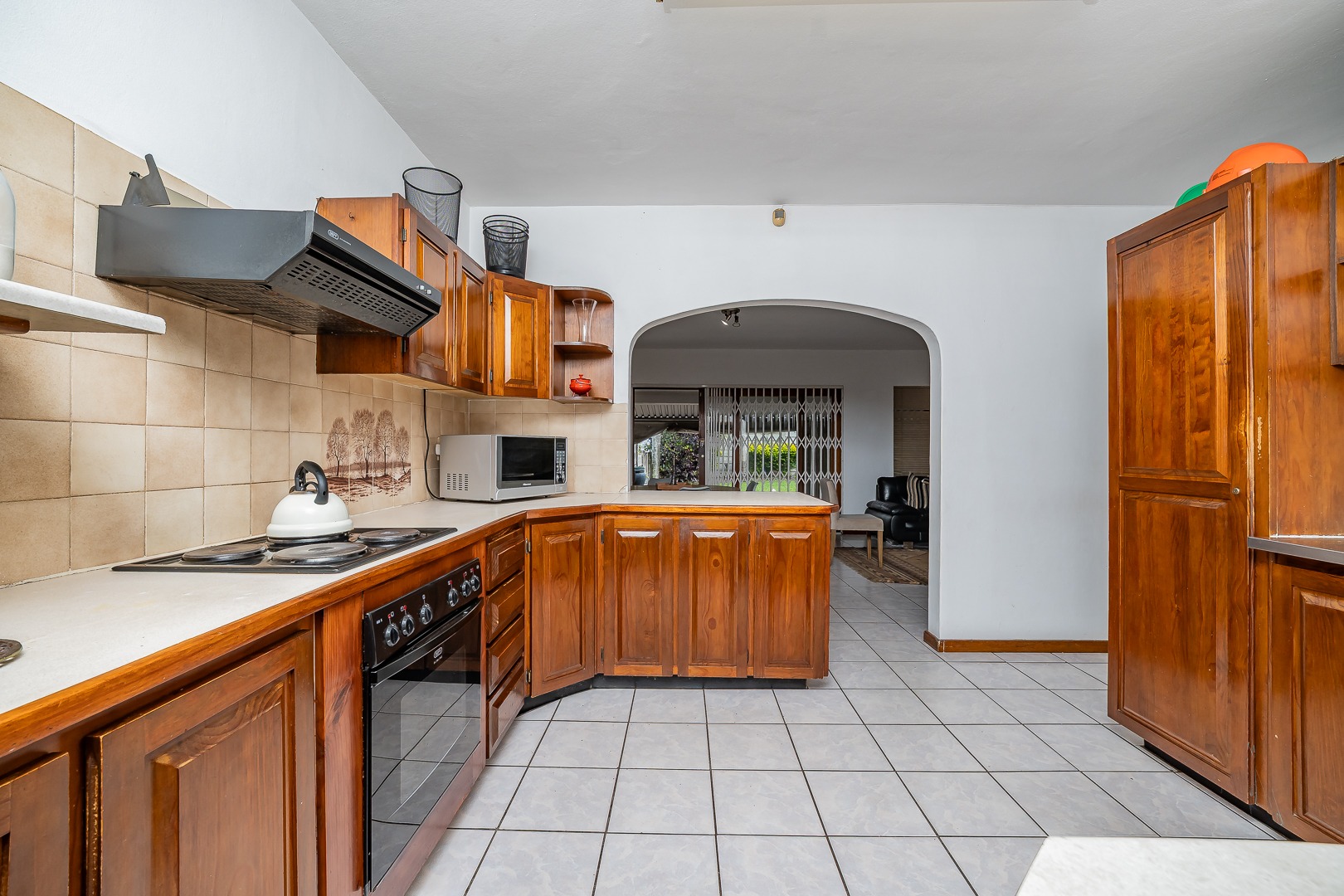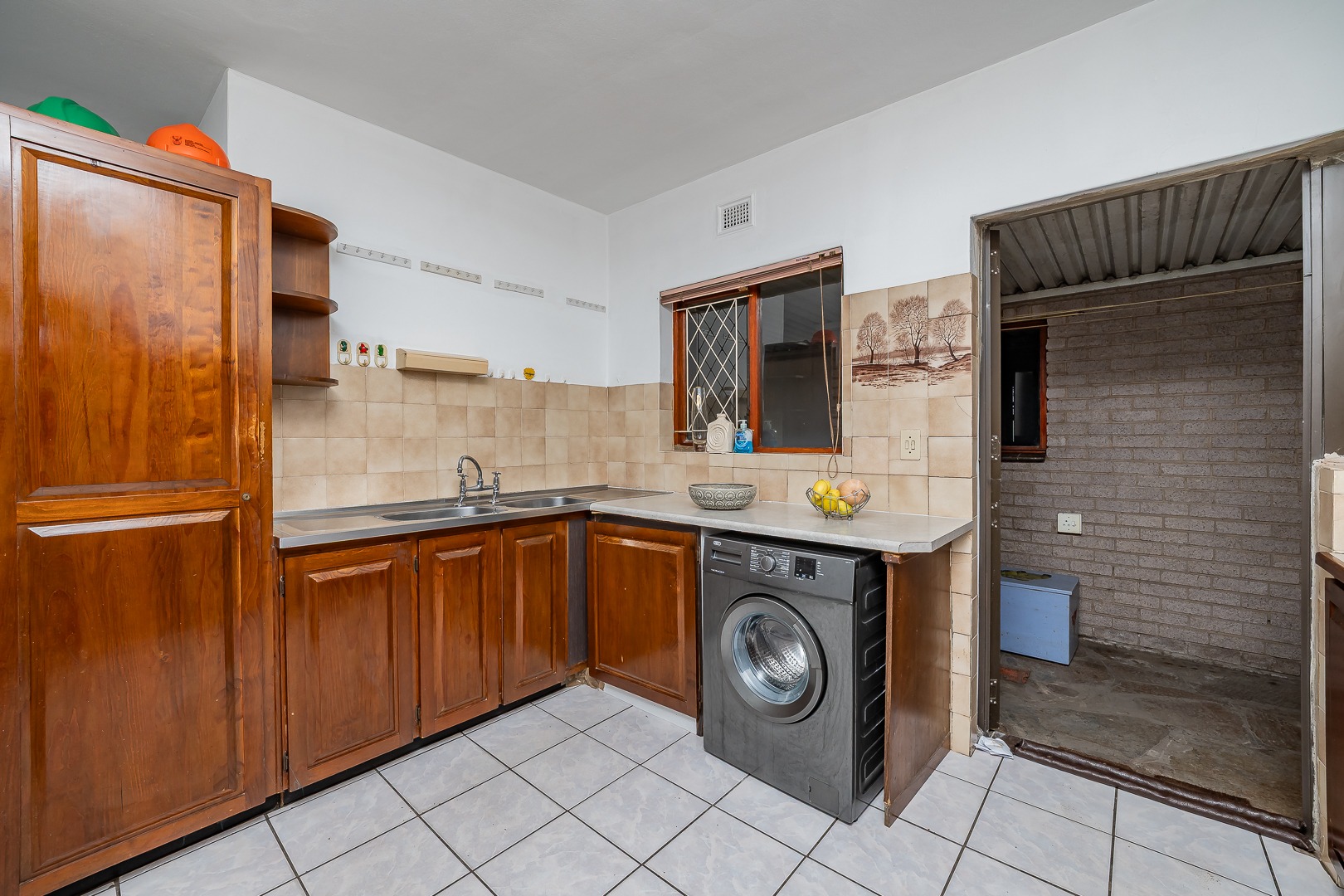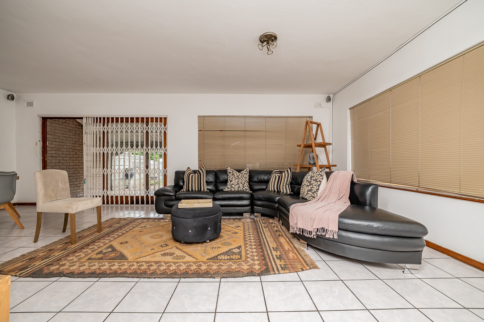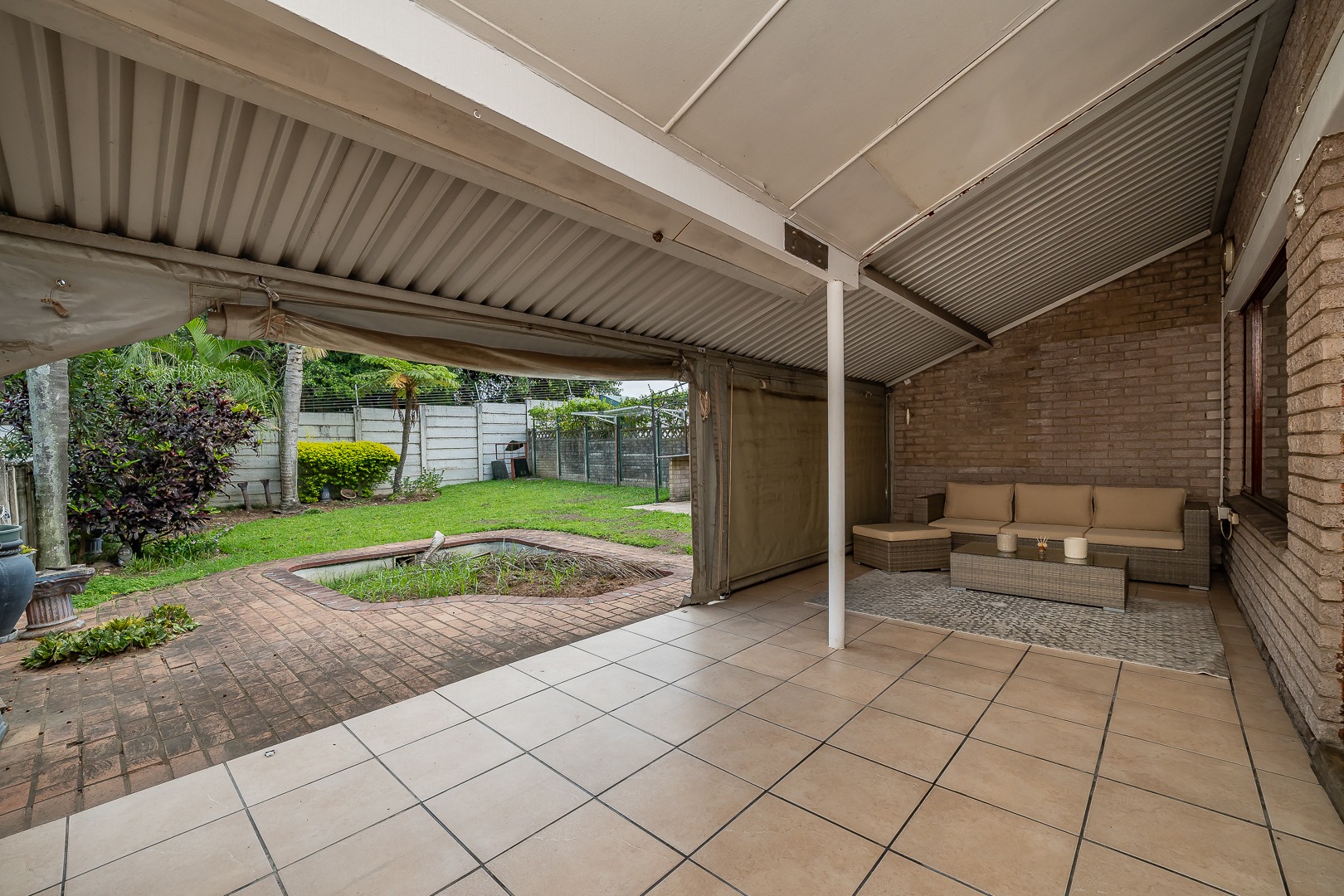 The home features a fully equipped kitchen that flows seamlessly into an open-plan lounge and dining area, creating a warm and inviting space for everyday living and entertaining. Sliding doors lead out to a covered awning fitted with wind blinds, overlooking a private garden—ideal for relaxing or hosting guests.