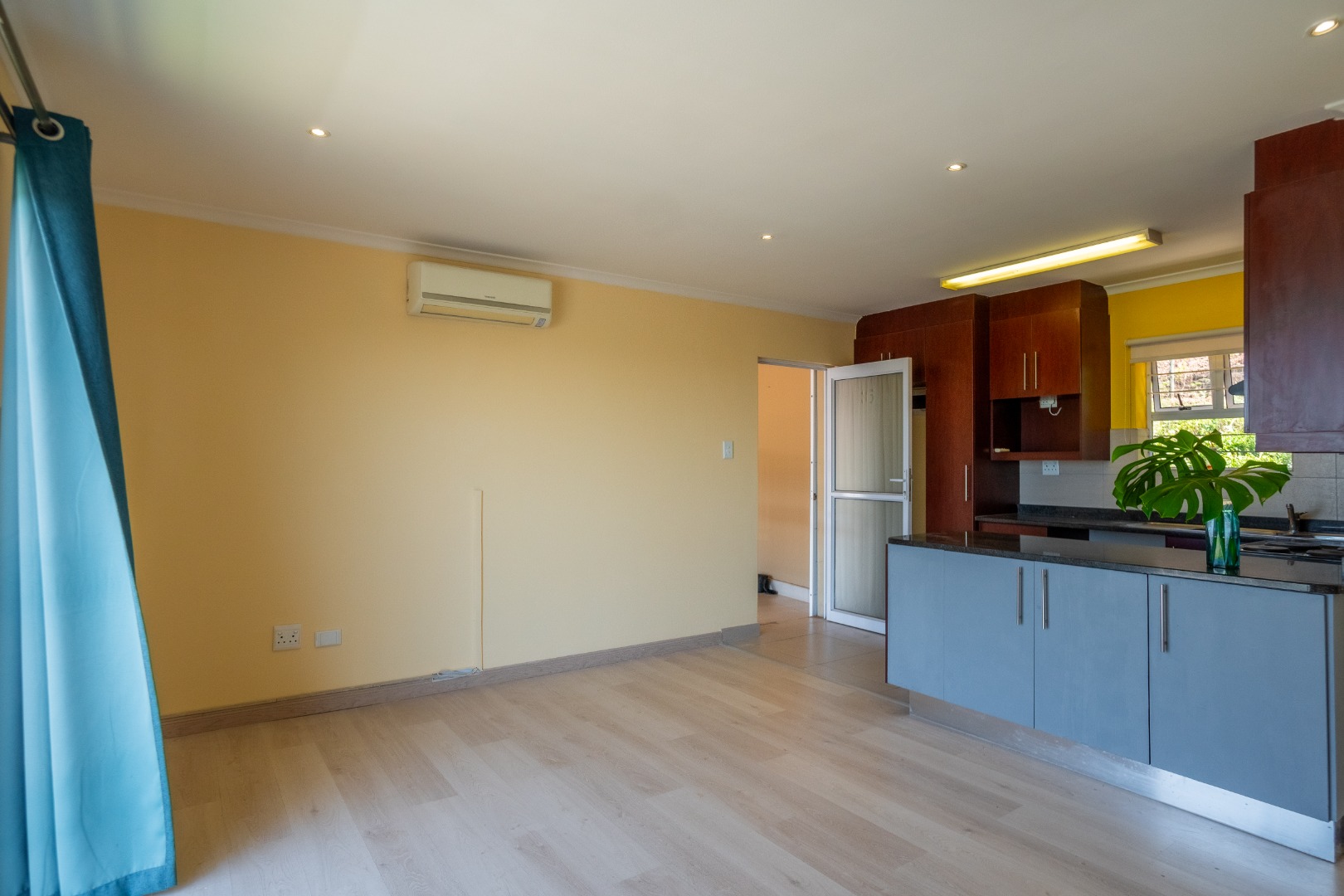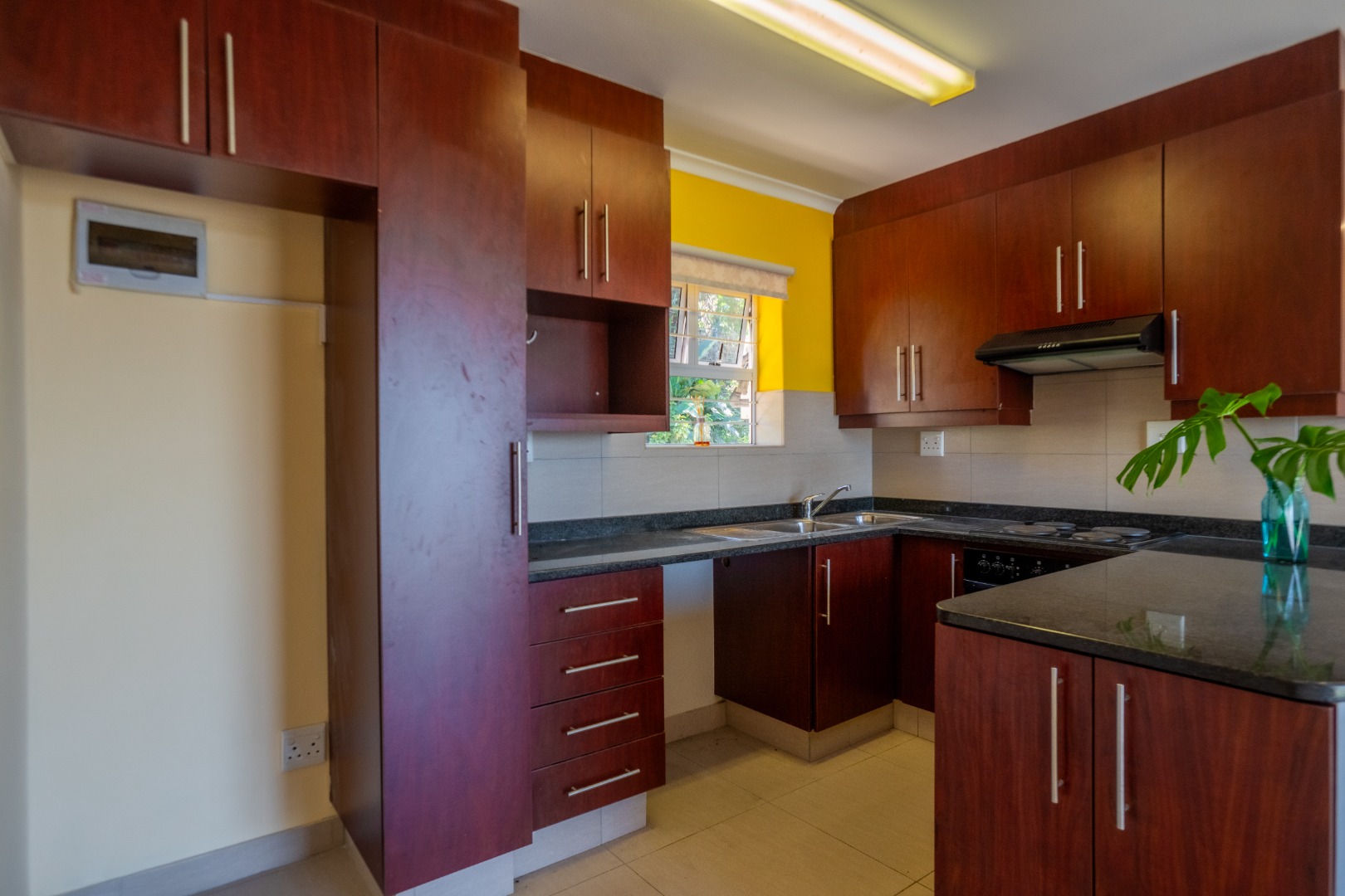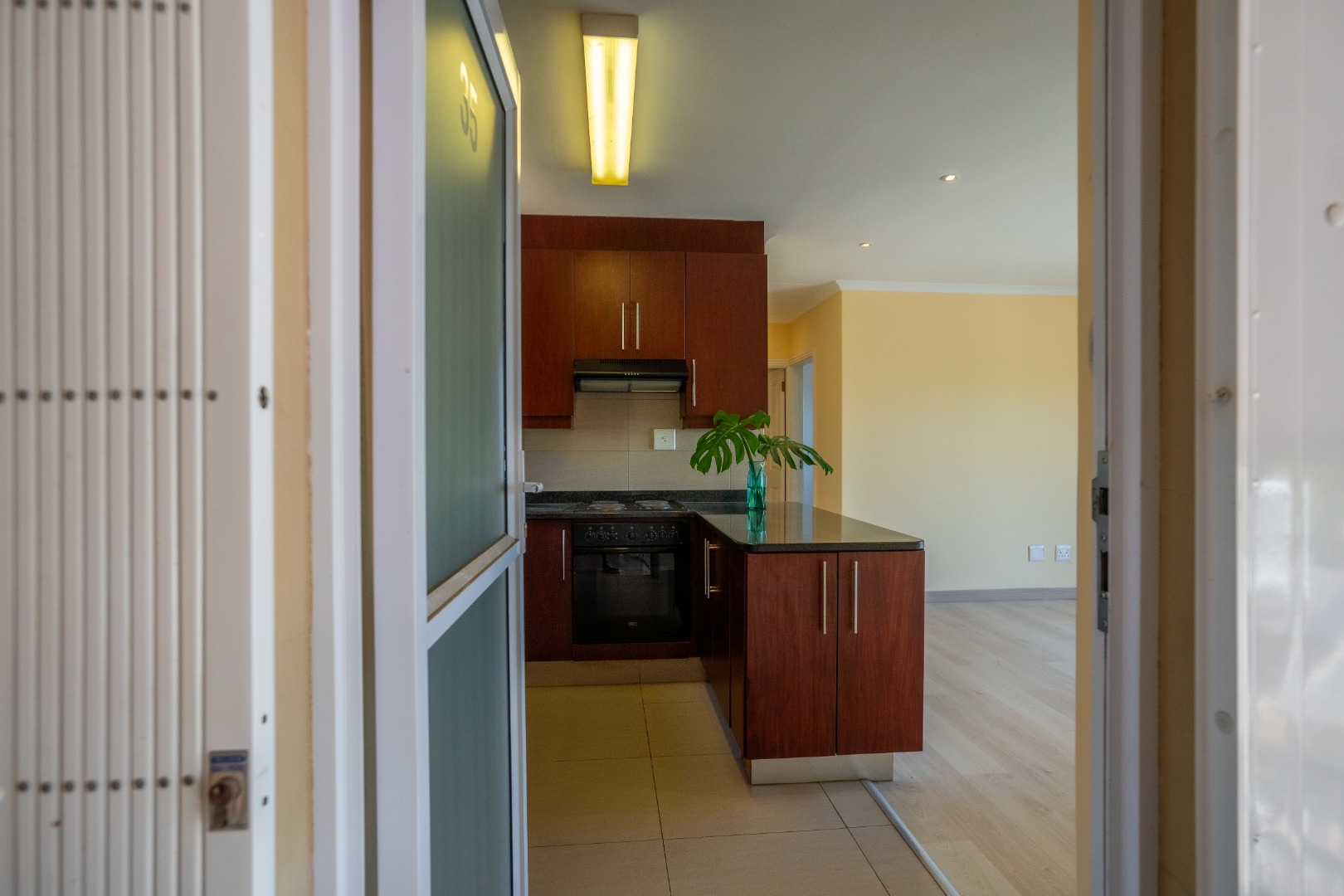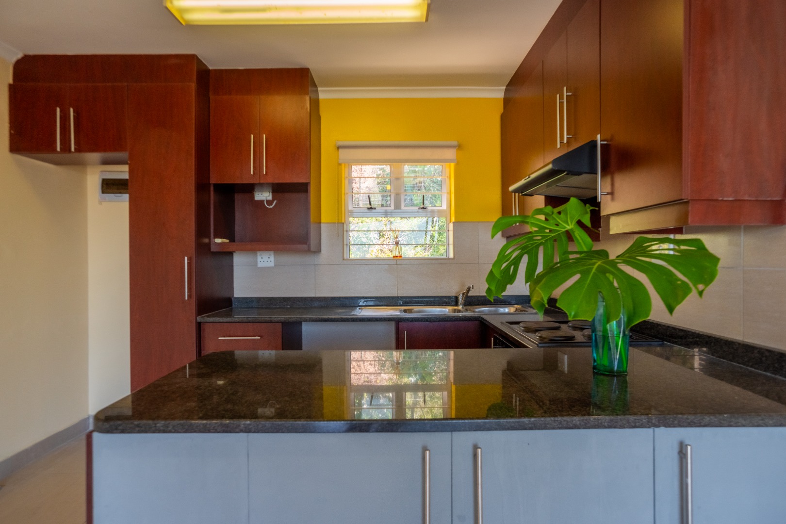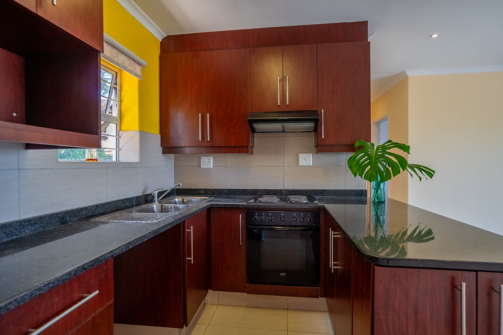 This sophisticated two-bedroom apartment, situated within a secure estate in the upper Padfield Park area, offers an exceptional rental opportunity. The interior features an open-plan living and kitchen area, meticulously designed for contemporary living. The kitchen is appointed with dark wood cabinetry, granite countertops, a built-in electric stove, an oven, and a double sink, complemented by a tiled backsplash. The living space features modern laminate flooring, recessed ceiling lights, and an air conditioning unit, ensuring year-round comfort.