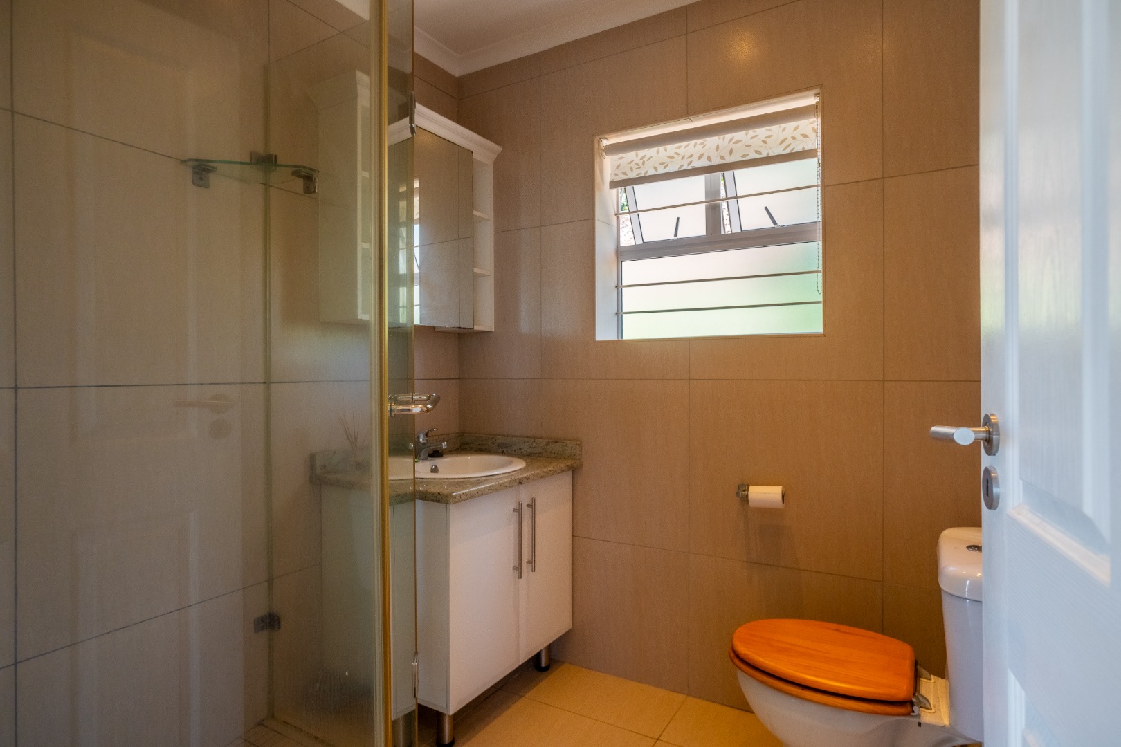 The residence comprises two well-proportioned bedrooms, each featuring built-in cupboards and ample natural light, with one room including a ceiling fan. The bathroom is fully tiled, presenting a clean aesthetic with a glass-enclosed shower, a vanity with a granite countertop, and a mirrored wall cabinet. A private balcony, accessible via large sliding glass doors from the living area, offers scenic views and an ideal space for relaxation.