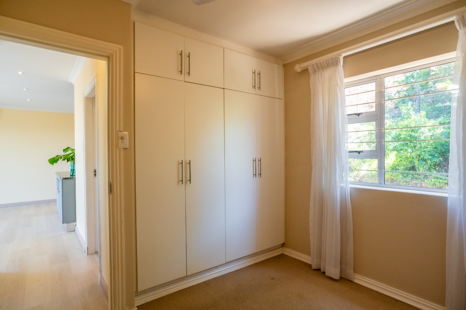 This sophisticated two-bedroom apartment, situated within a secure estate in the upper Padfield Park area, offers an exceptional rental opportunity. The interior features an open-plan living and kitchen area, meticulously designed for contemporary living. The kitchen is appointed with dark wood cabinetry, granite countertops, a built-in electric stove, an oven, and a double sink, complemented by a tiled backsplash. The living space features modern laminate flooring, recessed ceiling lights, and an air conditioning unit, ensuring year-round comfort.